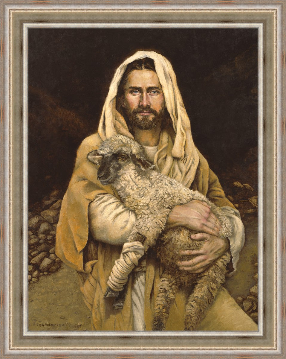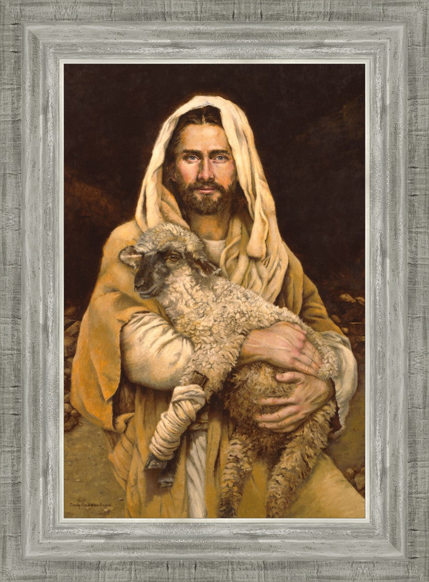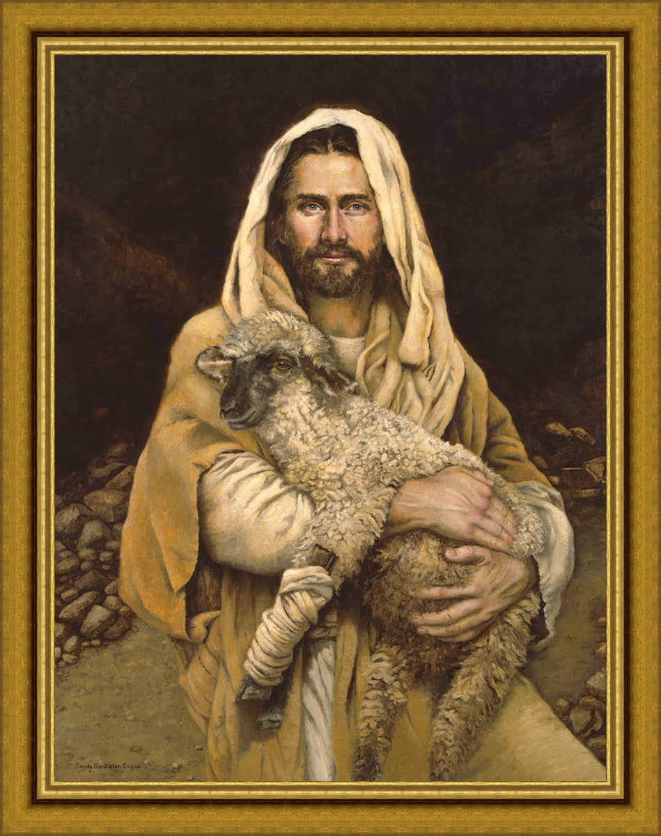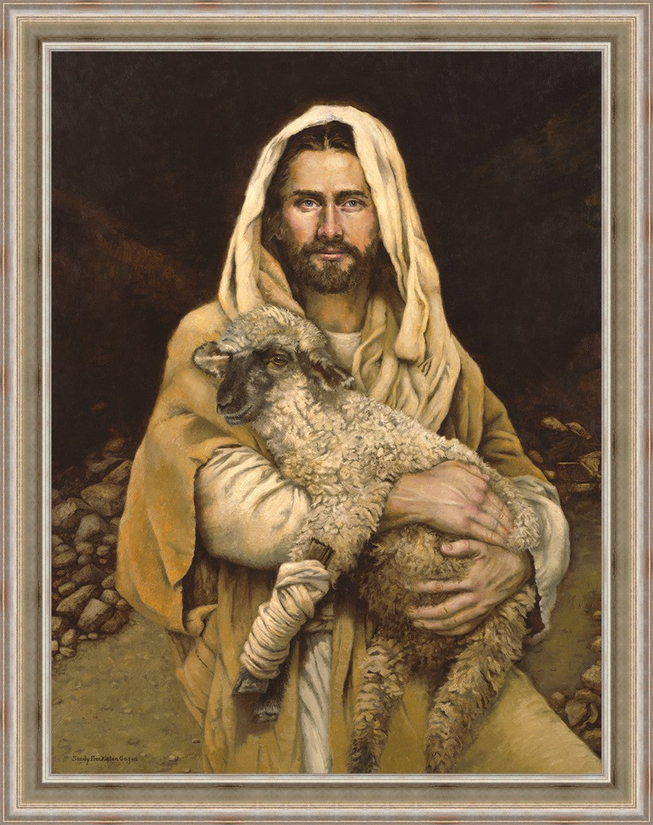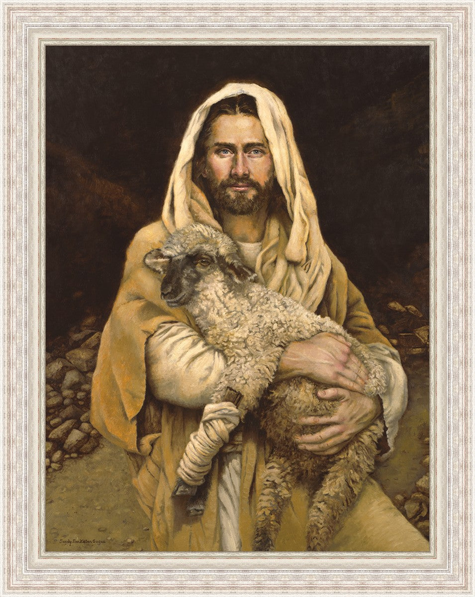 "Bind Up The Broken Hearted" by Sandy Freckleton Gagon is a watercolor painting capturing Jesus tenderly holding a lamb against a backdrop of rocks and a dark brown background.