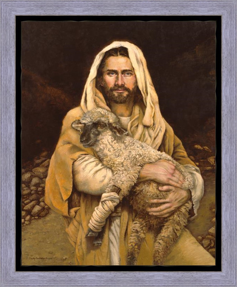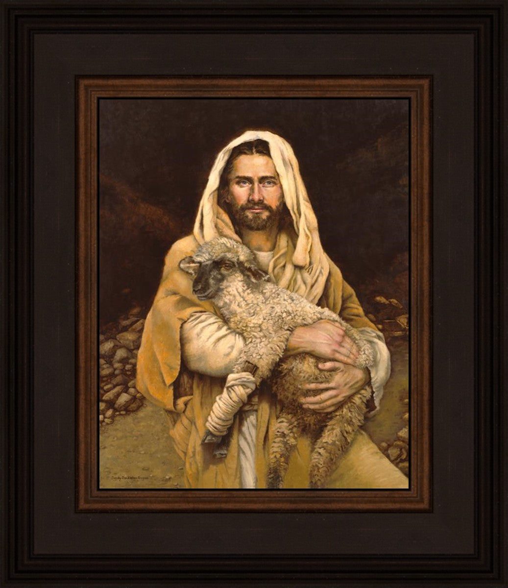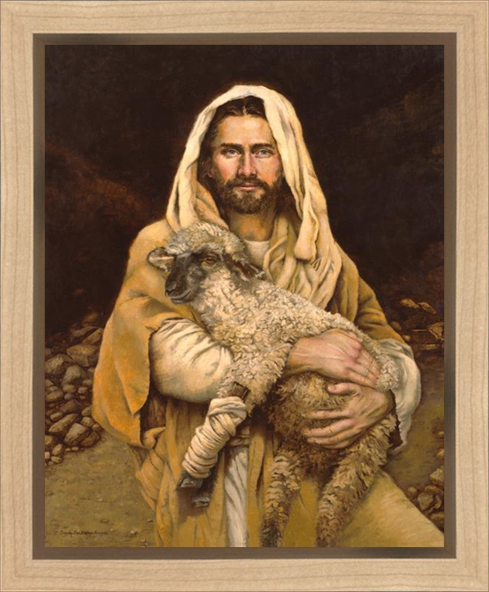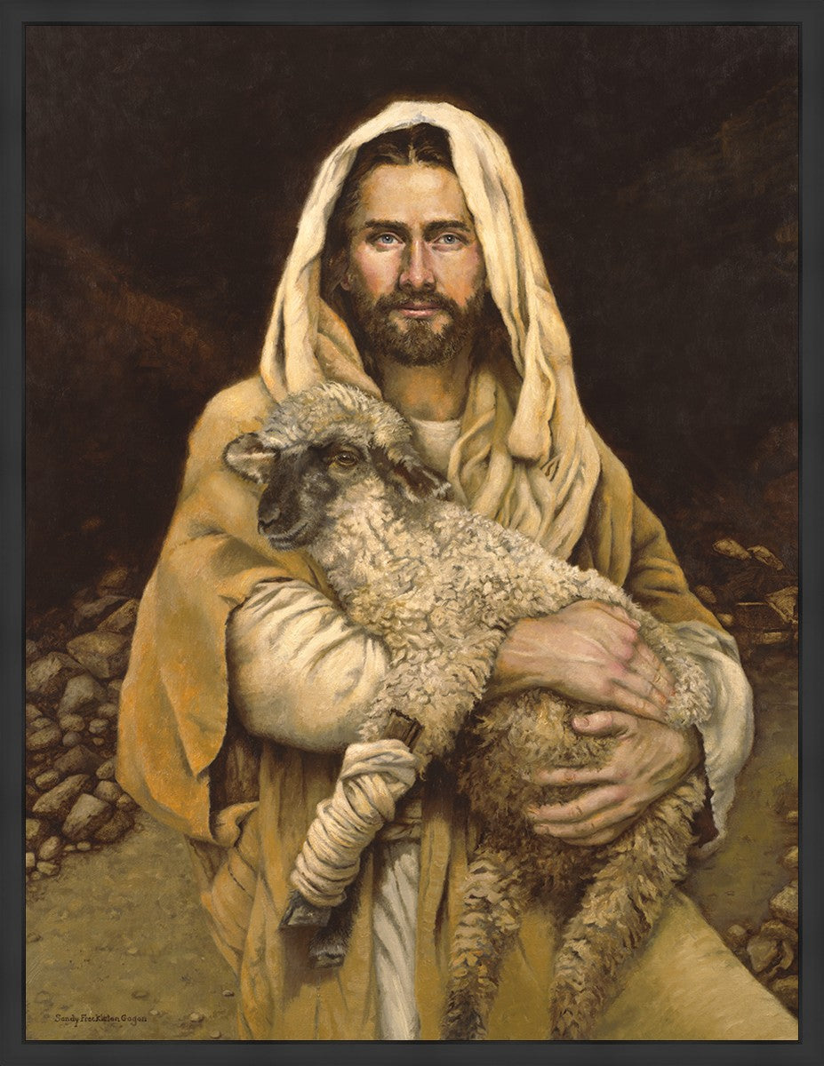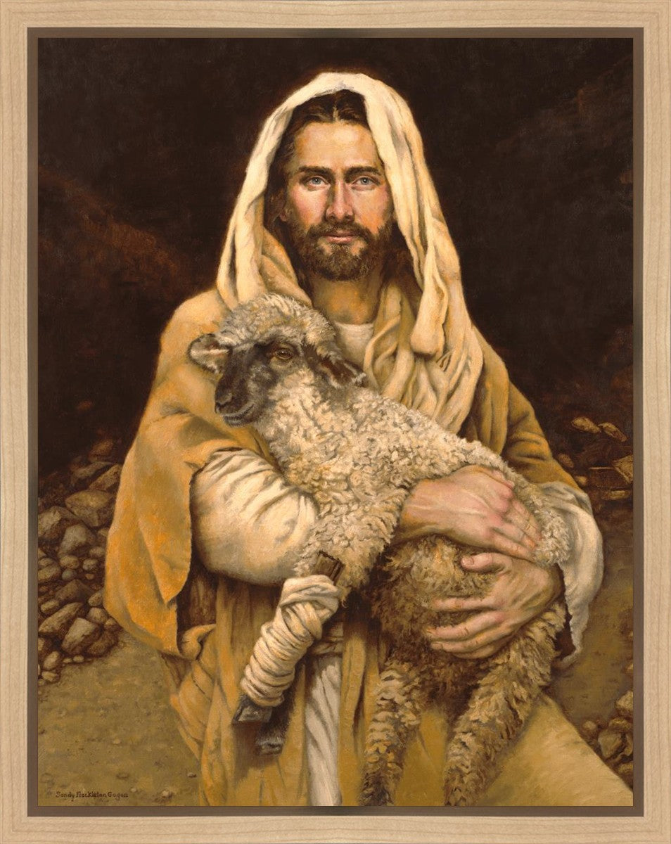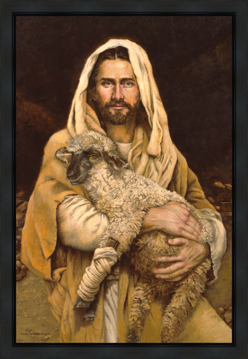 "Bind Up The Broken Hearted" by Sandy Freckleton Gagon is a watercolor painting capturing Jesus tenderly holding a lamb against a backdrop of rocks and a dark brown background.