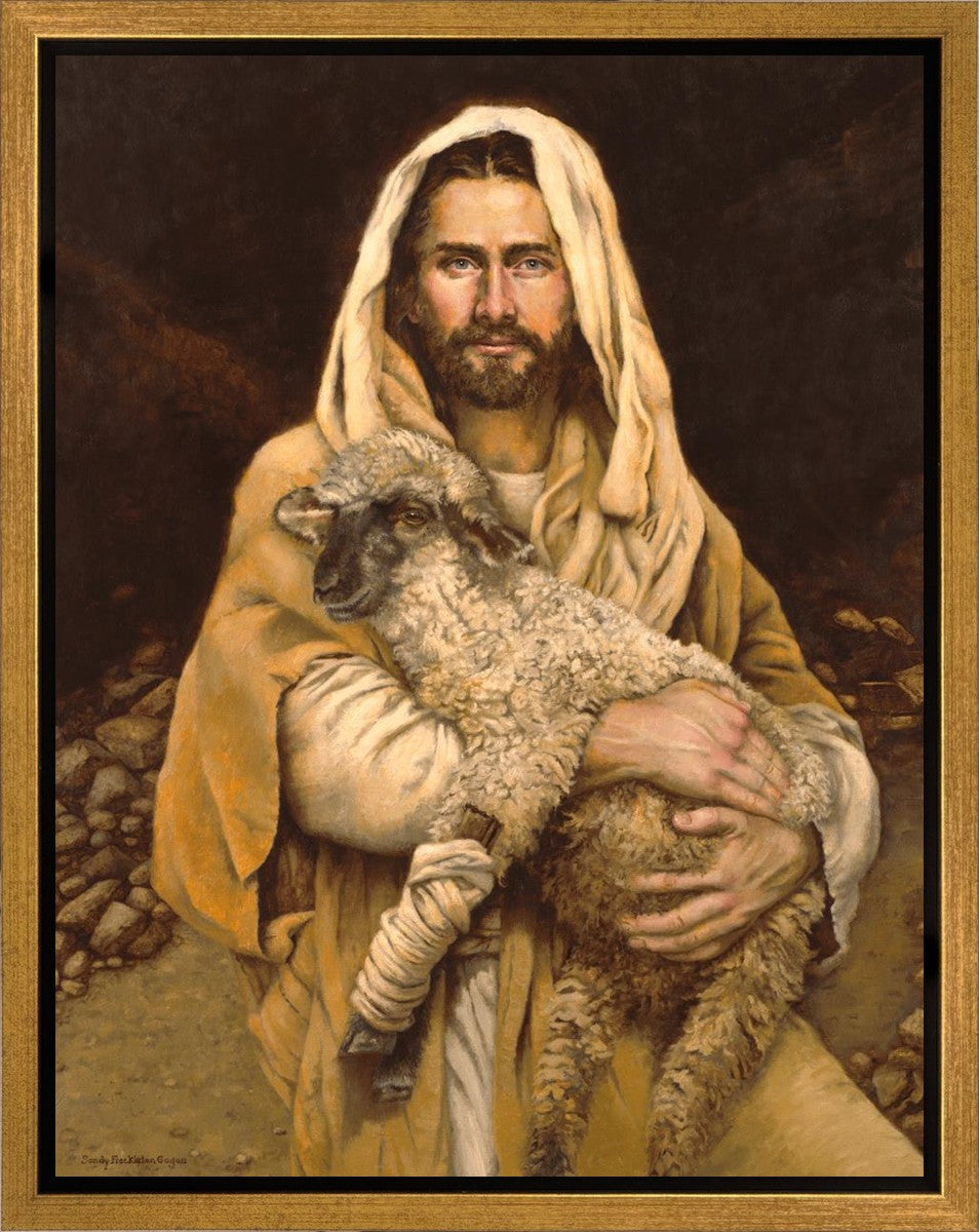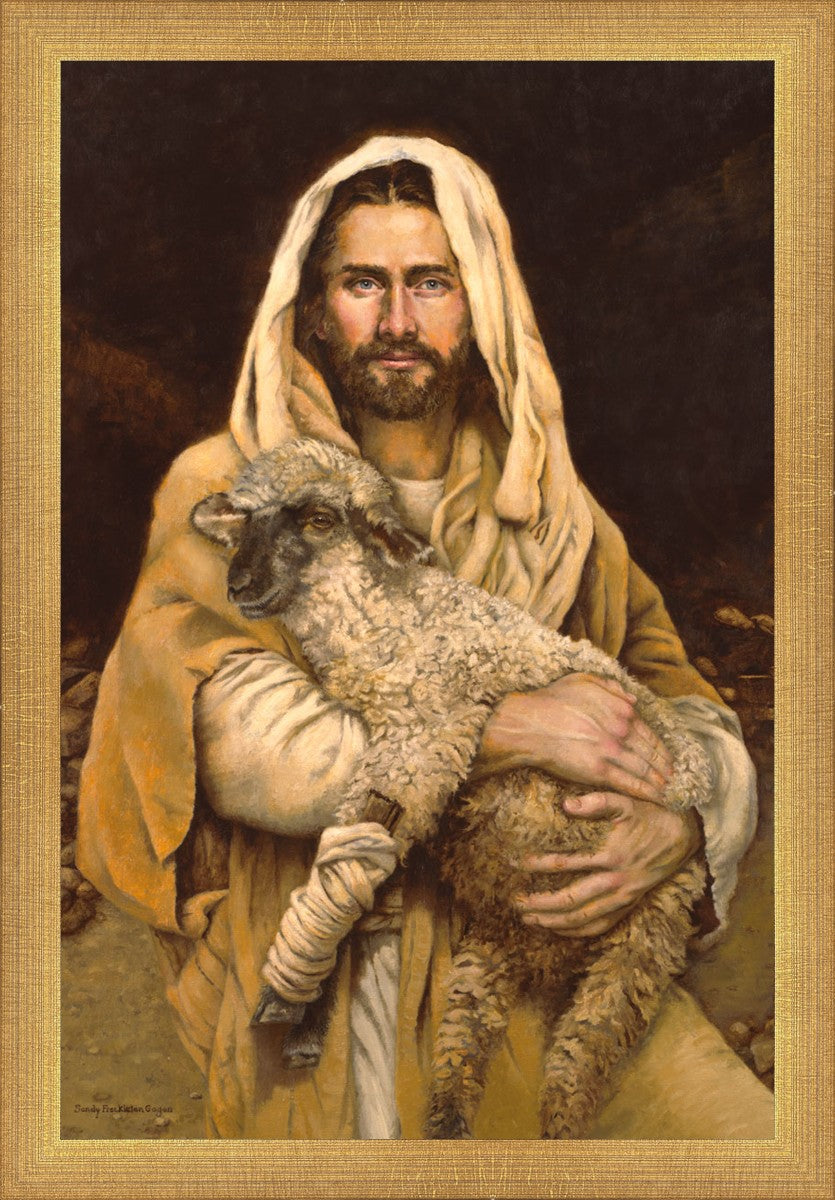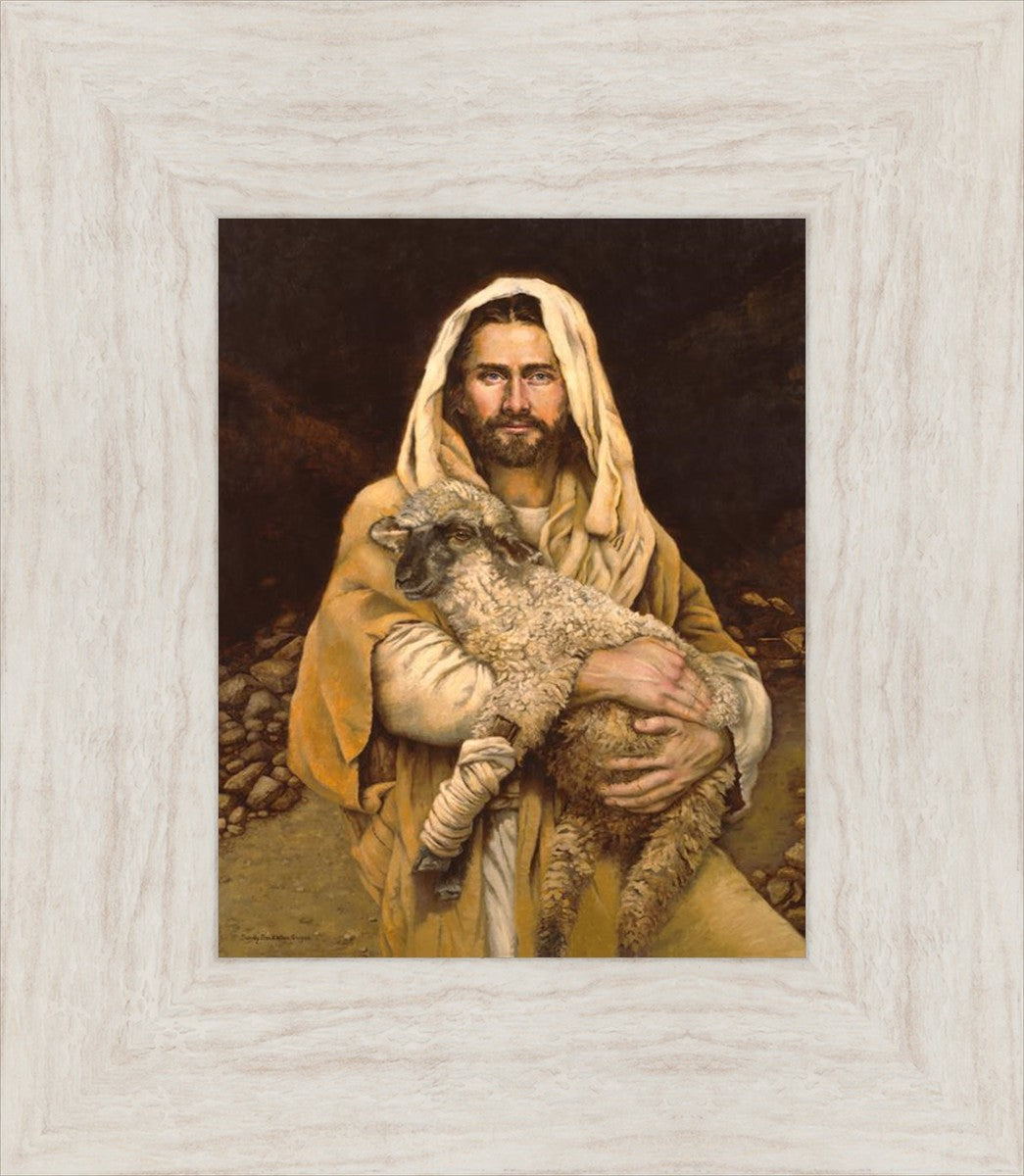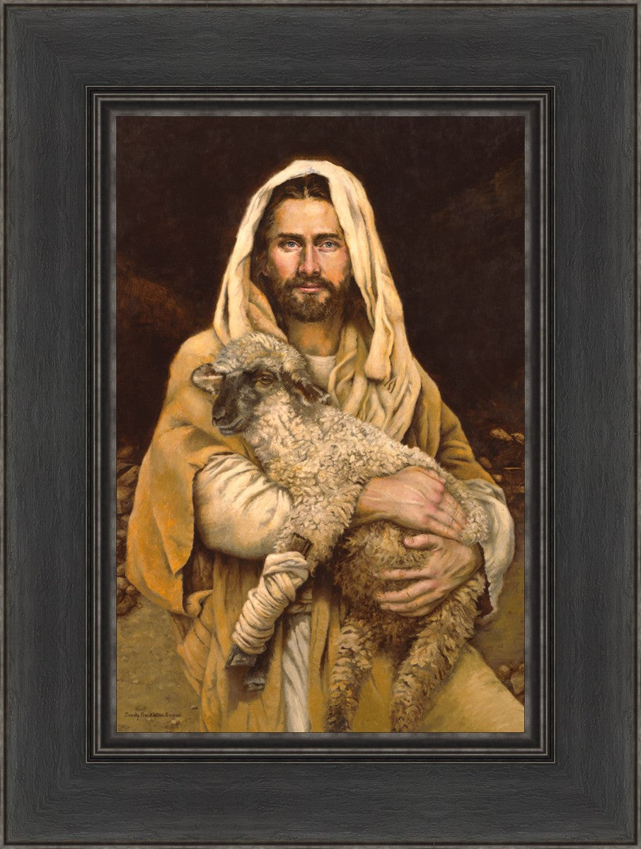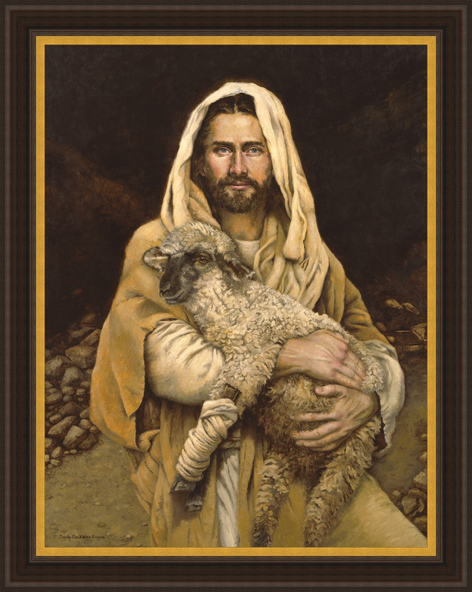 "Bind Up The Broken Hearted" by Sandy Freckleton Gagon is a watercolor painting capturing Jesus tenderly holding a lamb against a backdrop of rocks and a dark brown background.