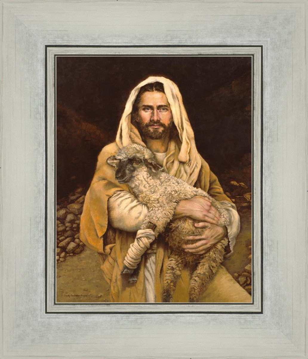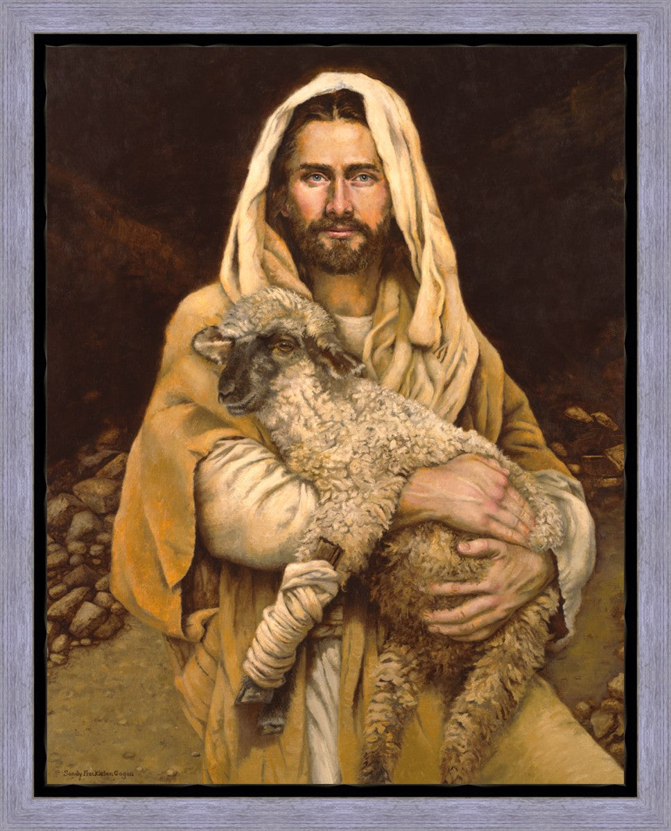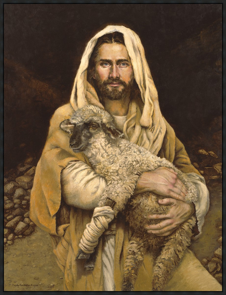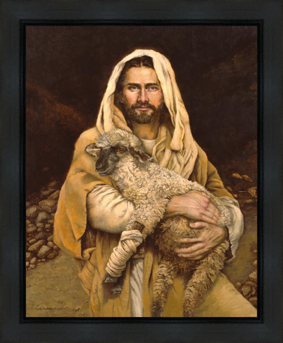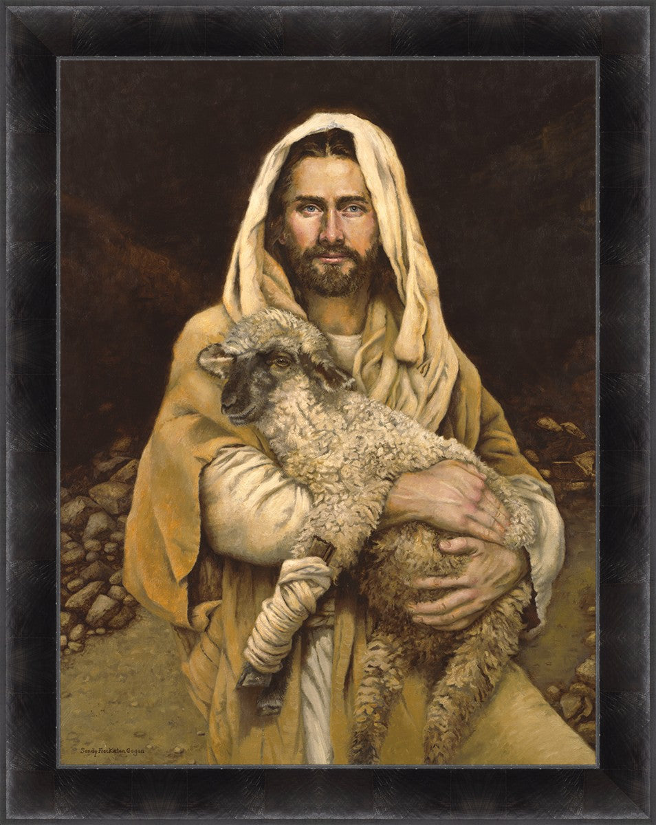 "Bind Up The Broken Hearted" by Sandy Freckleton Gagon is a watercolor painting capturing Jesus tenderly holding a lamb against a backdrop of rocks and a dark brown background.