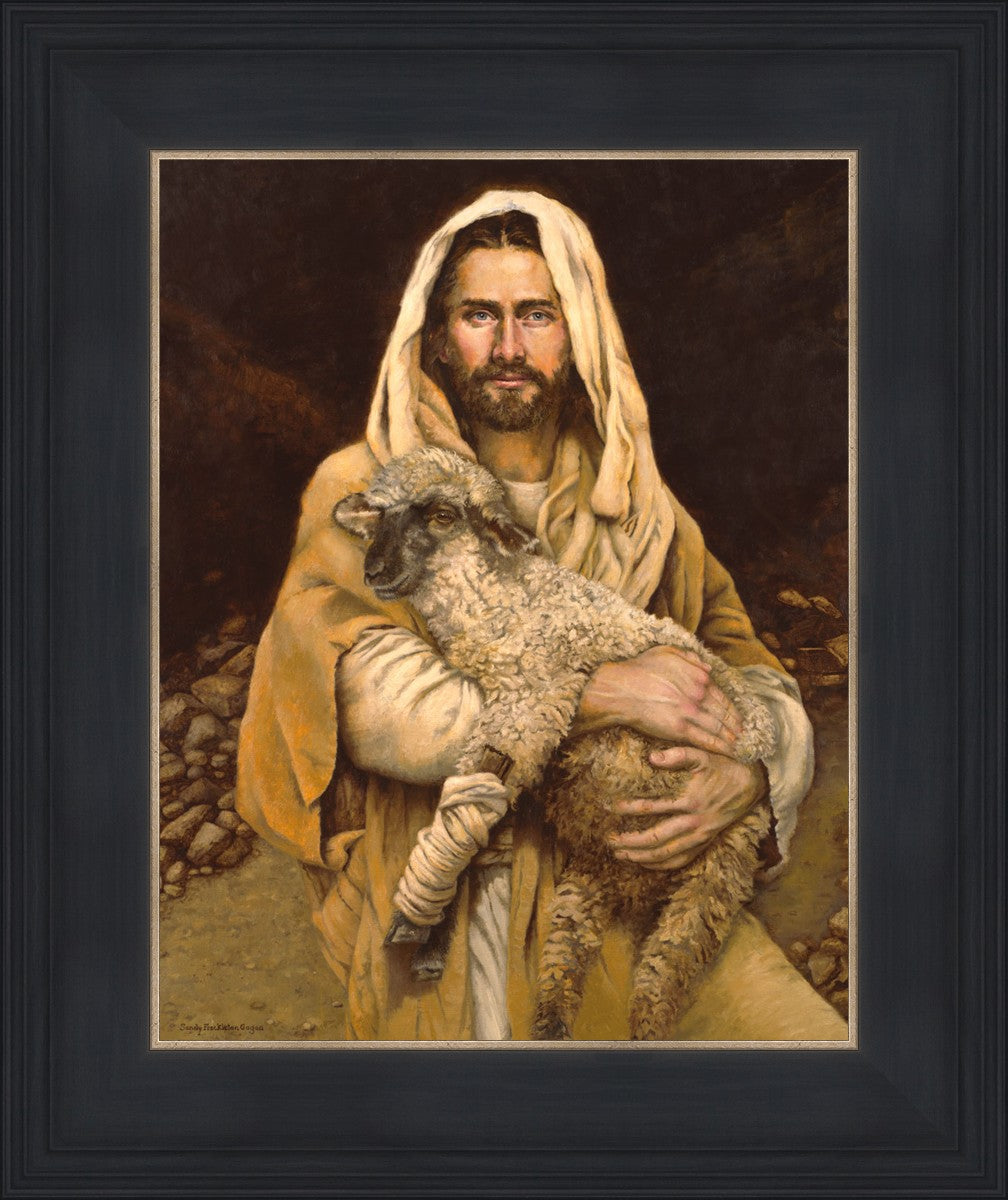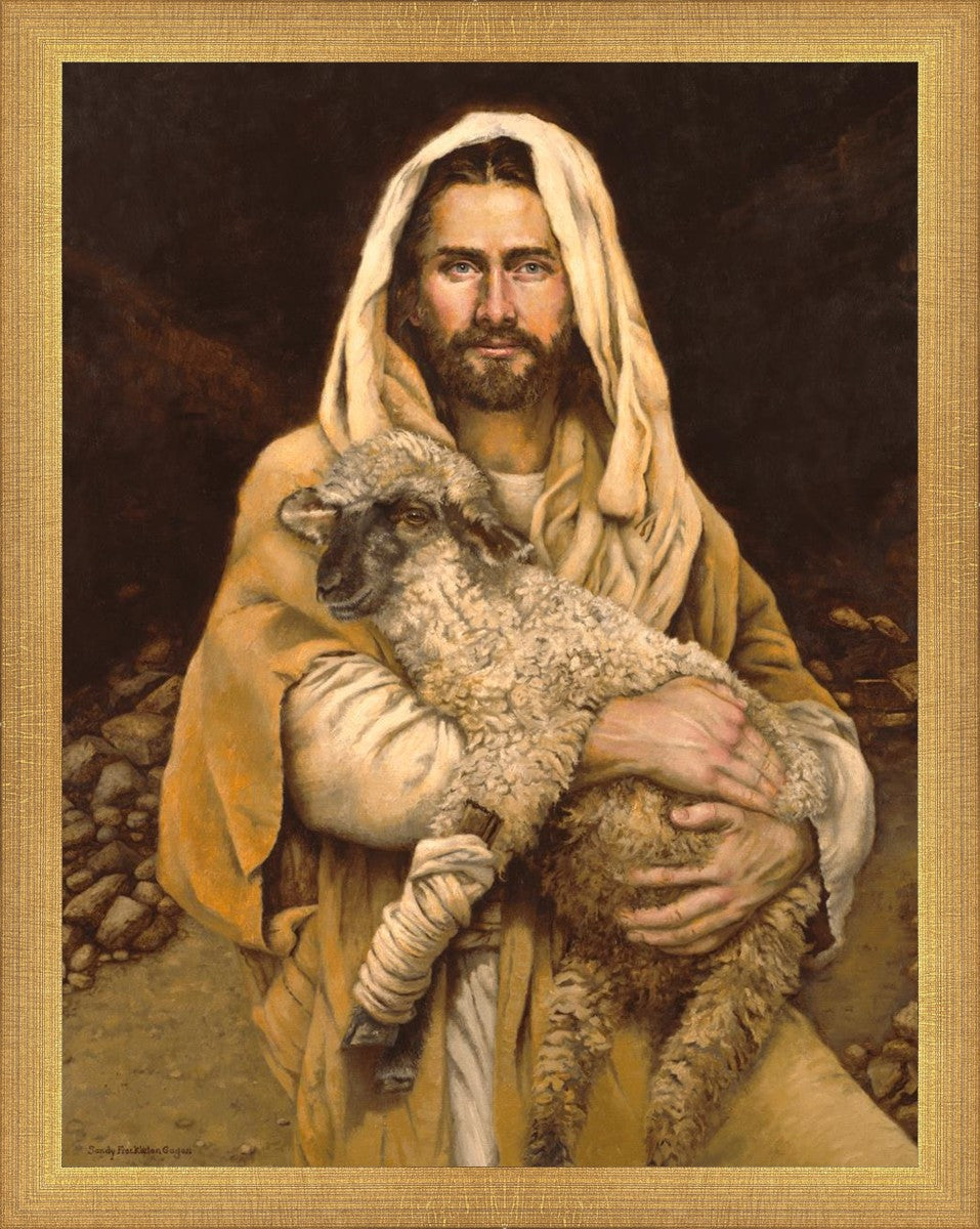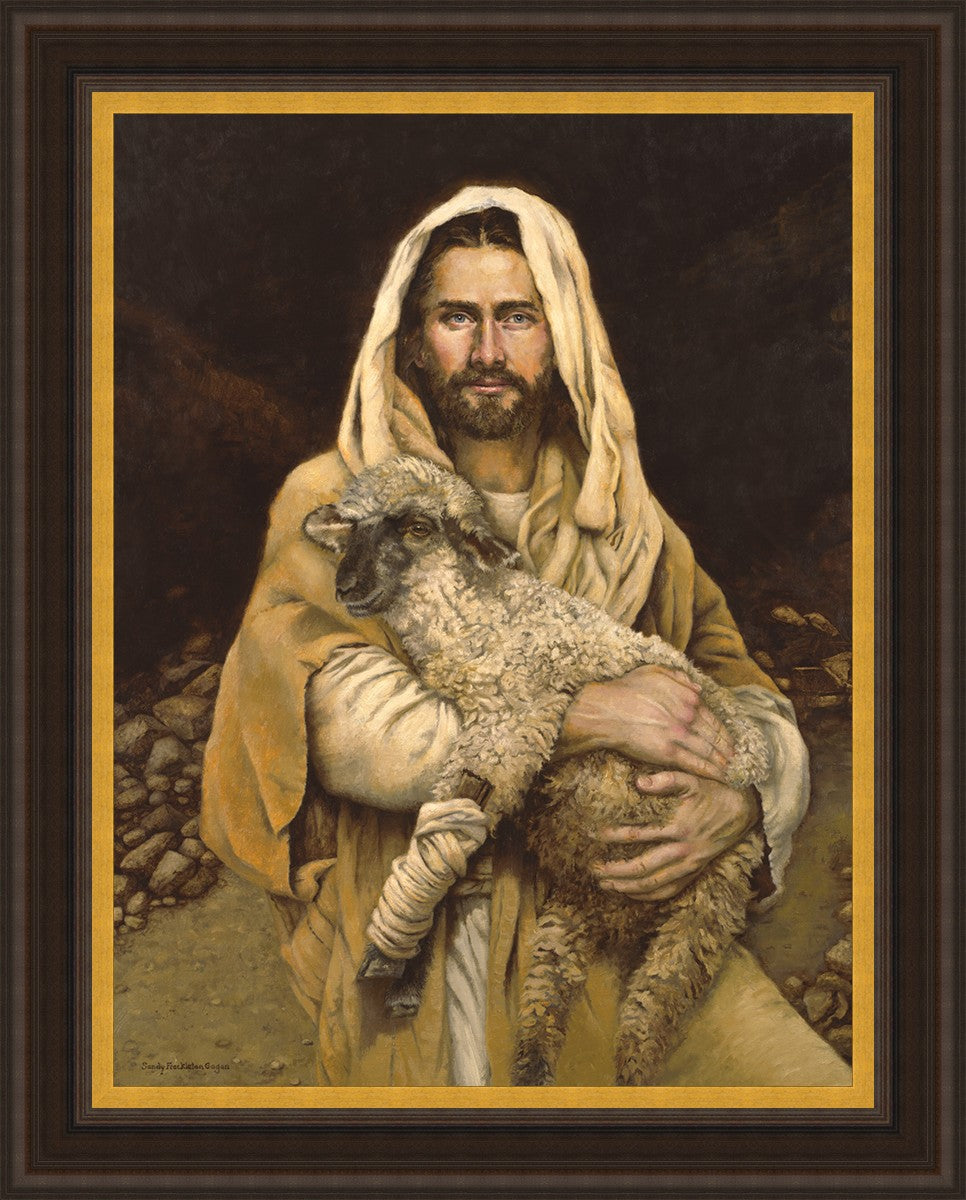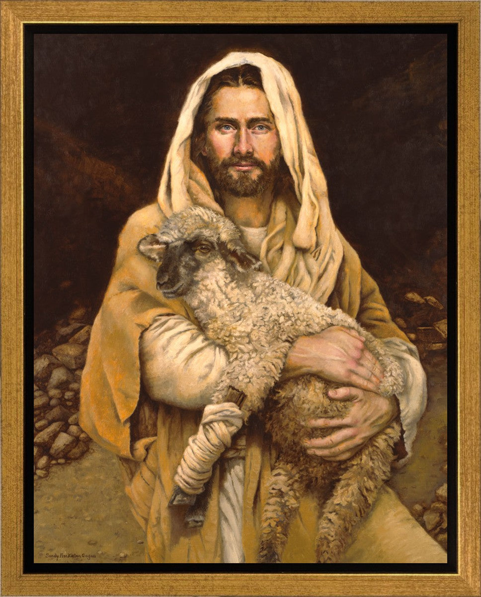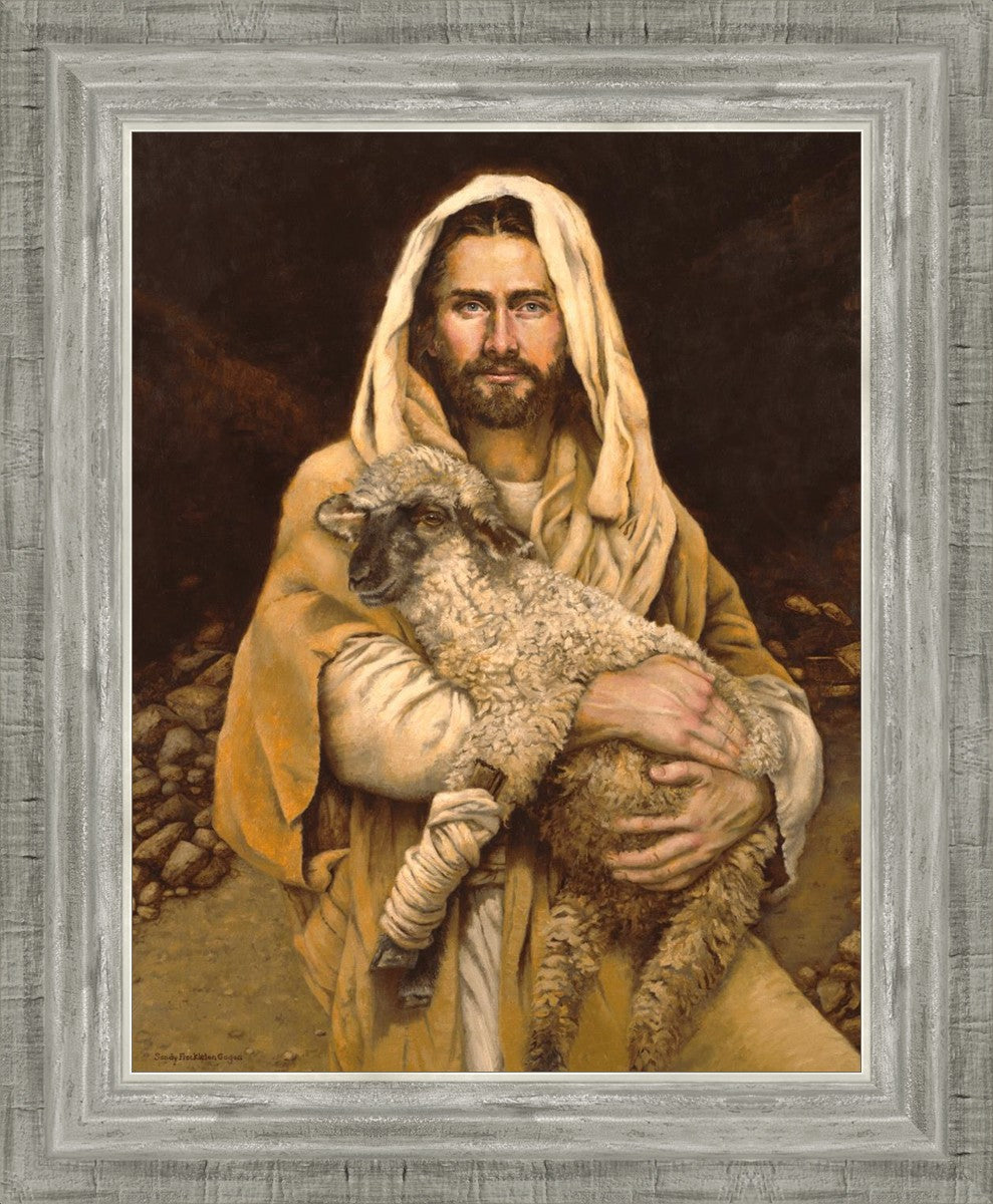 "Bind Up The Broken Hearted" by Sandy Freckleton Gagon is a watercolor painting capturing Jesus tenderly holding a lamb against a backdrop of rocks and a dark brown background.