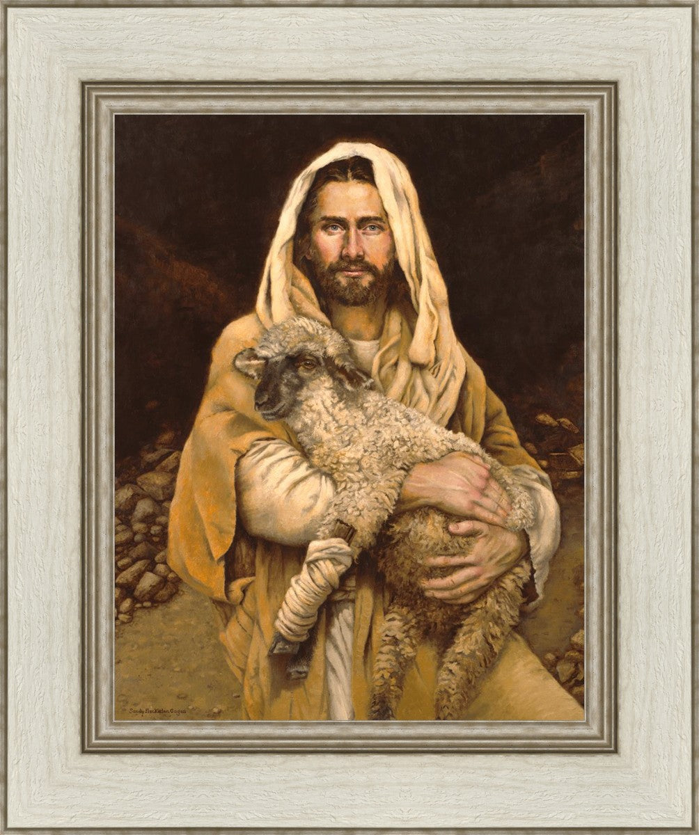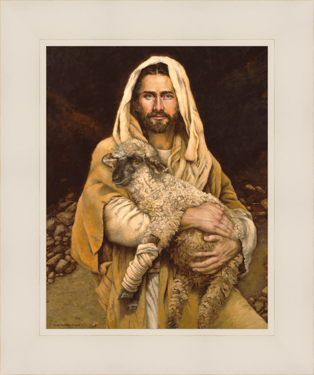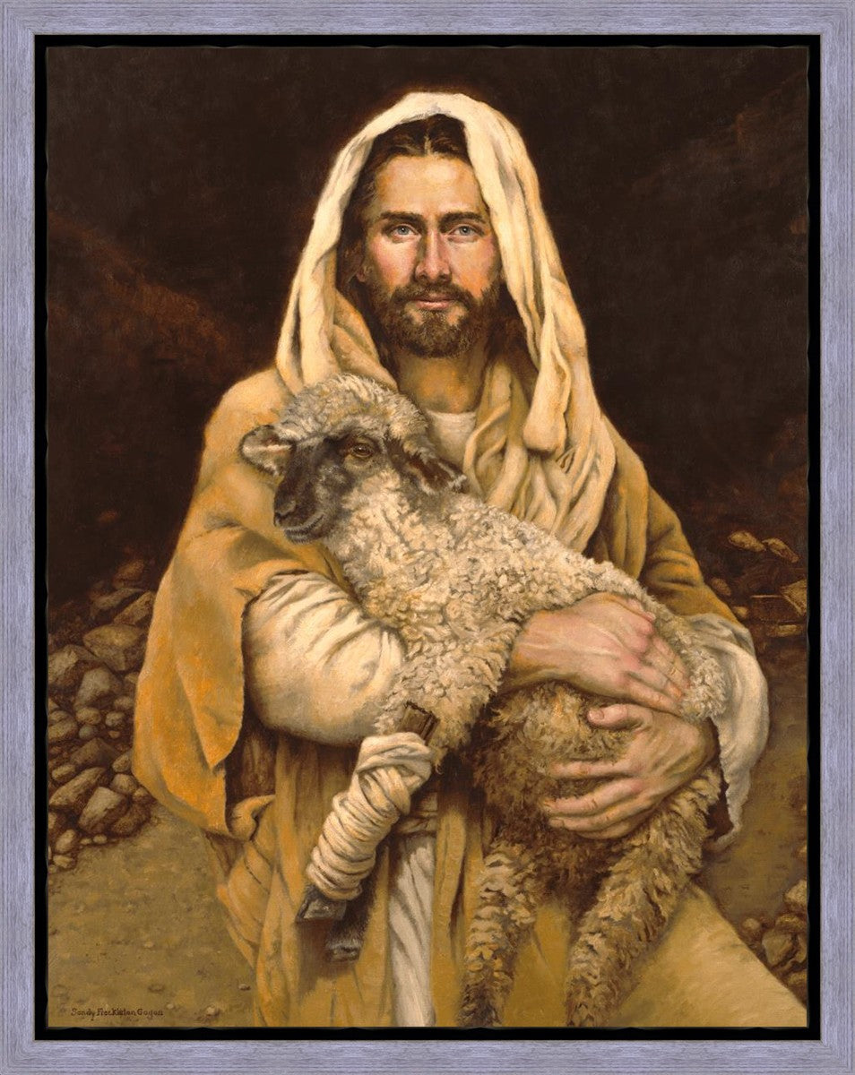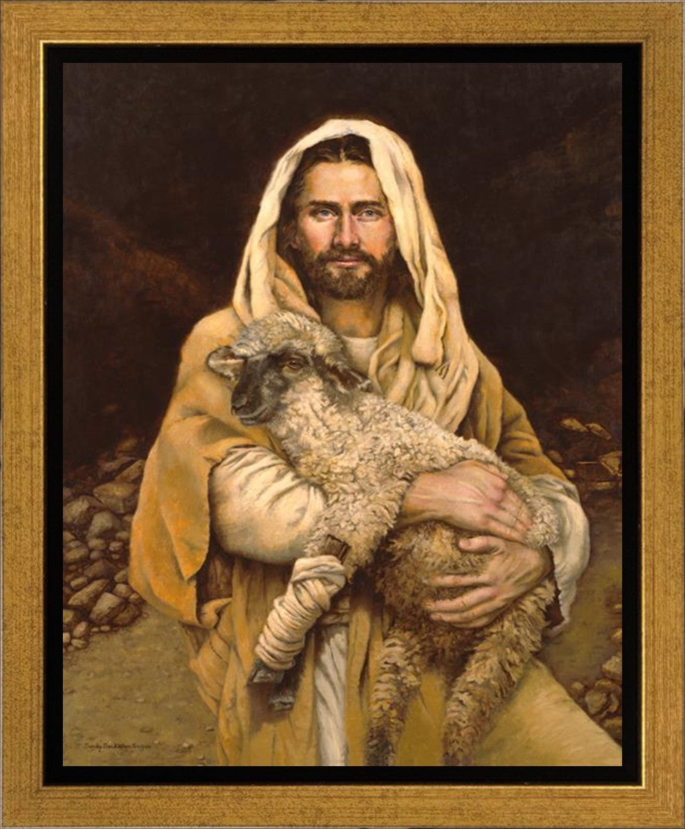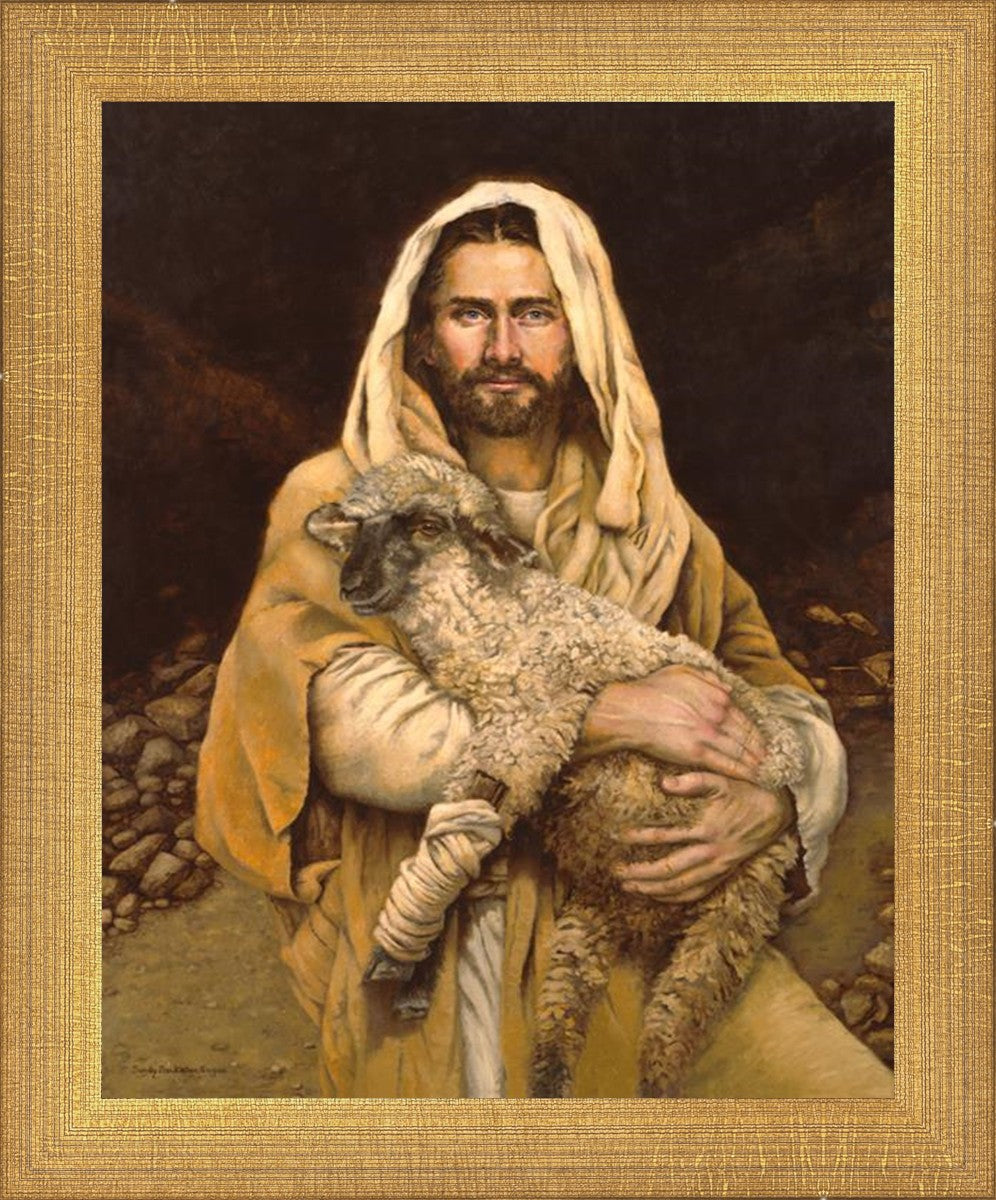 "Bind Up The Broken Hearted" by Sandy Freckleton Gagon is a watercolor painting capturing Jesus tenderly holding a lamb against a backdrop of rocks and a dark brown background.