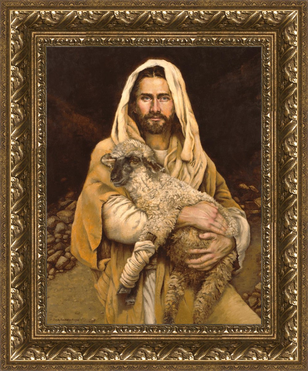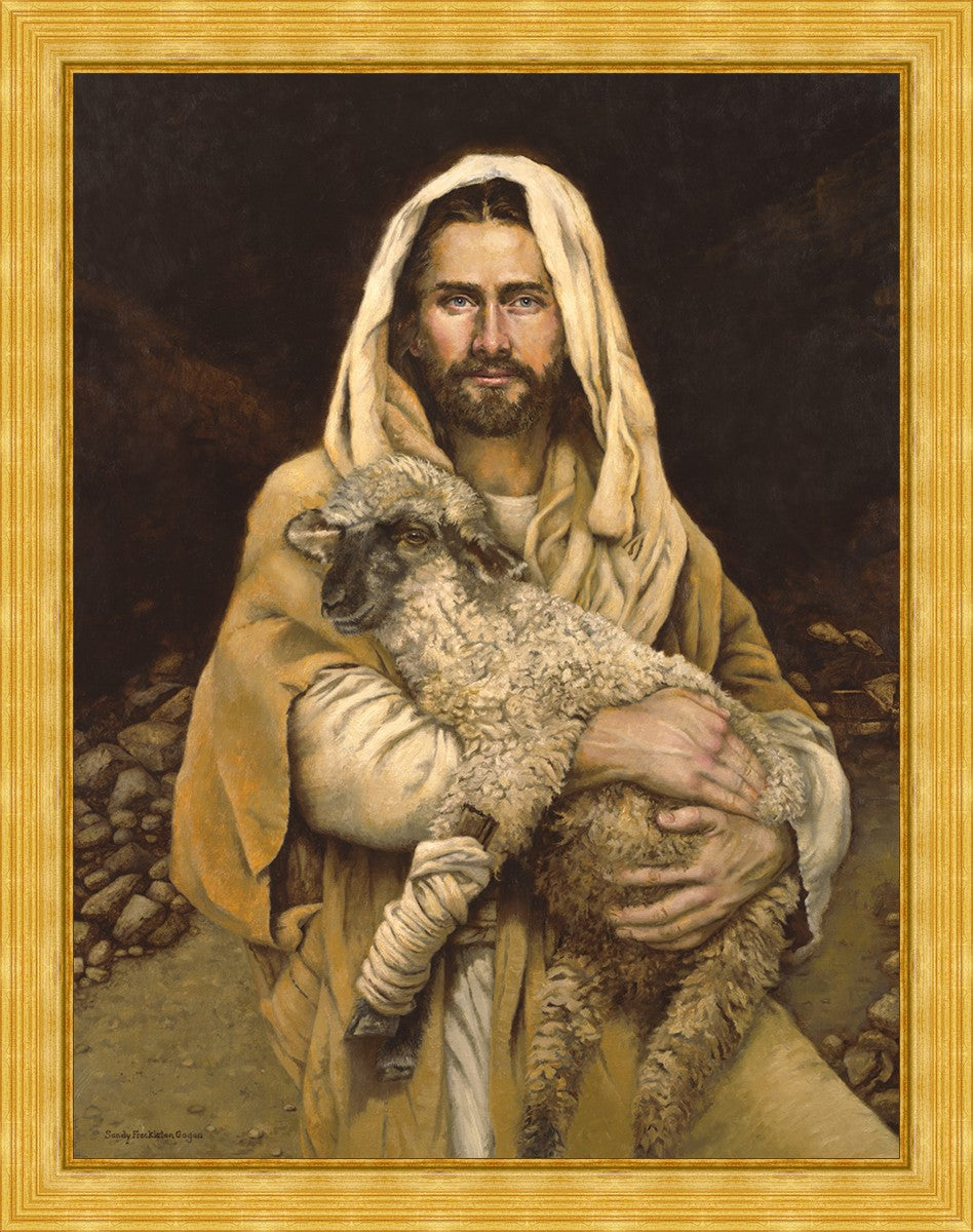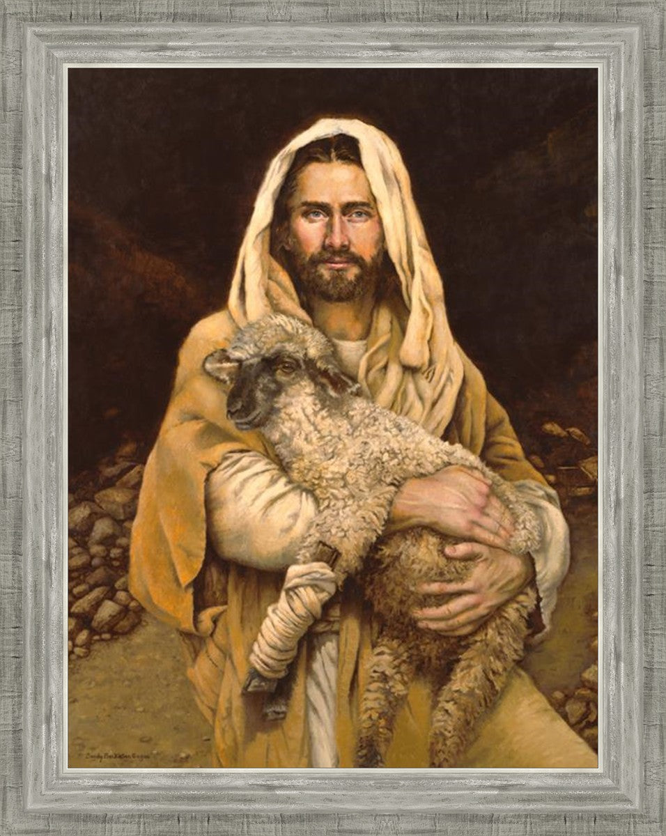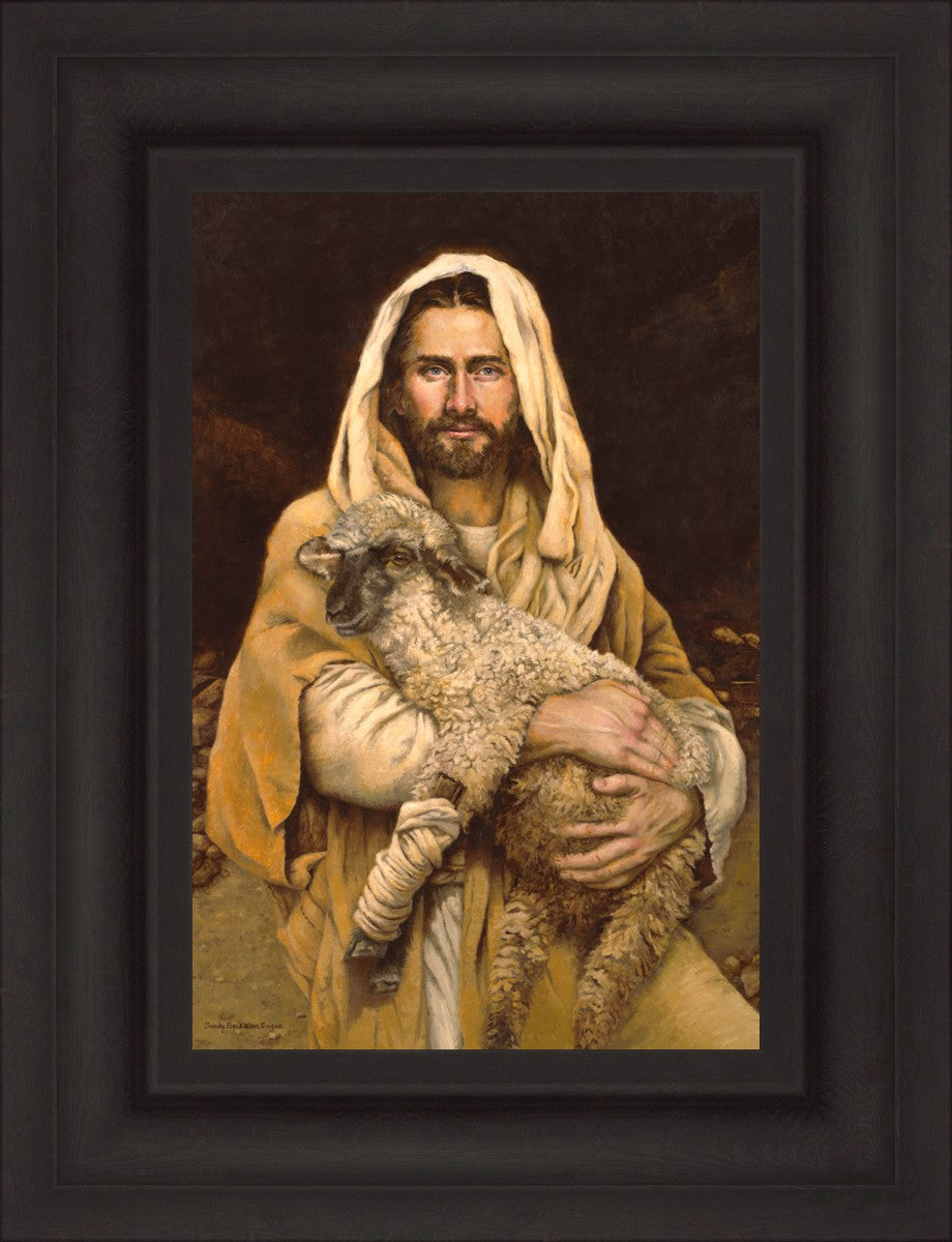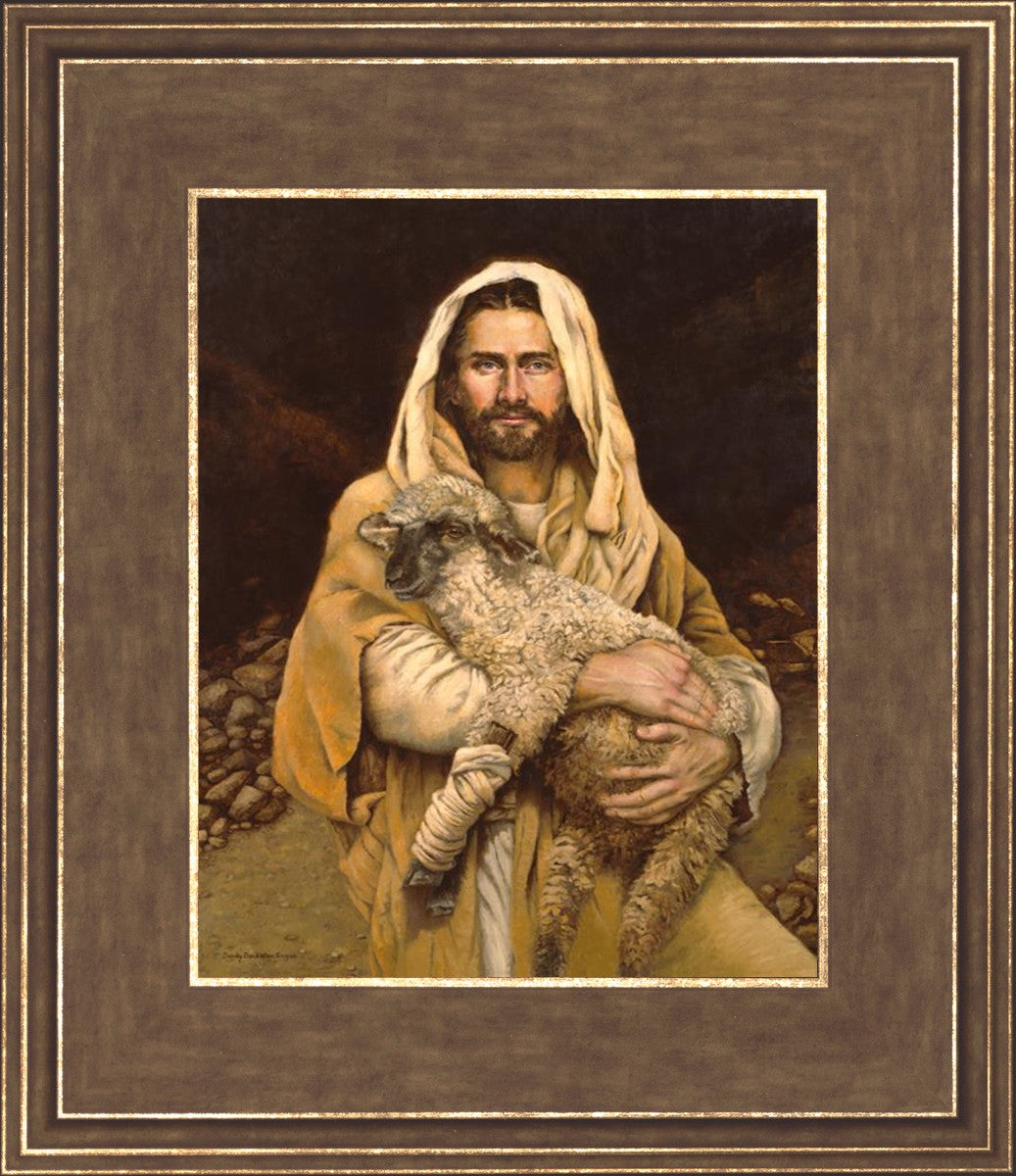 "Bind Up The Broken Hearted" by Sandy Freckleton Gagon is a watercolor painting capturing Jesus tenderly holding a lamb against a backdrop of rocks and a dark brown background.
