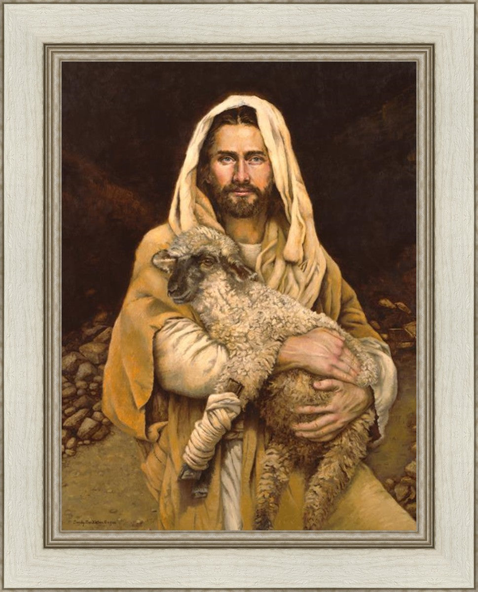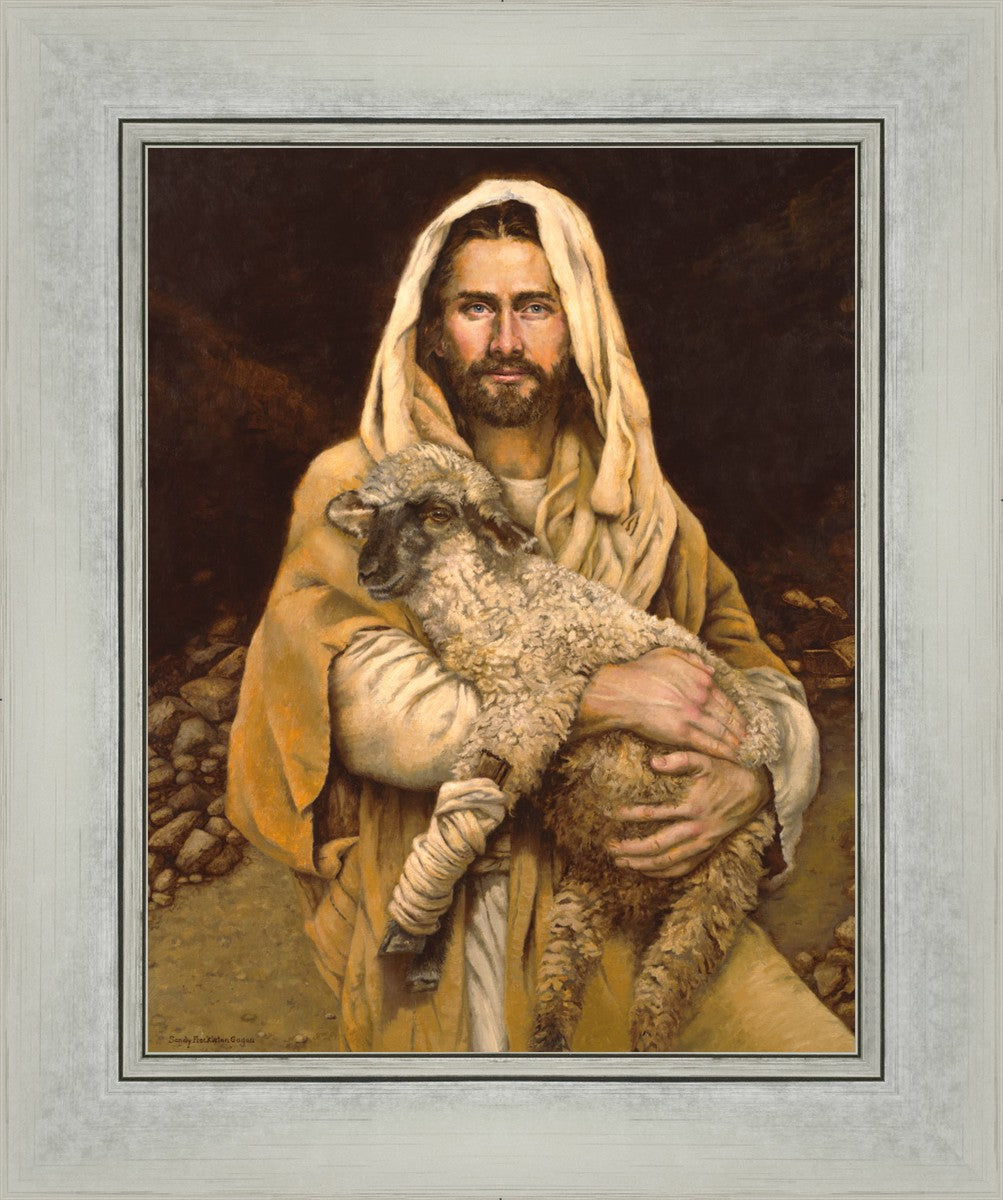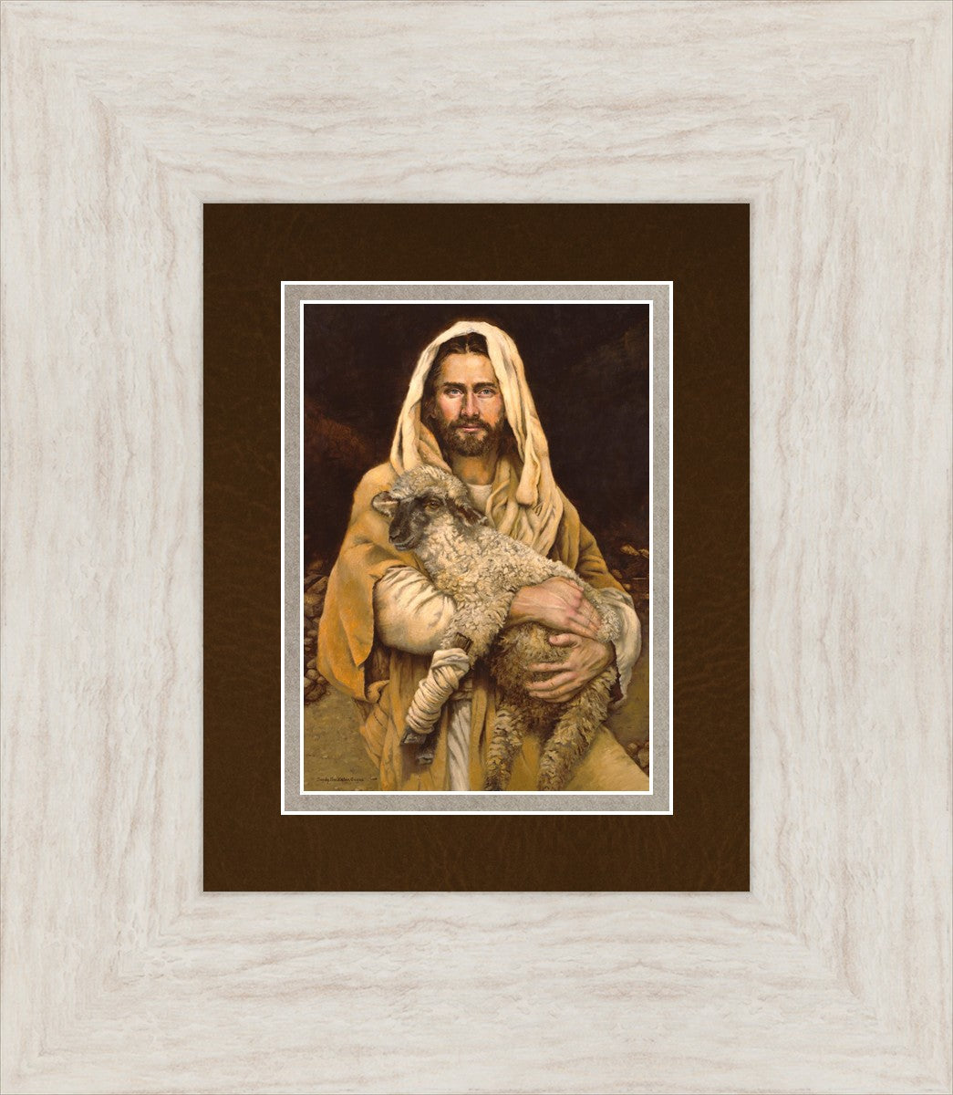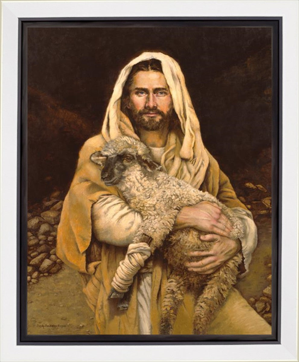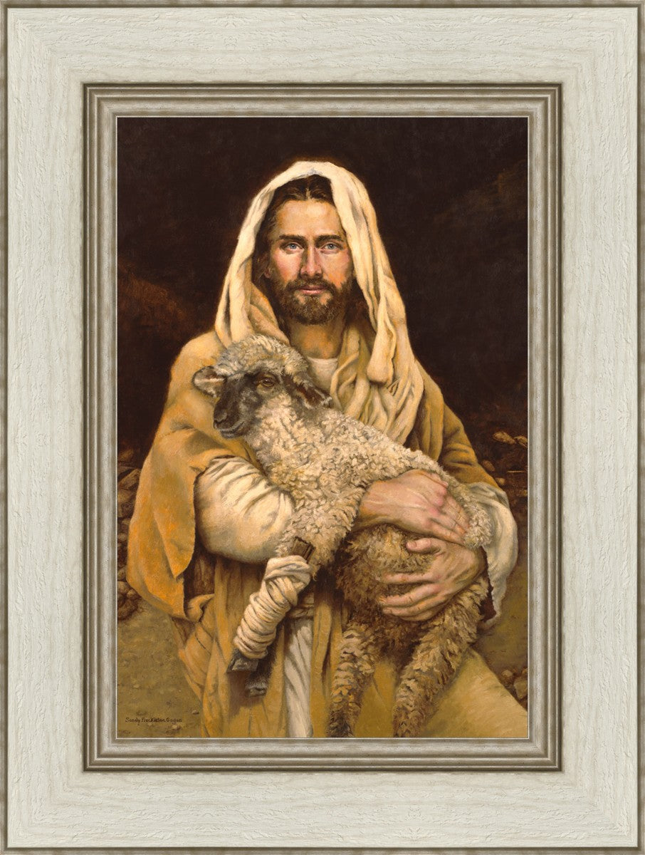 "Bind Up The Broken Hearted" by Sandy Freckleton Gagon is a watercolor painting capturing Jesus tenderly holding a lamb against a backdrop of rocks and a dark brown background.