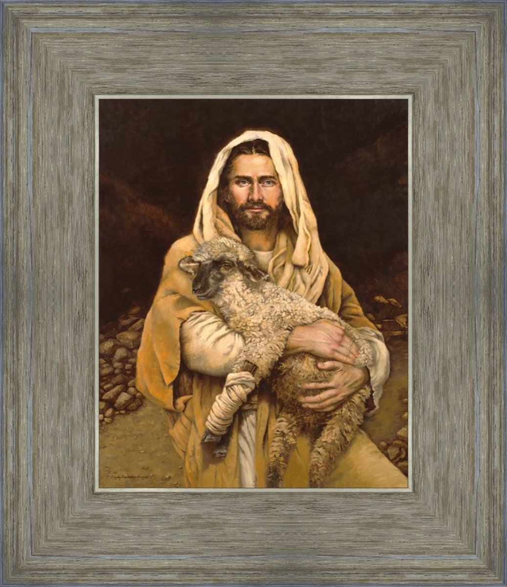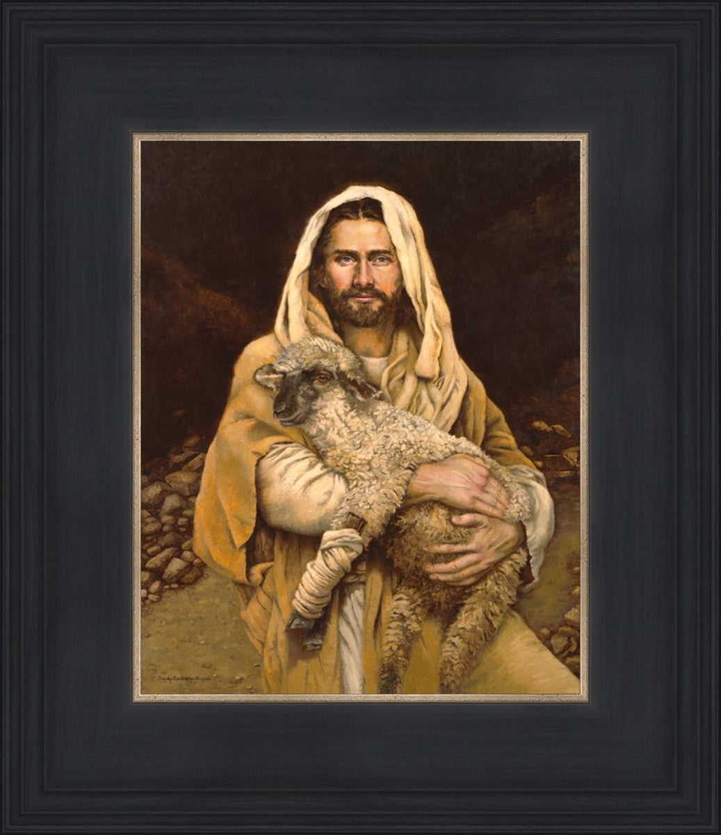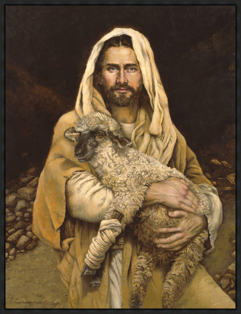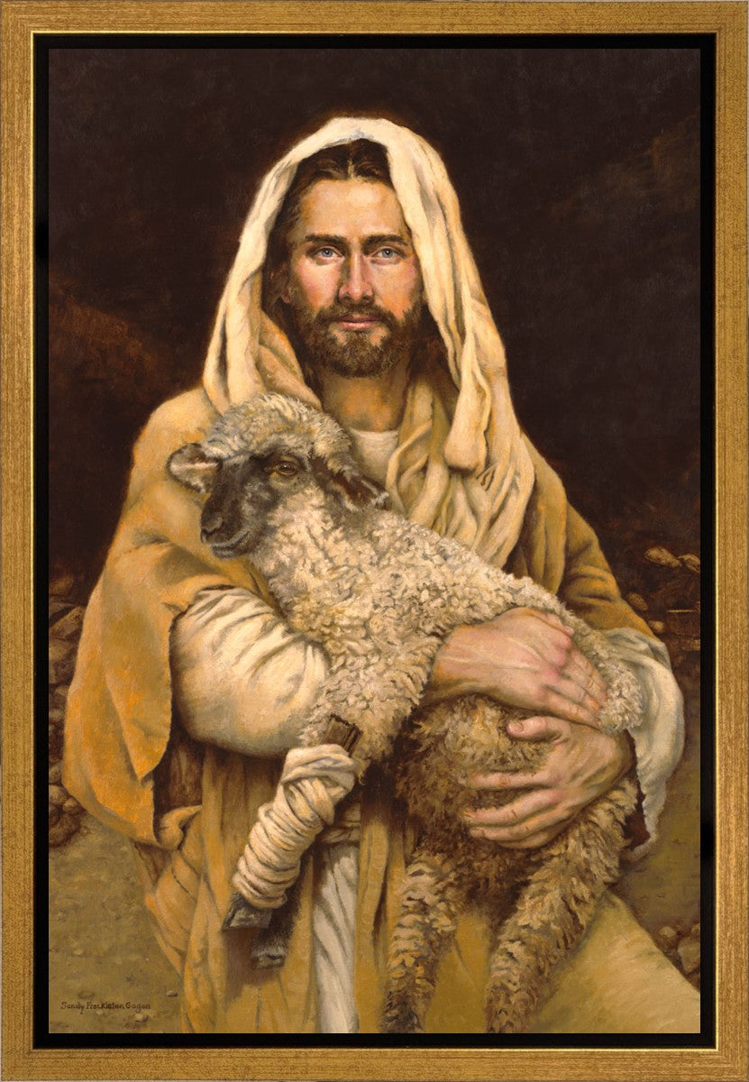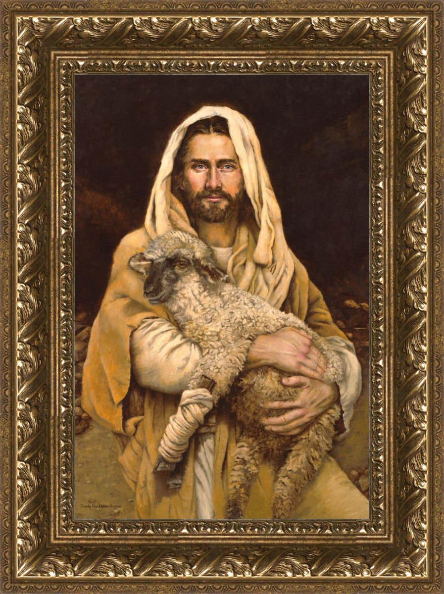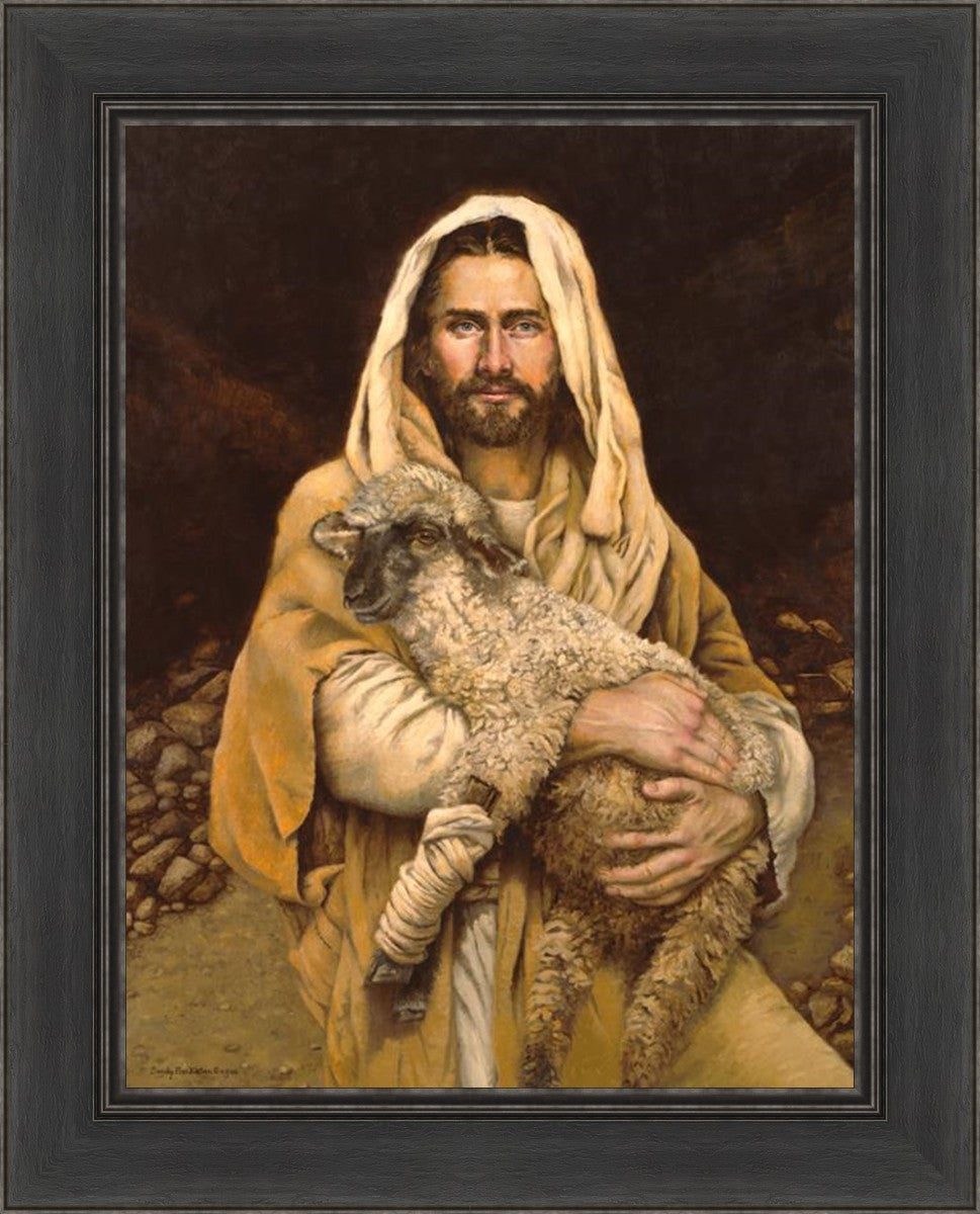 "Bind Up The Broken Hearted" by Sandy Freckleton Gagon is a watercolor painting capturing Jesus tenderly holding a lamb against a backdrop of rocks and a dark brown background.