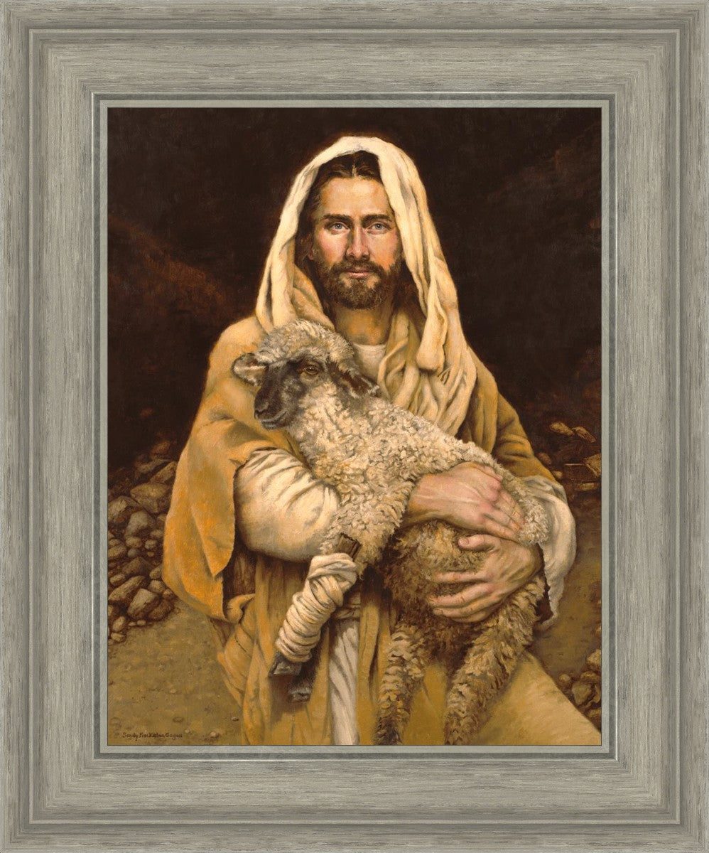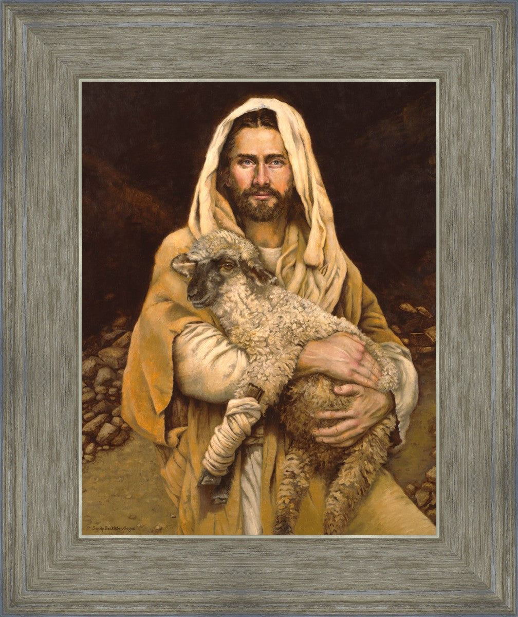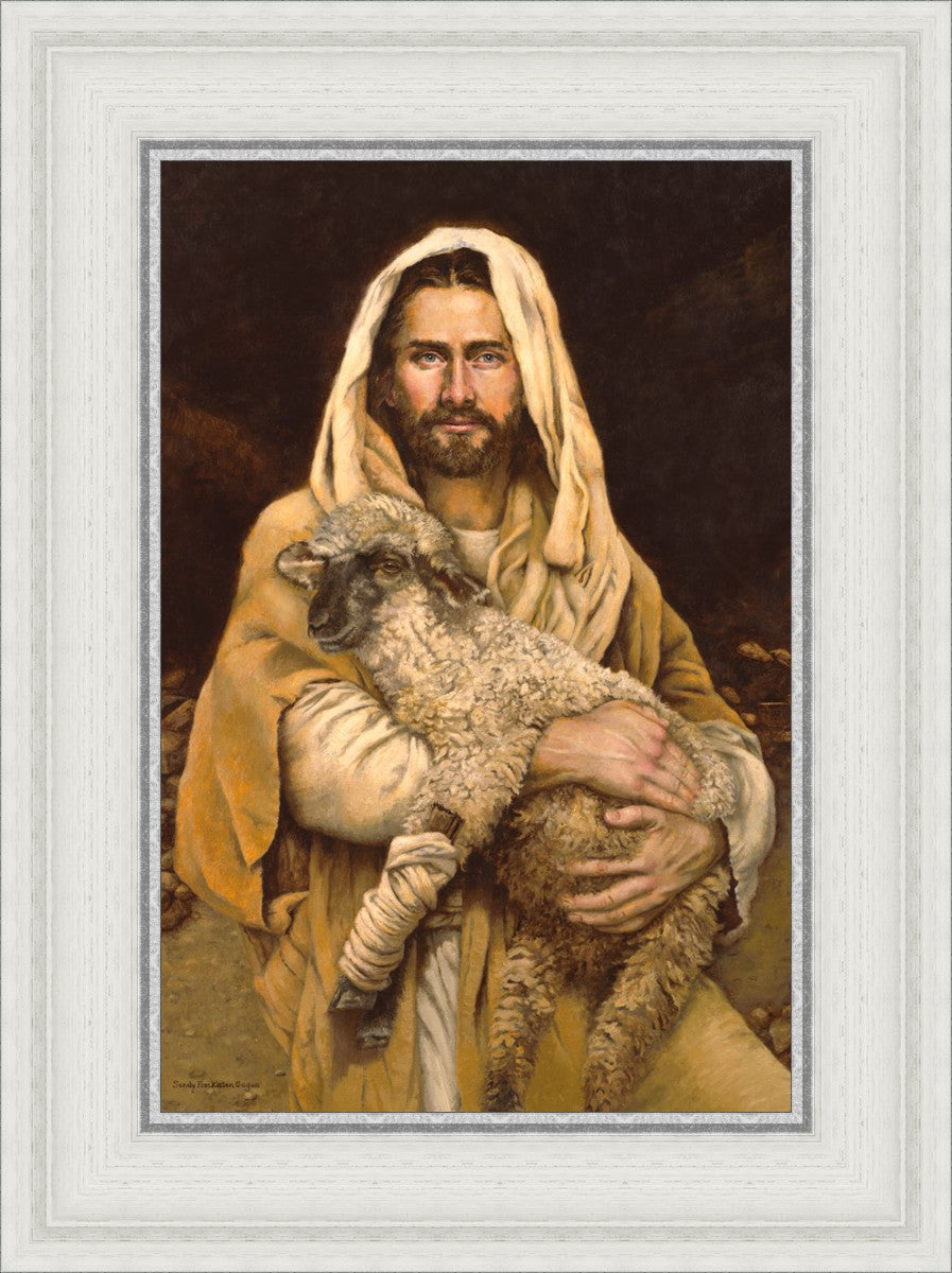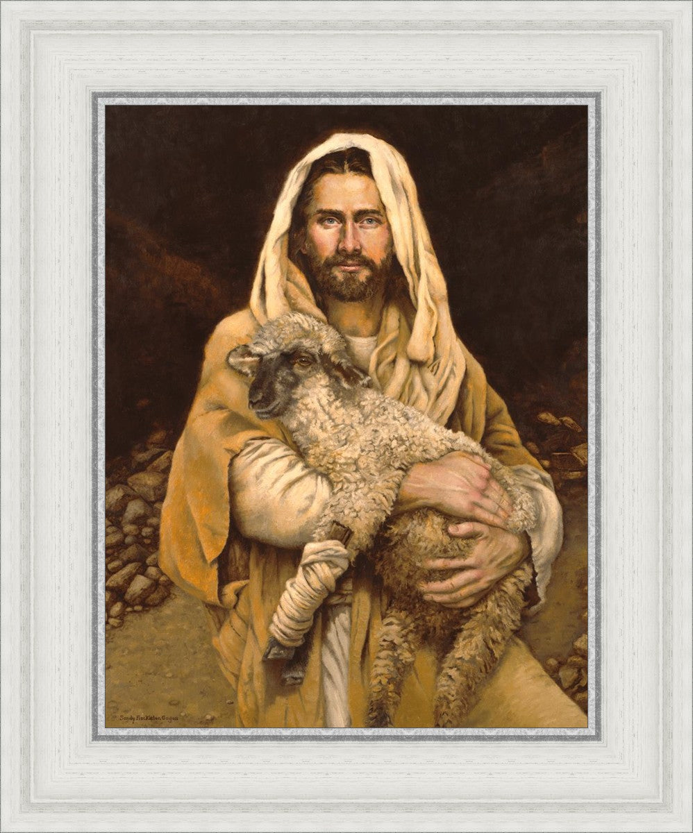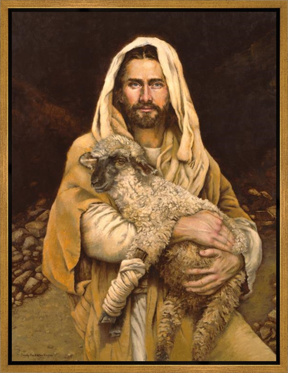 "Bind Up The Broken Hearted" by Sandy Freckleton Gagon is a watercolor painting capturing Jesus tenderly holding a lamb against a backdrop of rocks and a dark brown background.