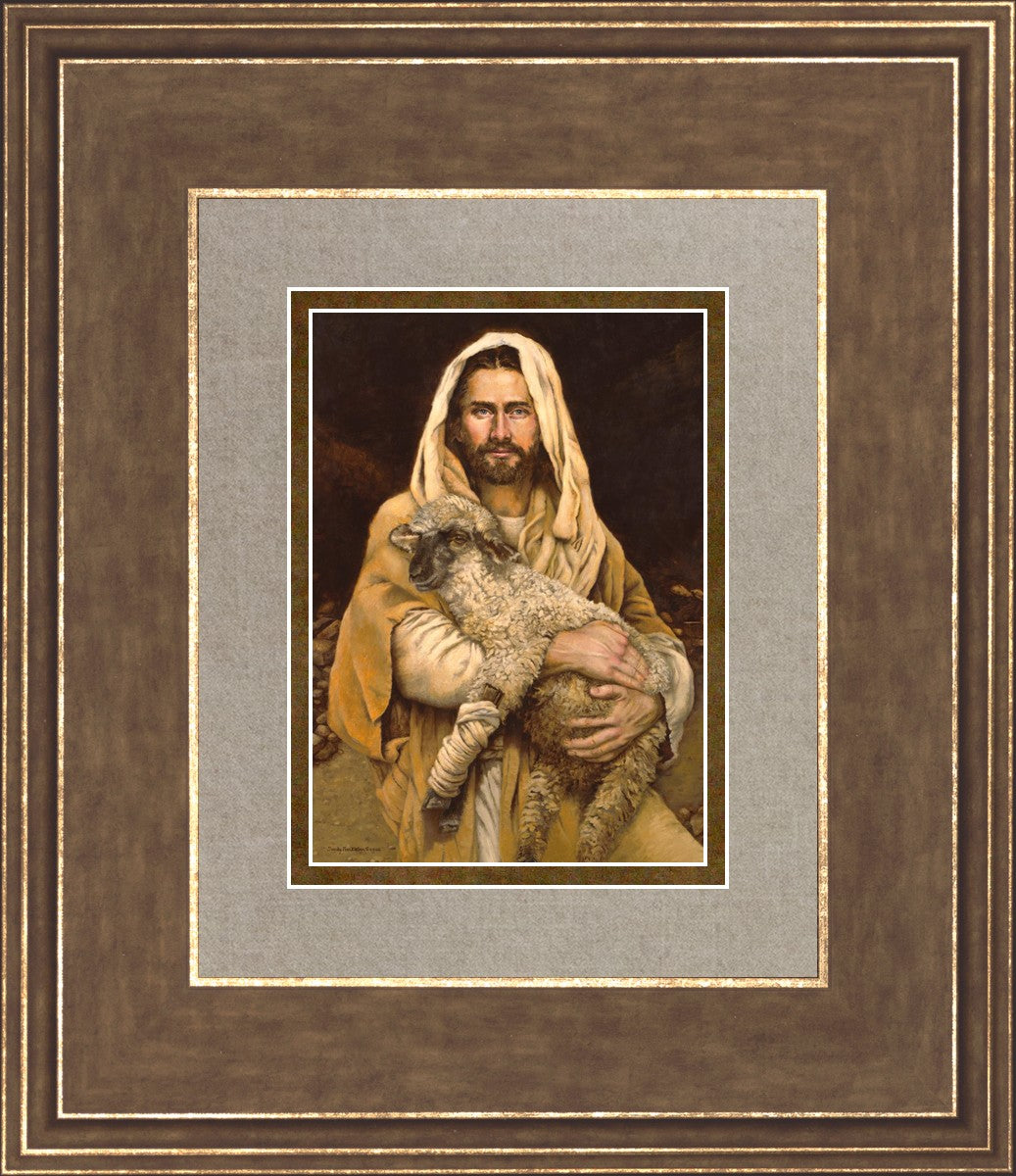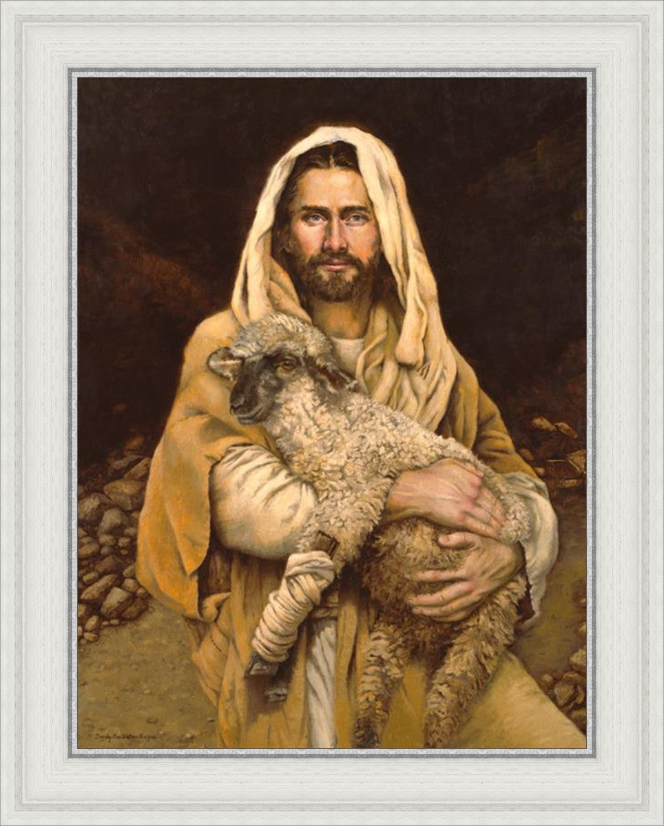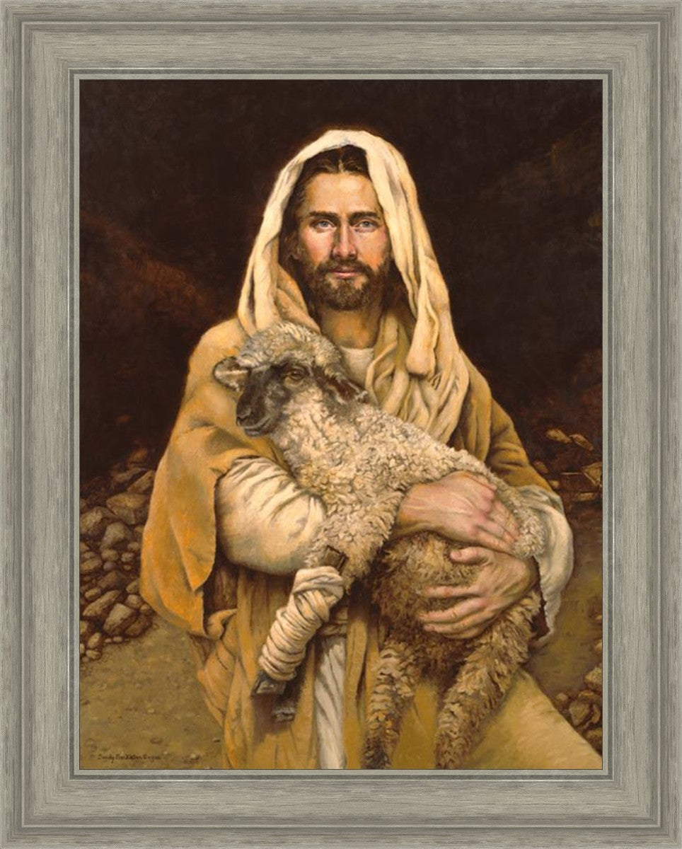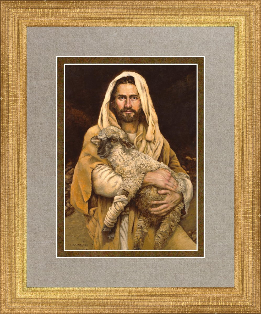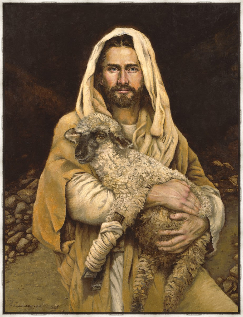 "Bind Up The Broken Hearted" by Sandy Freckleton Gagon is a watercolor painting capturing Jesus tenderly holding a lamb against a backdrop of rocks and a dark brown background.