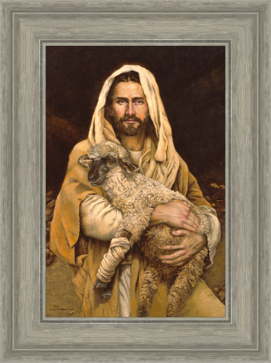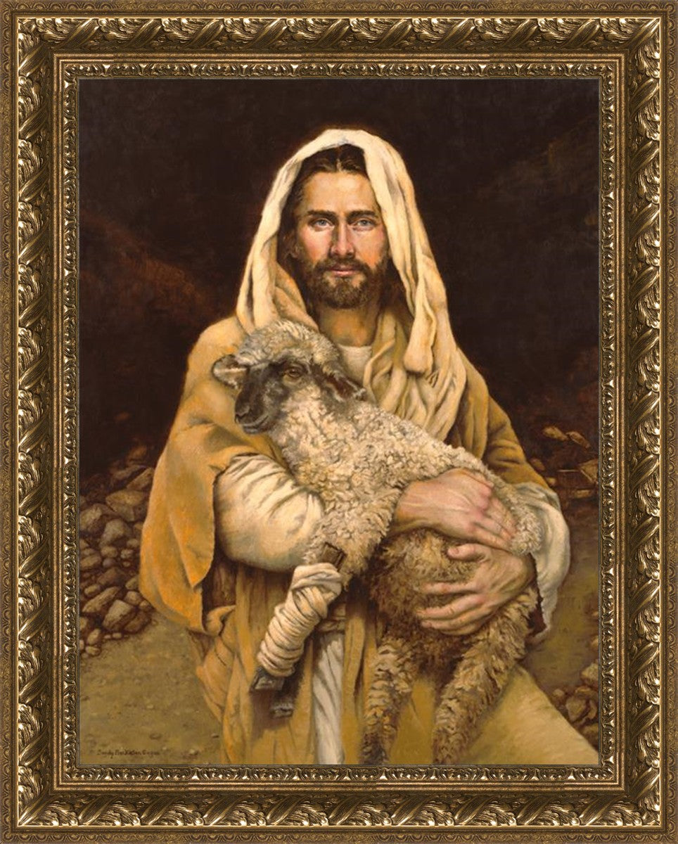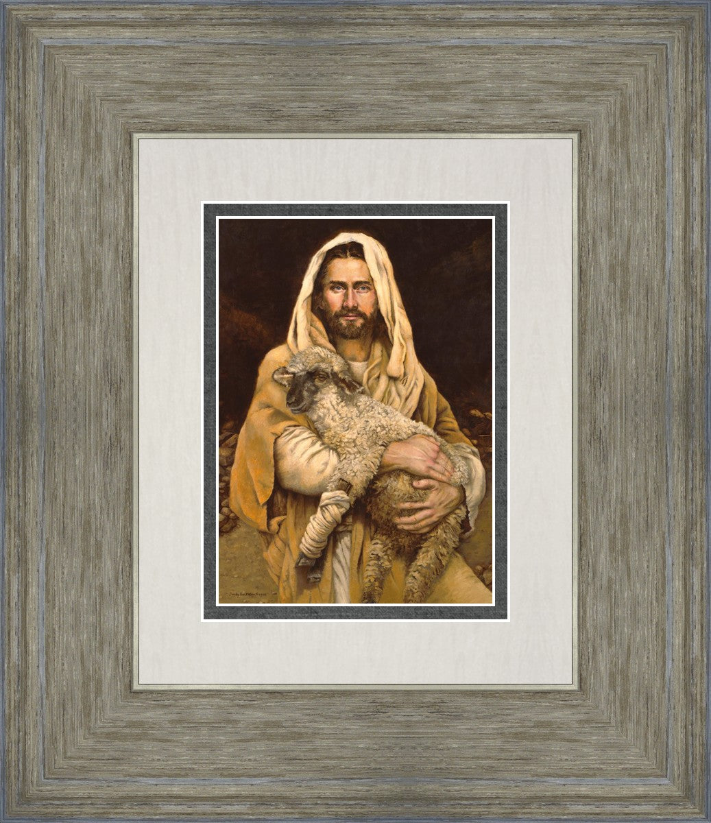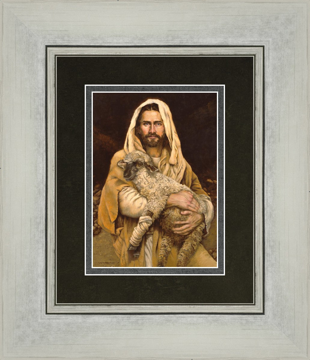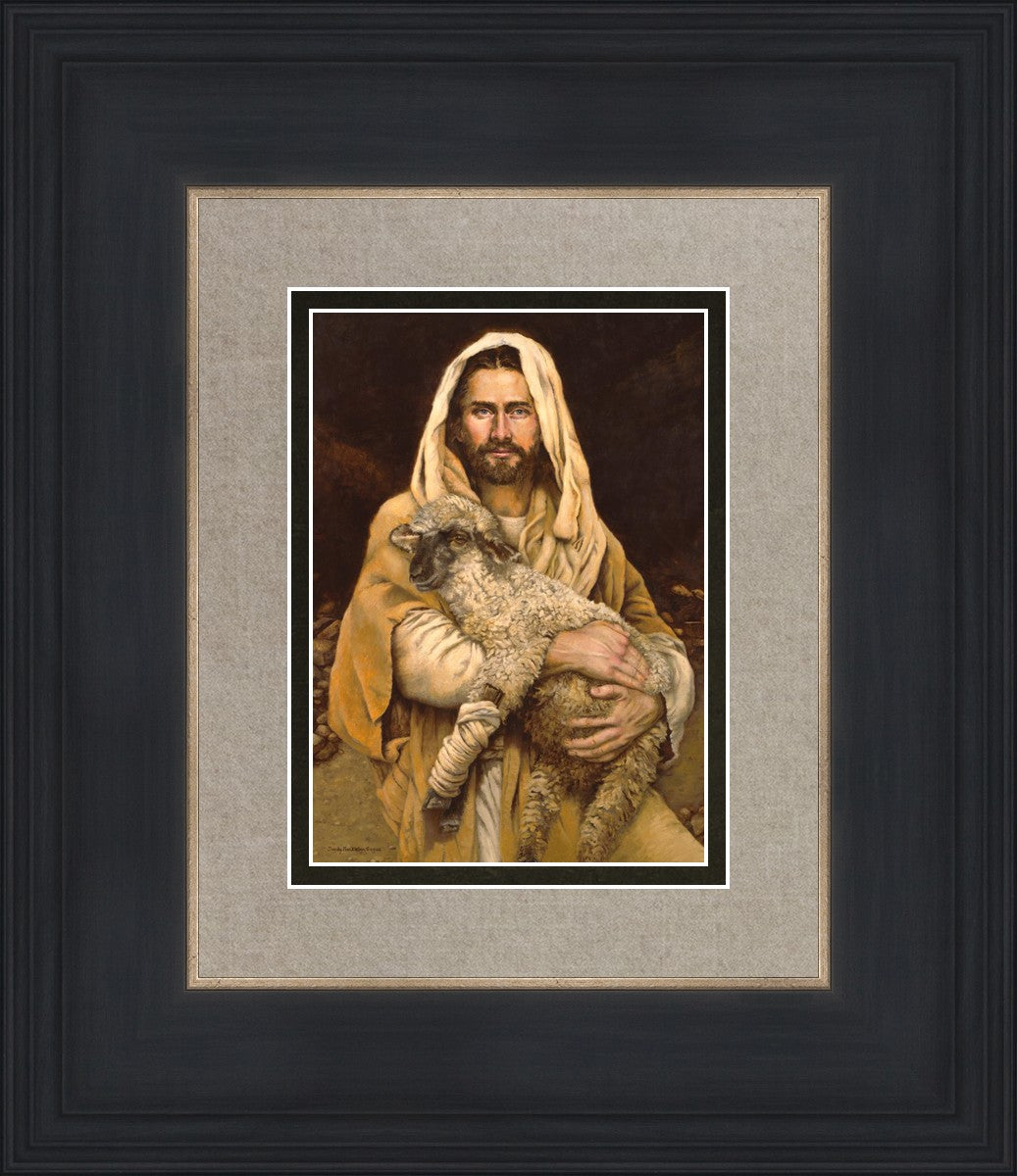"Bind Up The Broken Hearted" by Sandy Freckleton Gagon is a watercolor painting capturing Jesus tenderly holding a lamb against a backdrop of rocks and a dark brown background.