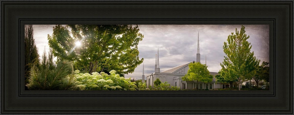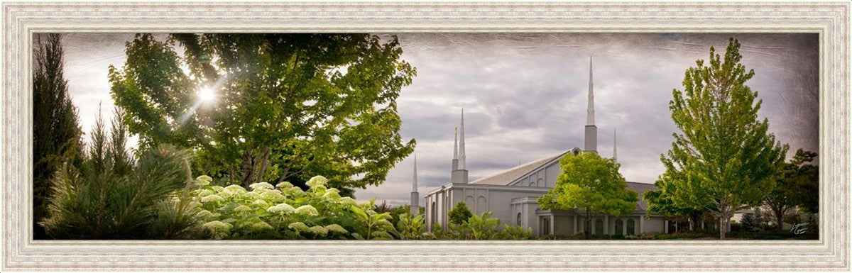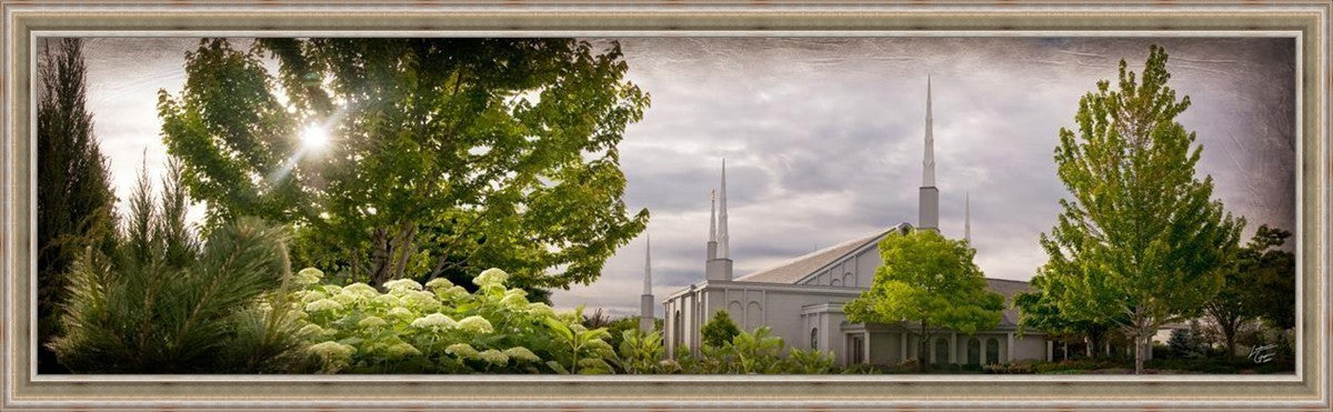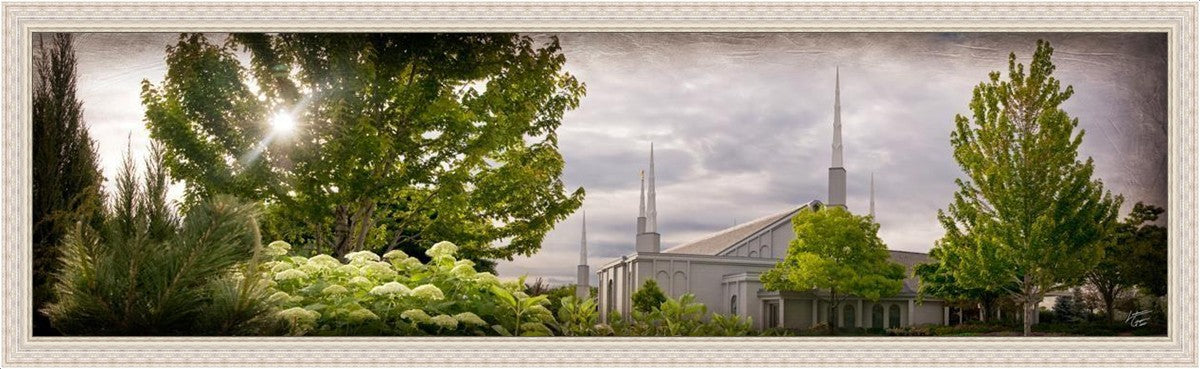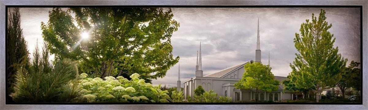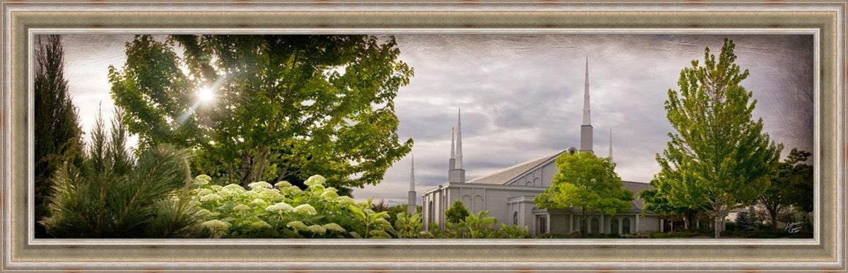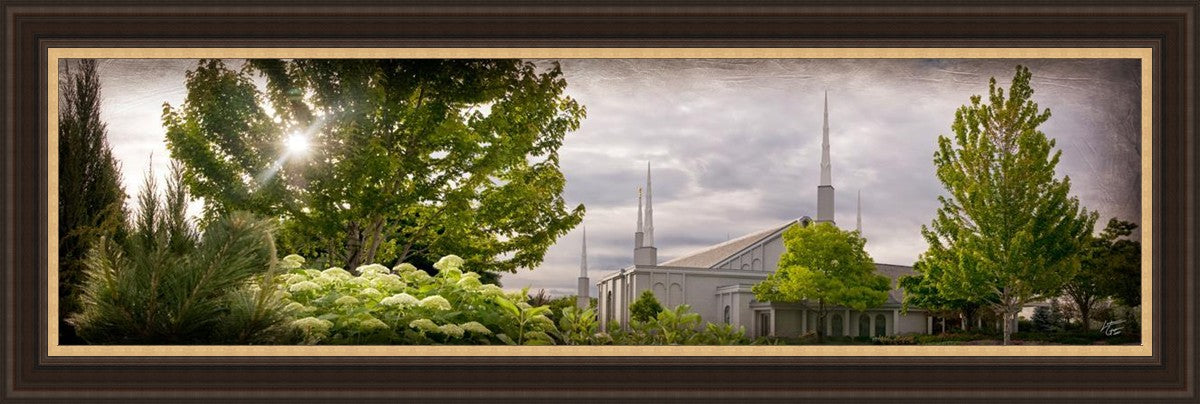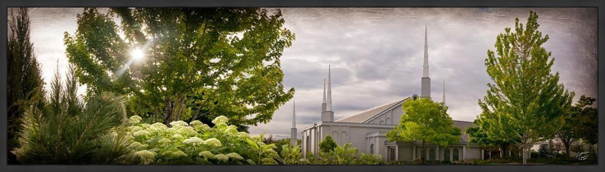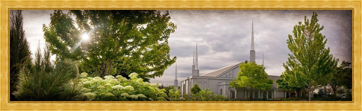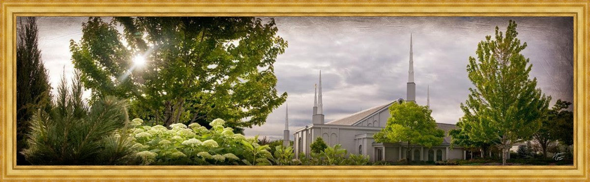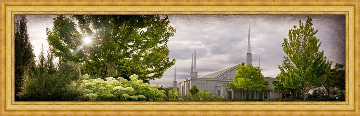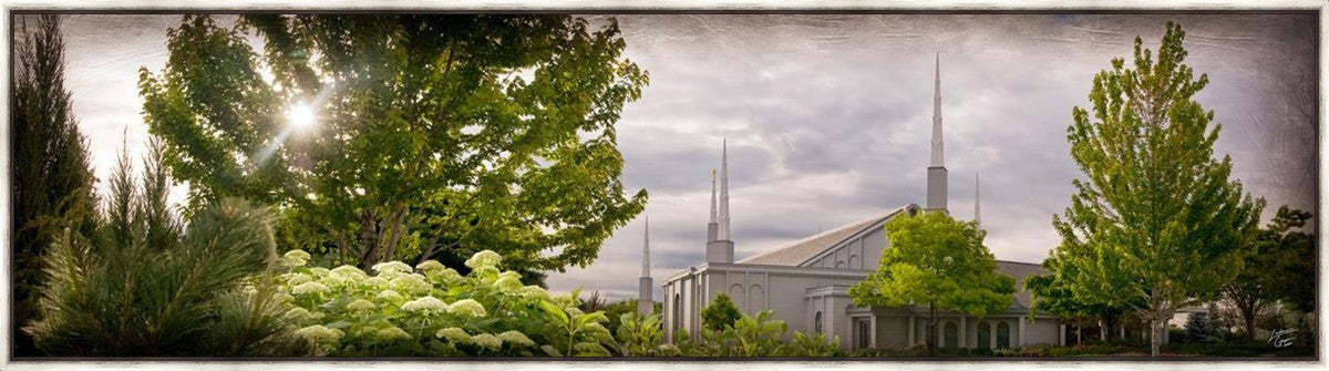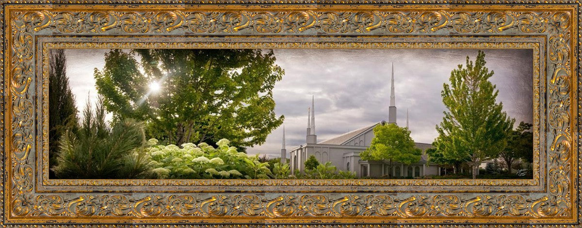 Since 1999 Landon has worked as an artisan in nearly 40 temples doing the decorative paint and gold leaf. He continues to do so as well as wood repair and graining. He was married in 2001 to Jacey Thomas in the Manti Utah temple. When she couldn’t find an image of the temple that she liked enough to purchase for their home, he decided to take one himself. That desire to create something original and different inspired his current series of temple art. They are taken from a panoramic viewpoint and stylized with an artistic border that reflect his paintings. All modern structures apart from the temple have been omitted.