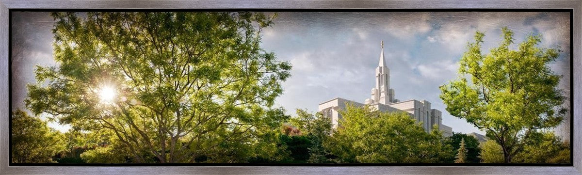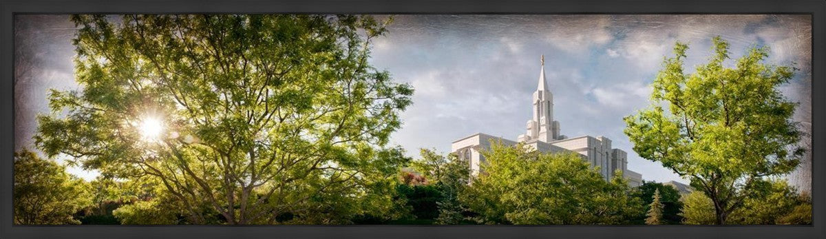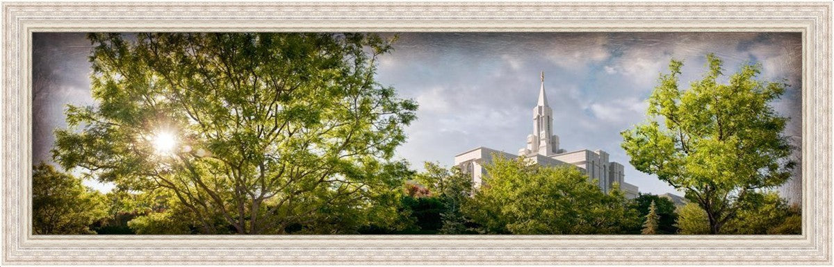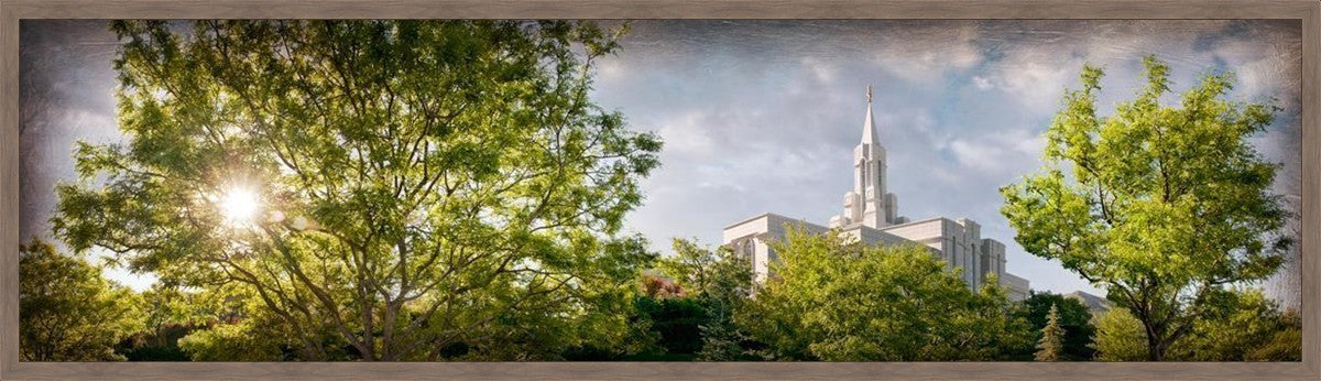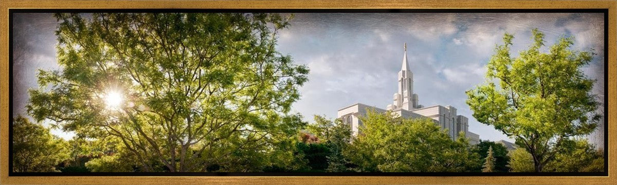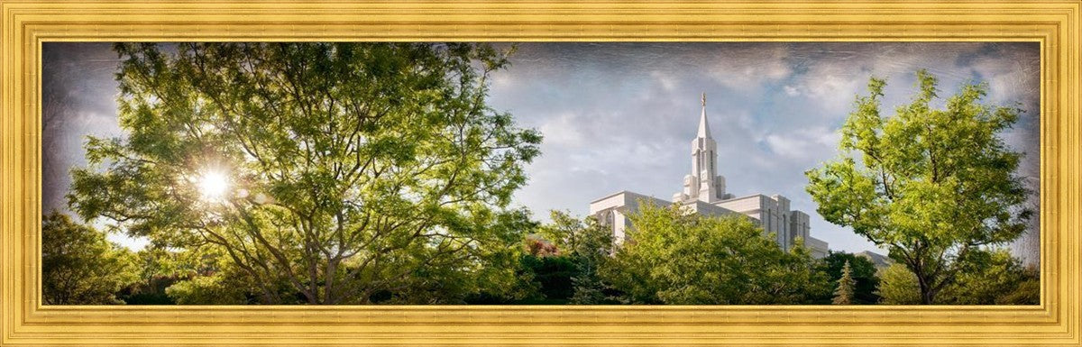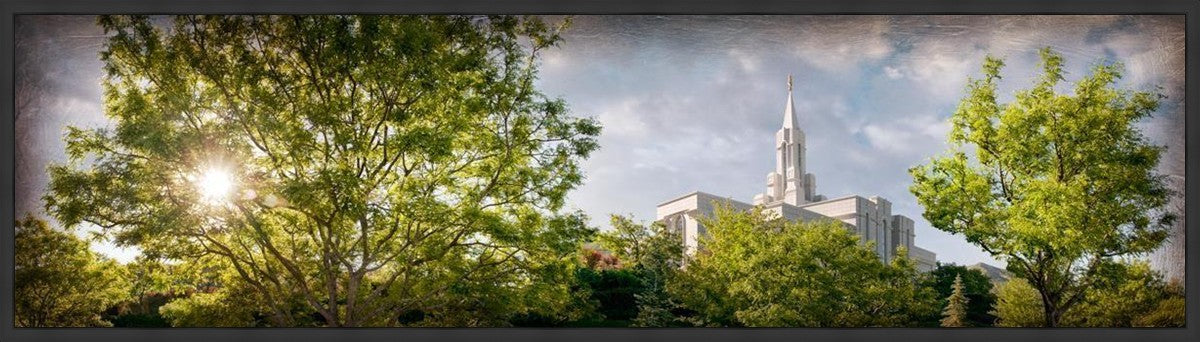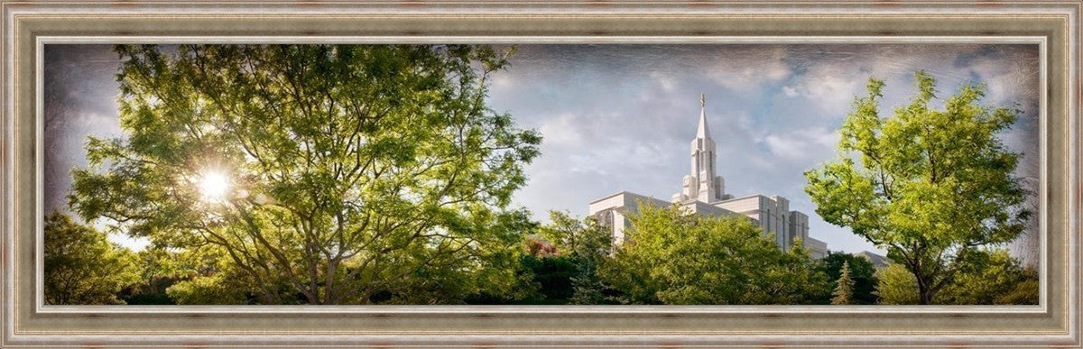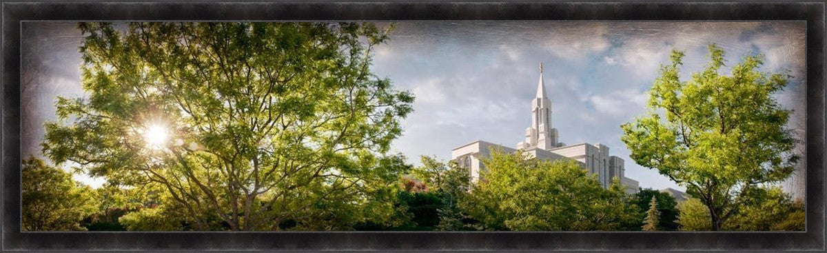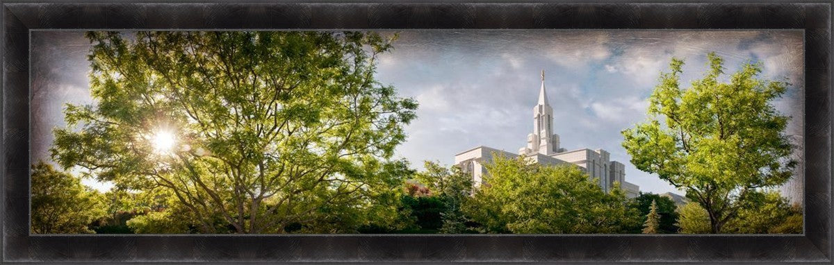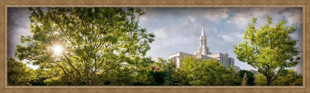 Since 1999 Landon has worked as an artisan in nearly 40 temples doing the decorative paint and gold leaf. He continues to do so as well as wood repair and graining. He was married in 2001 to Jacey Thomas in the Manti Utah temple. When she couldn’t find an image of the temple that she liked enough to purchase for their home, he decided to take one himself. That desire to create something original and different inspired his current series of temple art. They are taken from a panoramic viewpoint and stylized with an artistic border that reflect his paintings. All modern structures apart from the temple have been omitted.