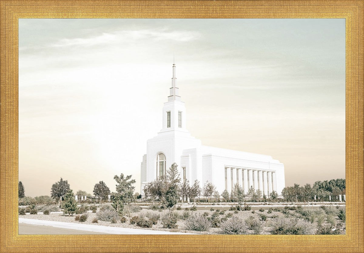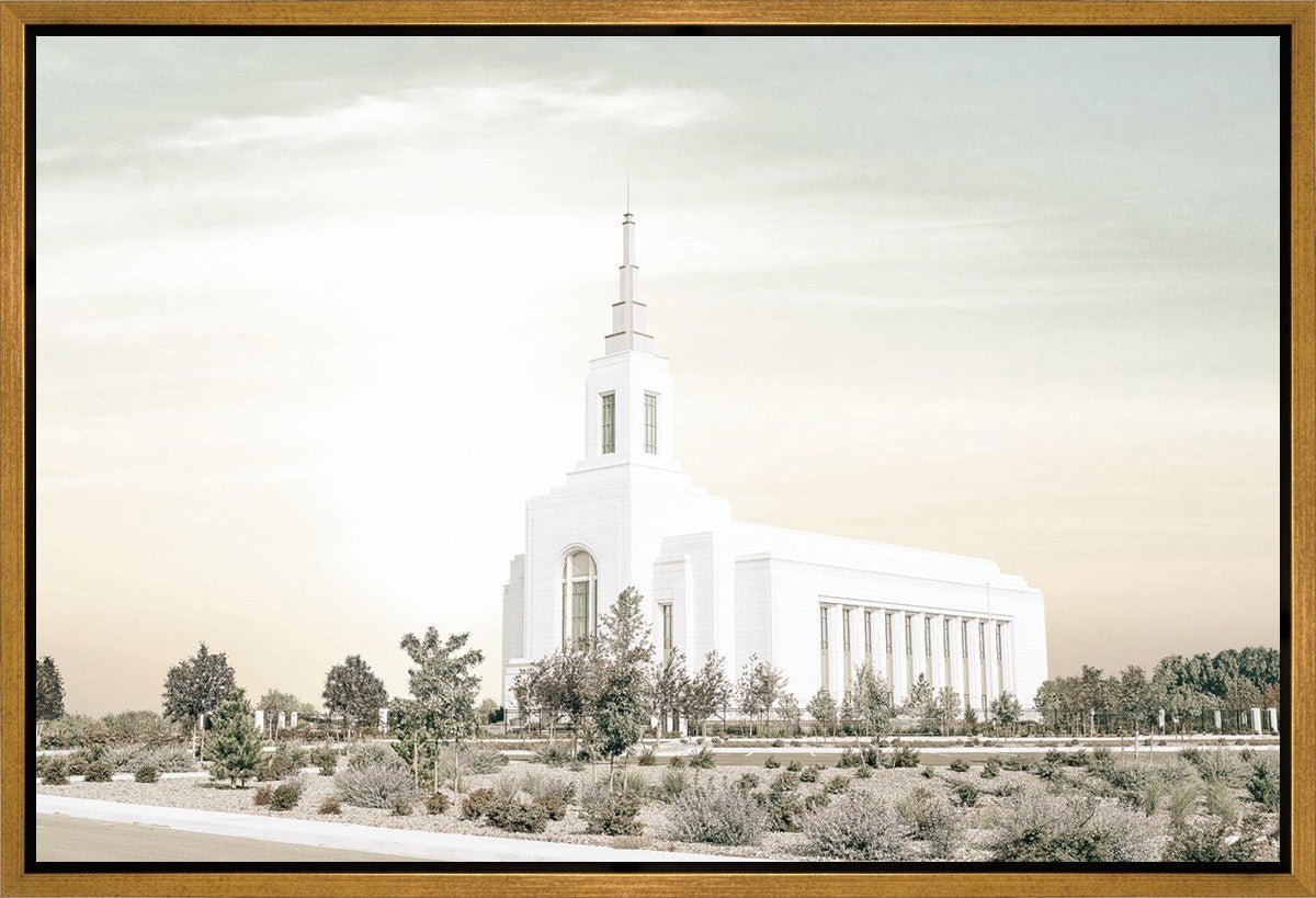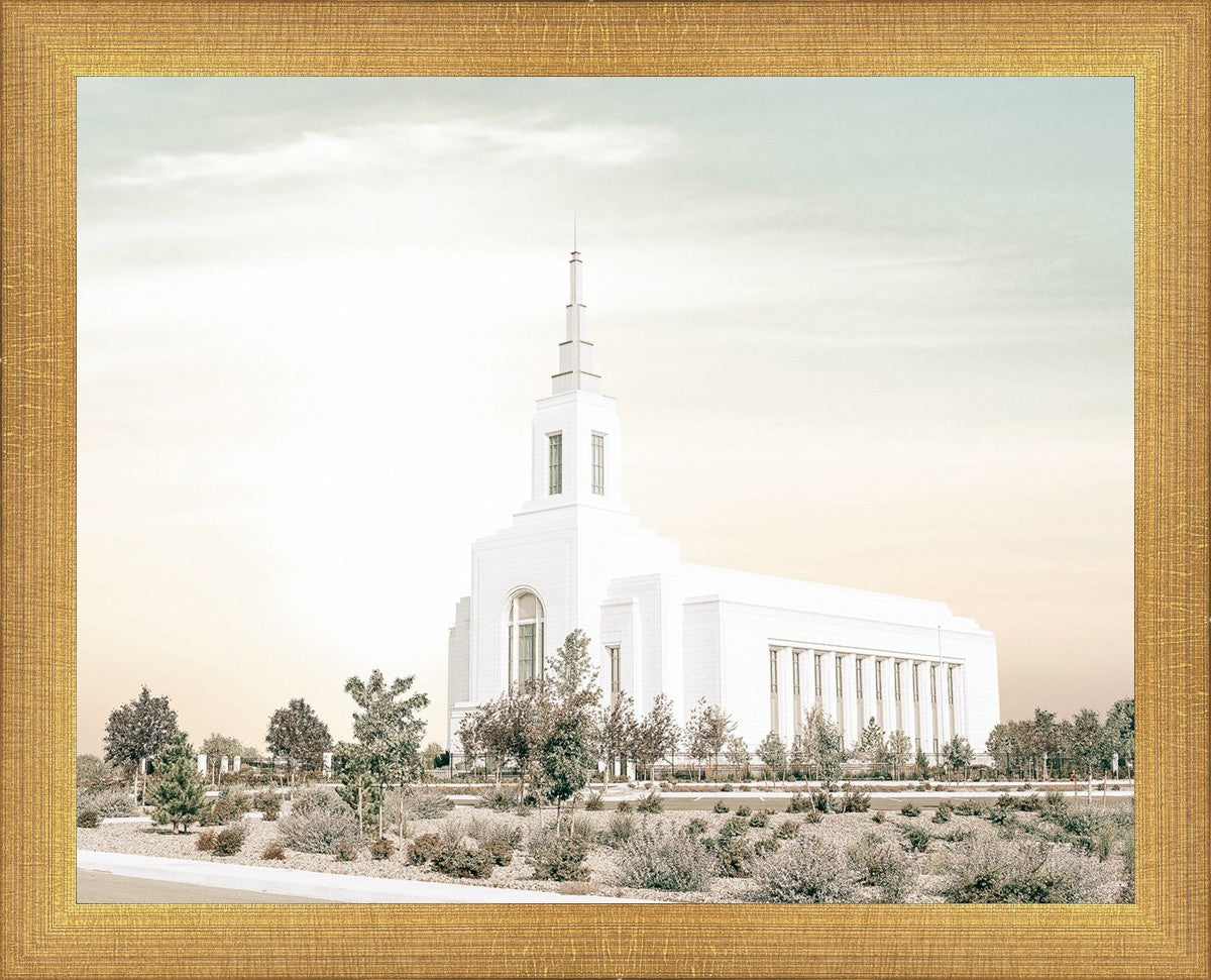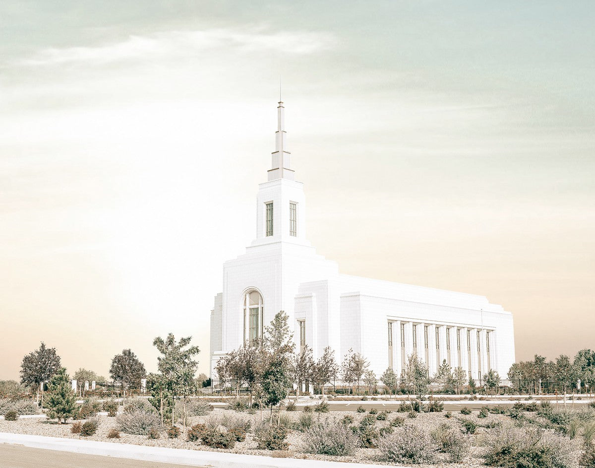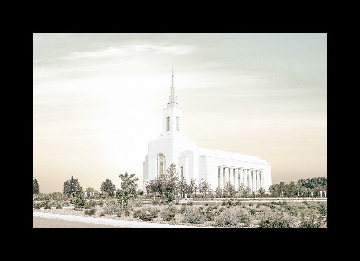 Each artistic rendition of the temple seeks to provide solitude by removing distractions while honoring its original design. Peace is found in the choice of a consistent, gentle color palette that embraces a natural, textured look and the timeless character that all great art should possess. The luminance and radiance in each image aim to infuse a heavenly ambiance into your living space.