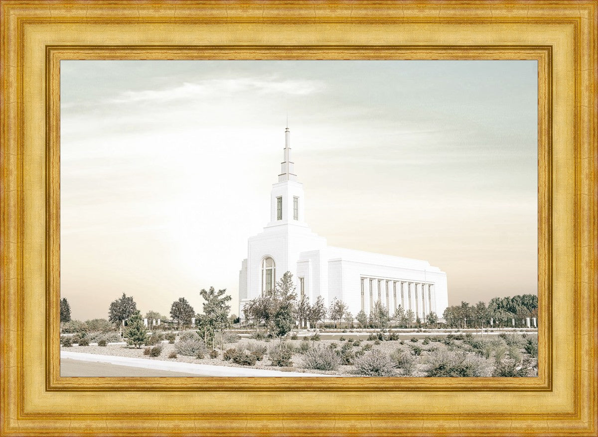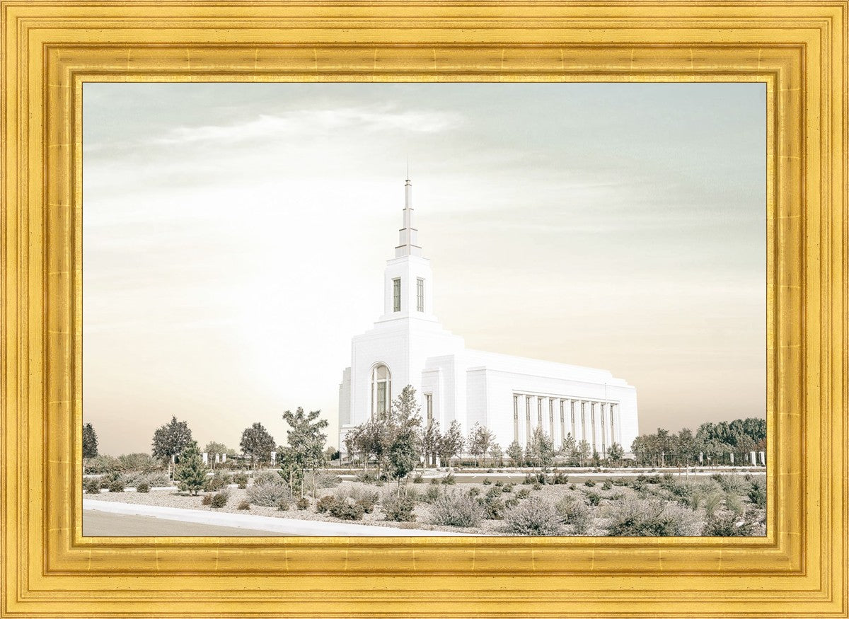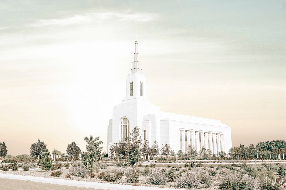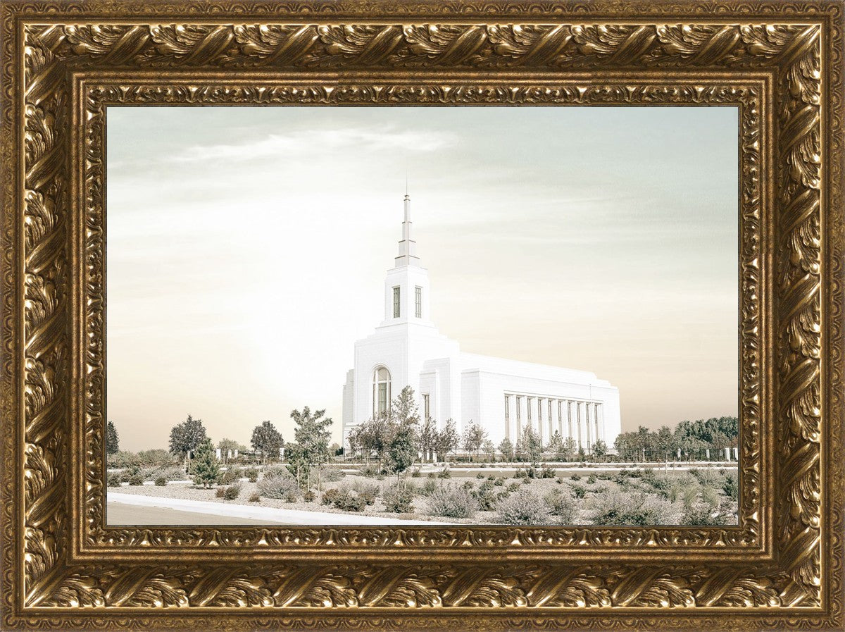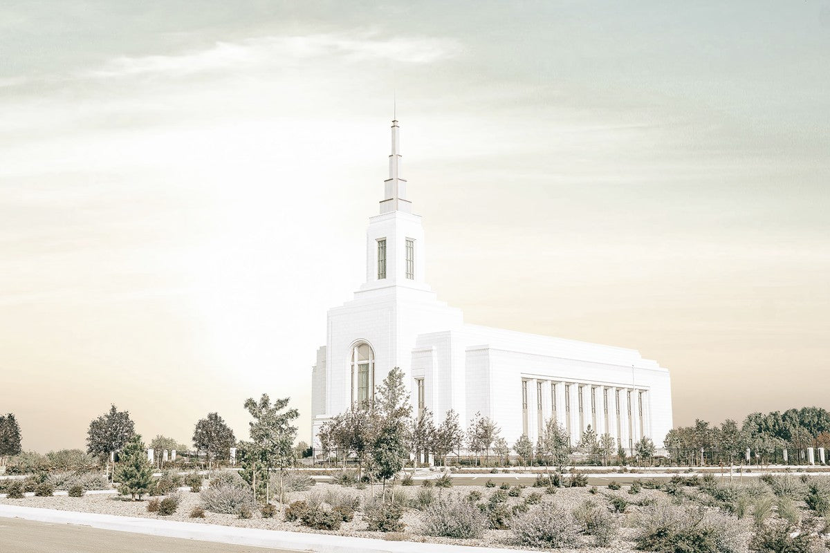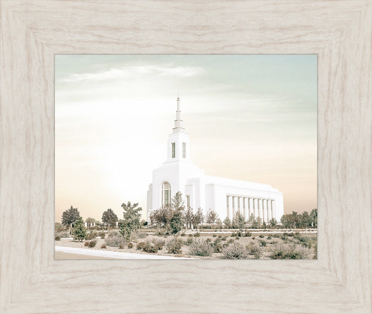 Each artistic rendition of the temple seeks to provide solitude by removing distractions while honoring its original design. Peace is found in the choice of a consistent, gentle color palette that embraces a natural, textured look and the timeless character that all great art should possess. The luminance and radiance in each image aim to infuse a heavenly ambiance into your living space.