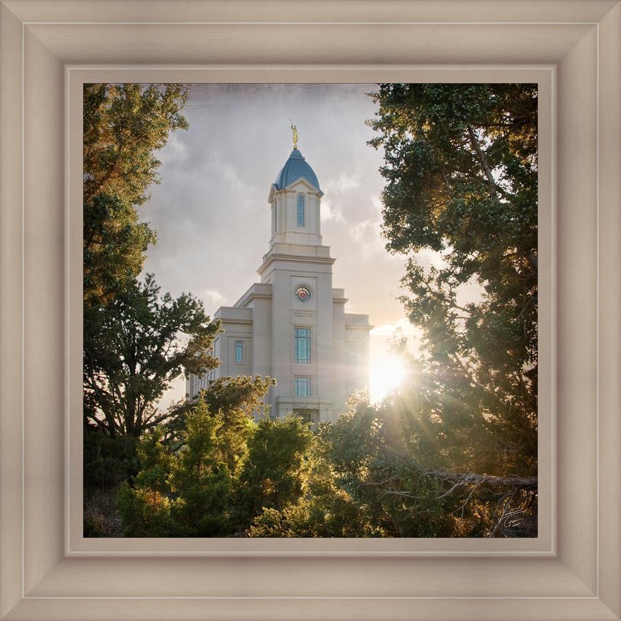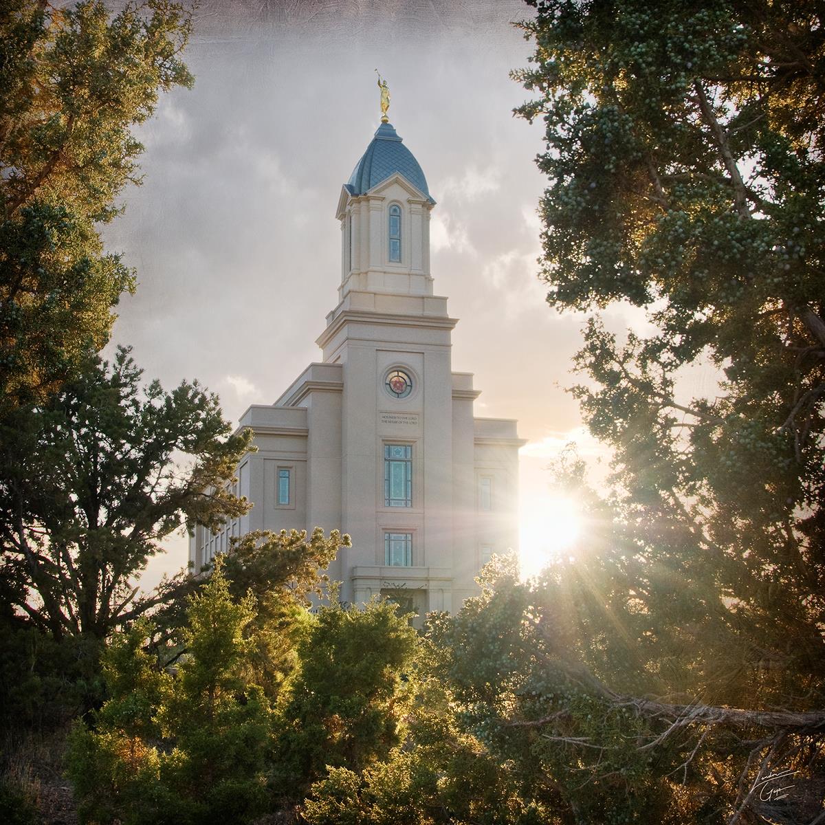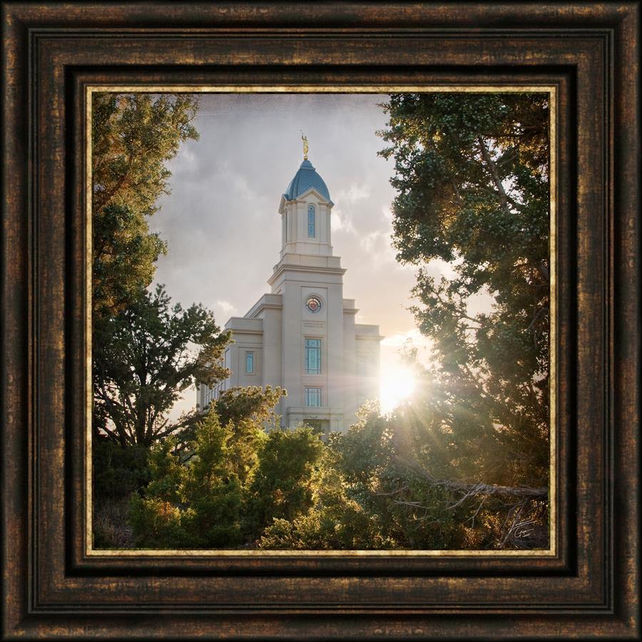 Since 1999 Landon has worked as an artisan in nearly 40 temples doing the decorative paint and gold leaf. He continues to do so as well as wood repair and graining. He was married in 2001 to Jacey Thomas in the Manti Utah temple. When she couldn’t find an image of the temple that she liked enough to purchase for their home, he decided to take one himself. That desire to create something original and different inspired his current series of temple art. They are taken from a panoramic viewpoint and stylized with an artistic border that reflect his paintings. All modern structures apart from the temple have been omitted.