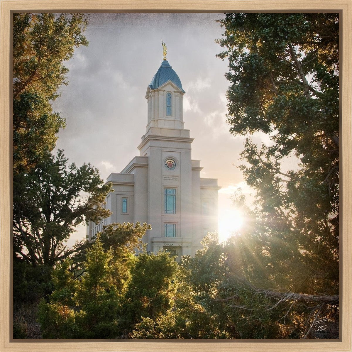 Since 1999 Landon has worked as an artisan in nearly 40 temples doing the decorative paint and gold leaf. He continues to do so as well as wood repair and graining. He was married in 2001 to Jacey Thomas in the Manti Utah temple. When she couldn’t find an image of the temple that she liked enough to purchase for their home, he decided to take one himself. That desire to create something original and different inspired his current series of temple art. They are taken from a panoramic viewpoint and stylized with an artistic border that reflect his paintings. All modern structures apart from the temple have been omitted.