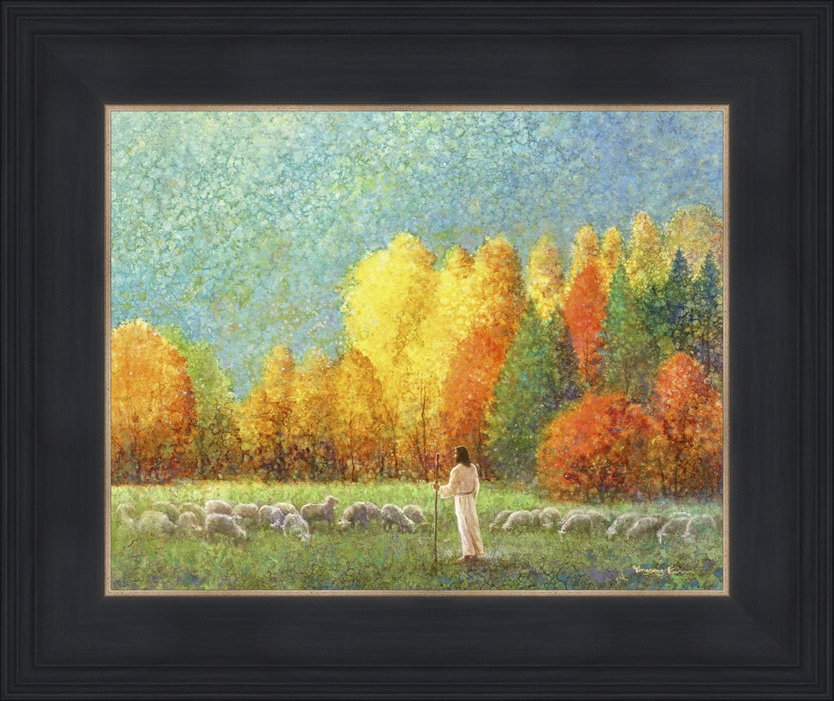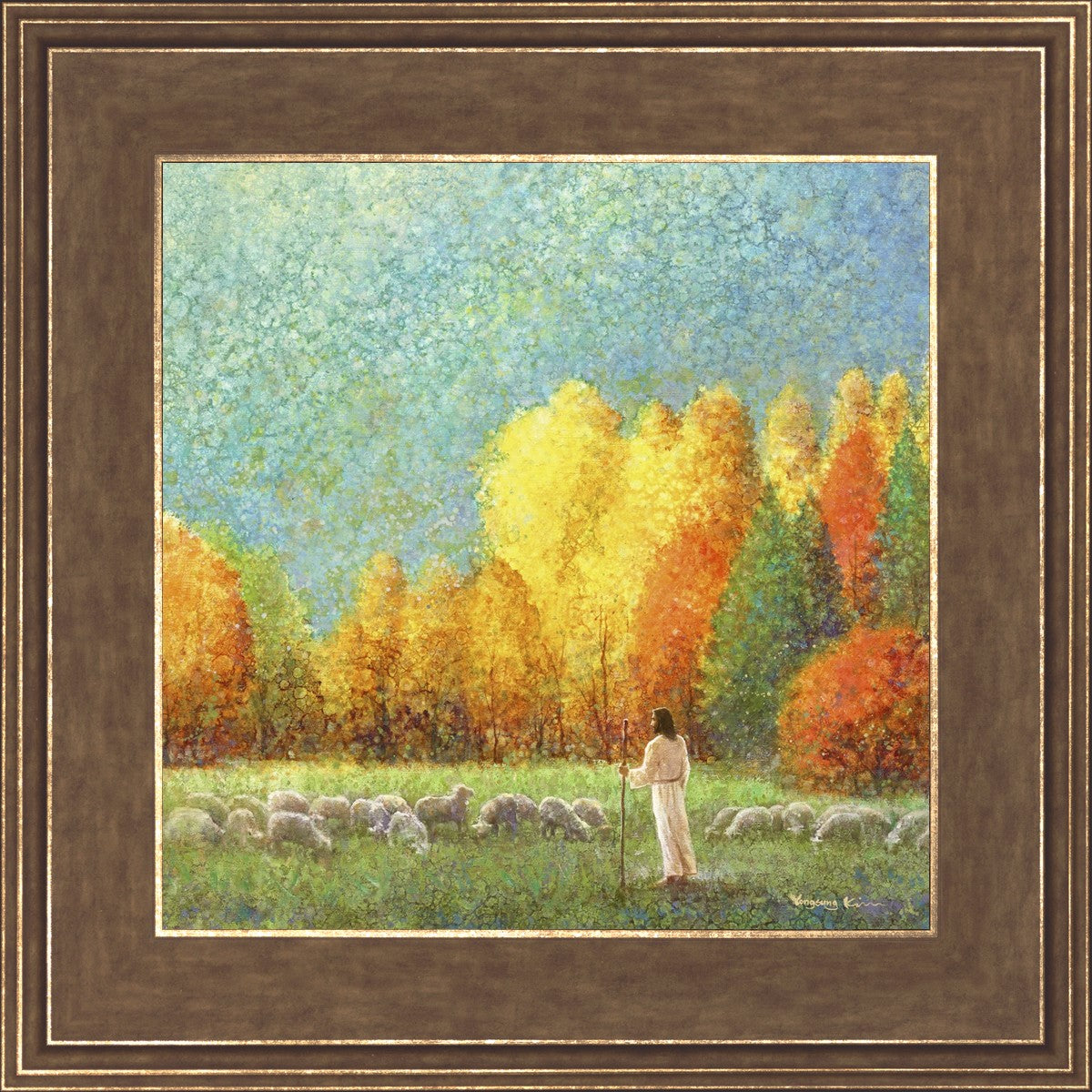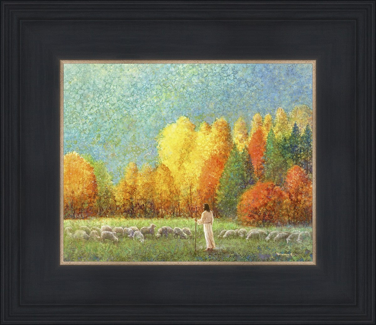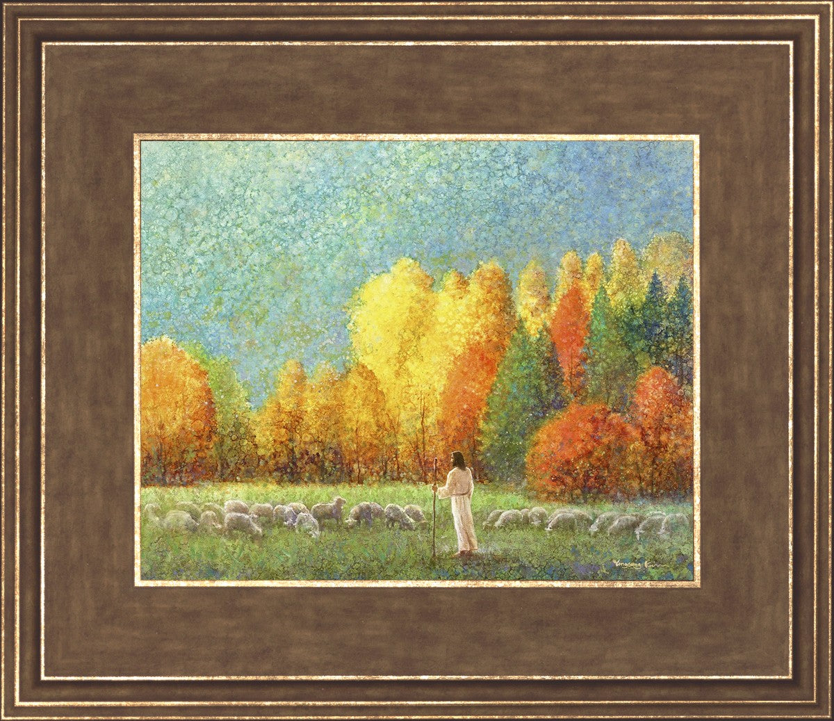 Changing Seasons by Yongsung Kim featuring Jesus Christ walking in a field watching over sheep surround by trees in the fall