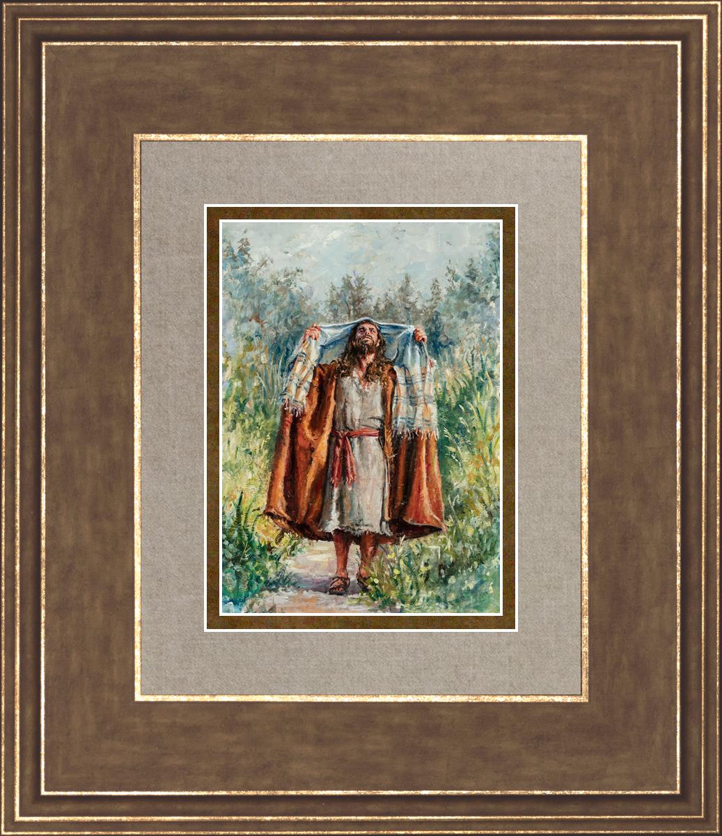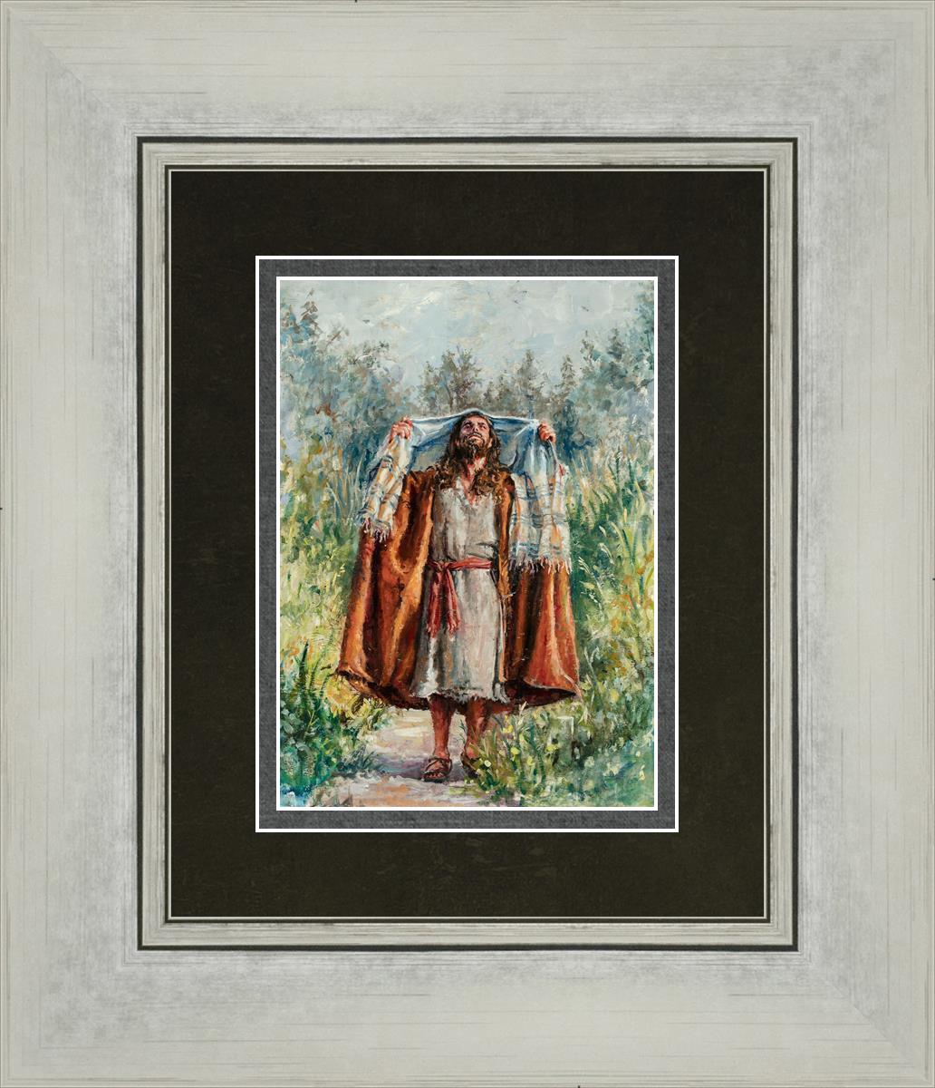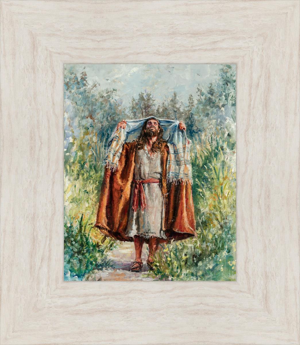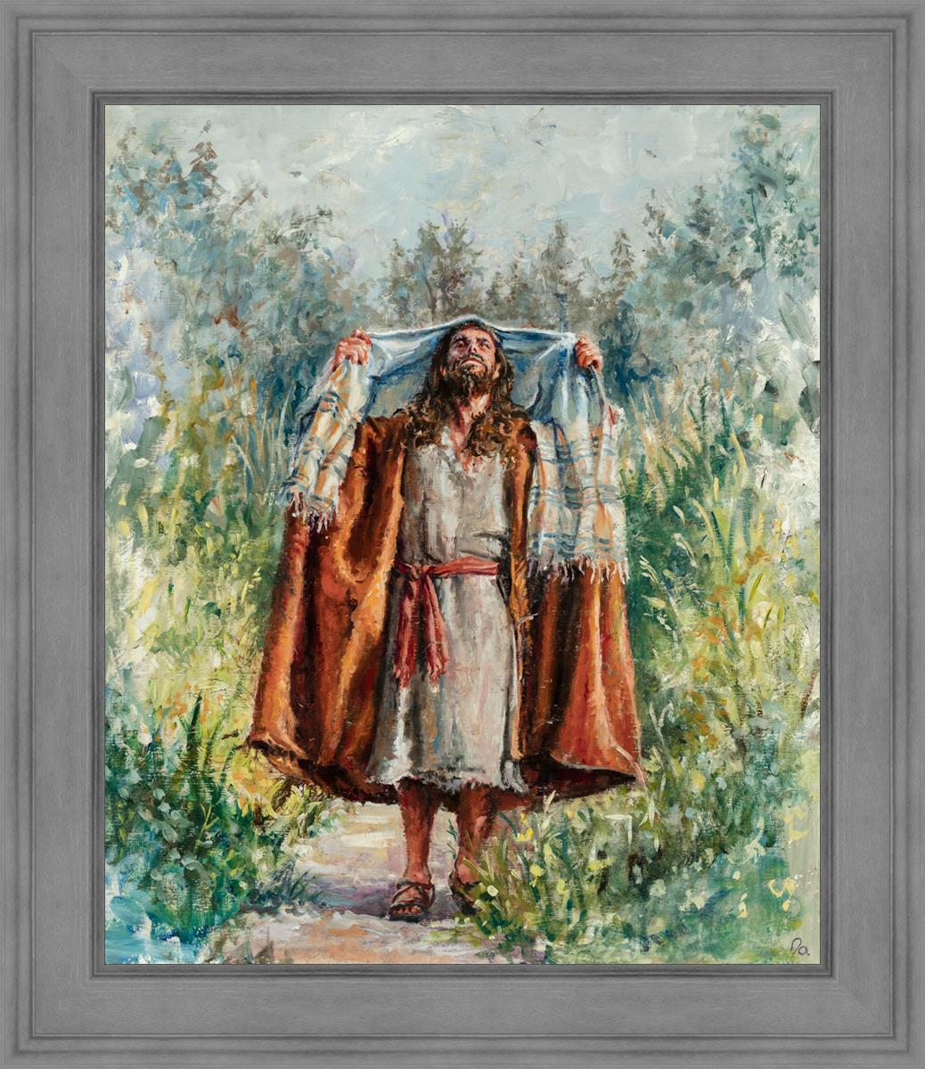 After His baptism, we have record that Christ went tint the wilderness to pray and prepare spiritually for his role as the Savior. This piece is depicting Him walking into the wilderness to meet with the Father, covering his head as he goes. This is important because in the Jewish tradition of the time, covering your head is a sign of showing respect and sacredness.
