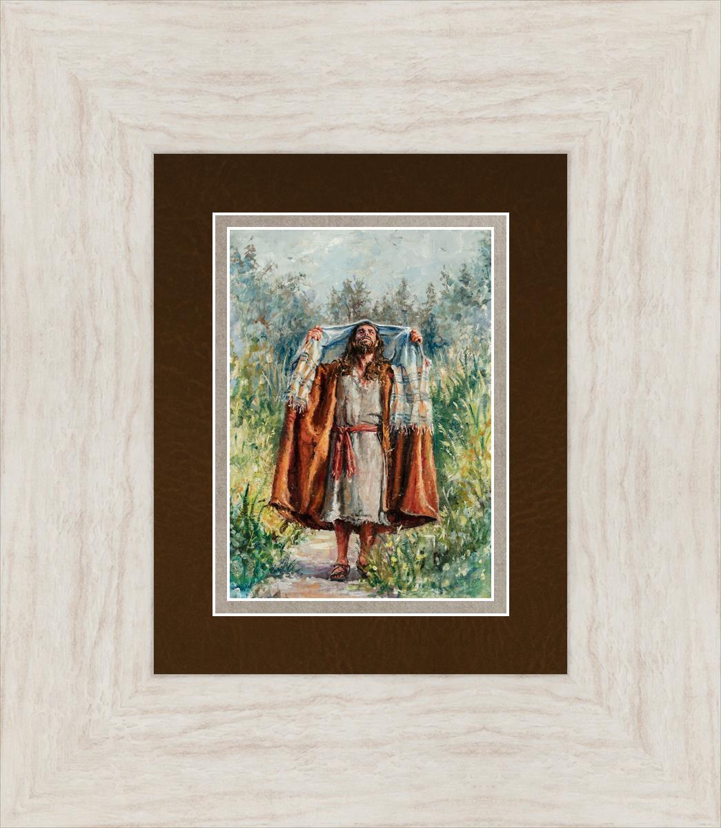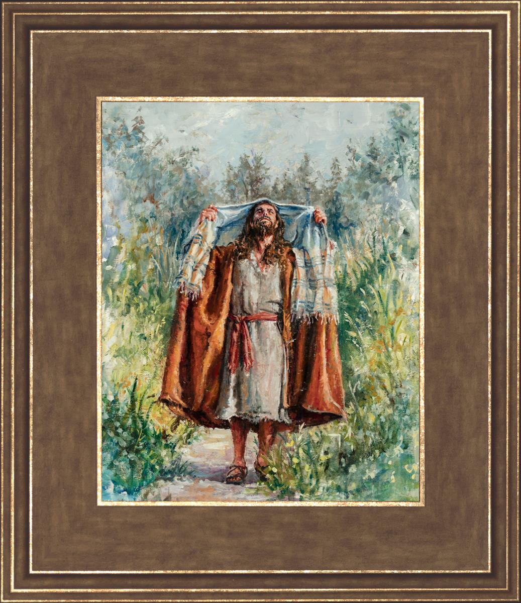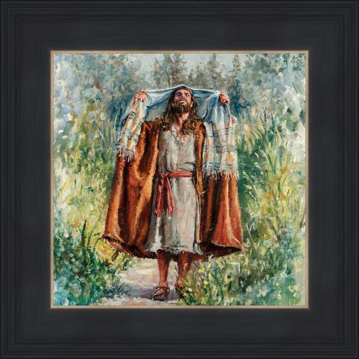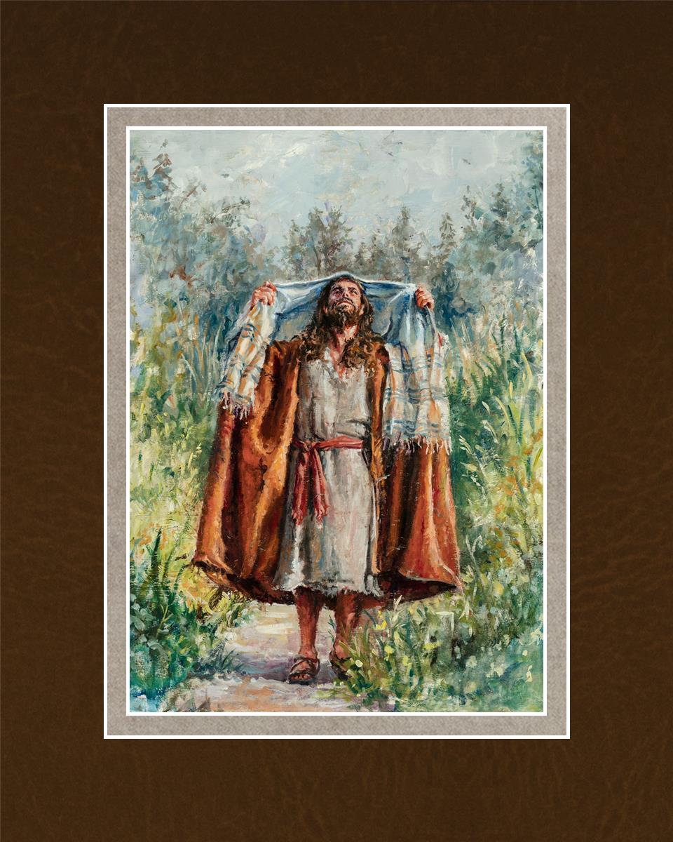 After His baptism, we have record that Christ went tint the wilderness to pray and prepare spiritually for his role as the Savior. This piece is depicting Him walking into the wilderness to meet with the Father, covering his head as he goes. This is important because in the Jewish tradition of the time, covering your head is a sign of showing respect and sacredness.