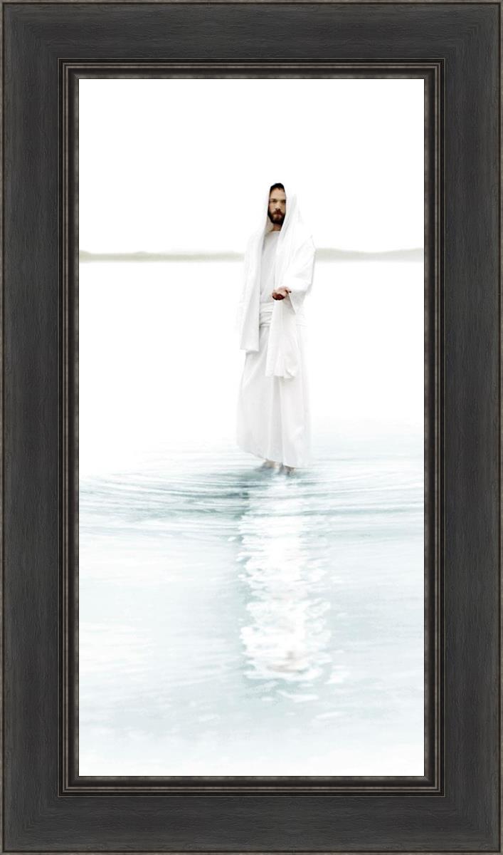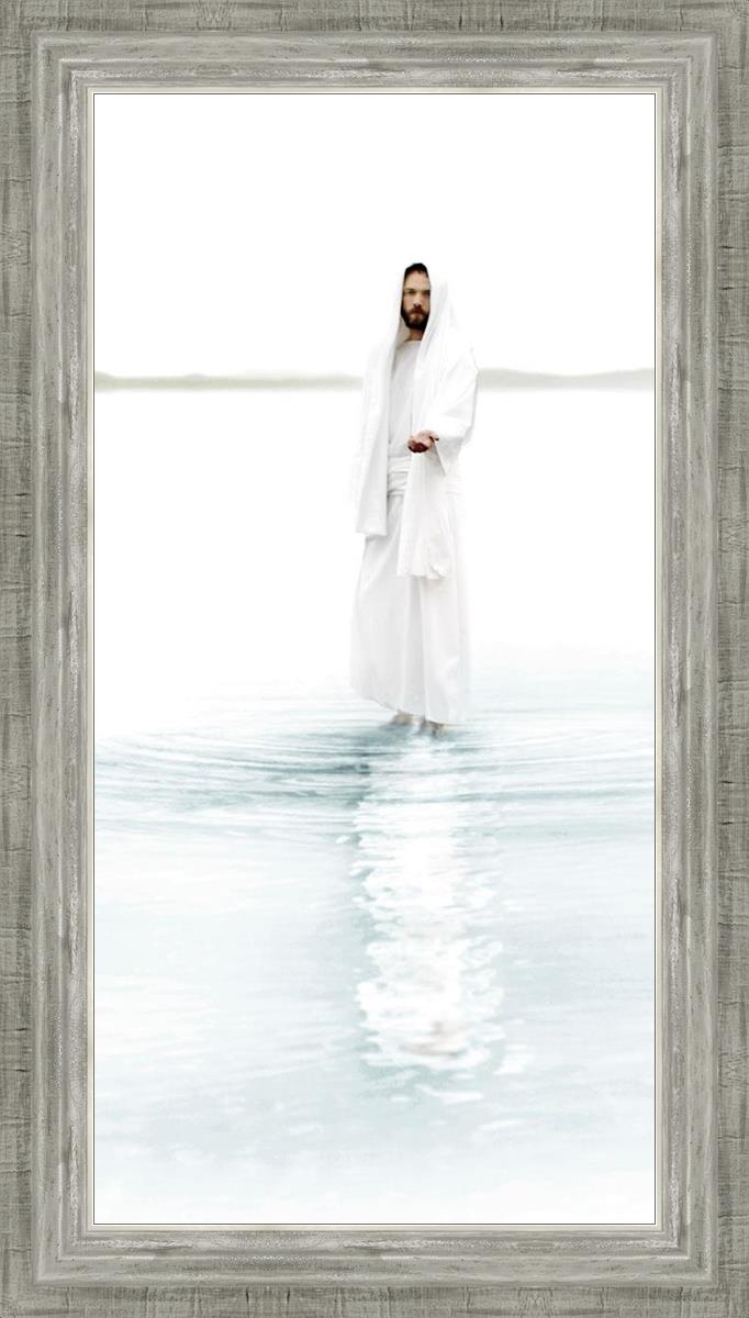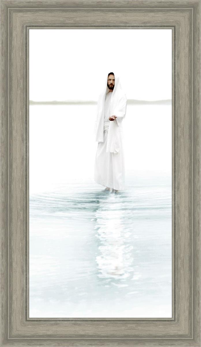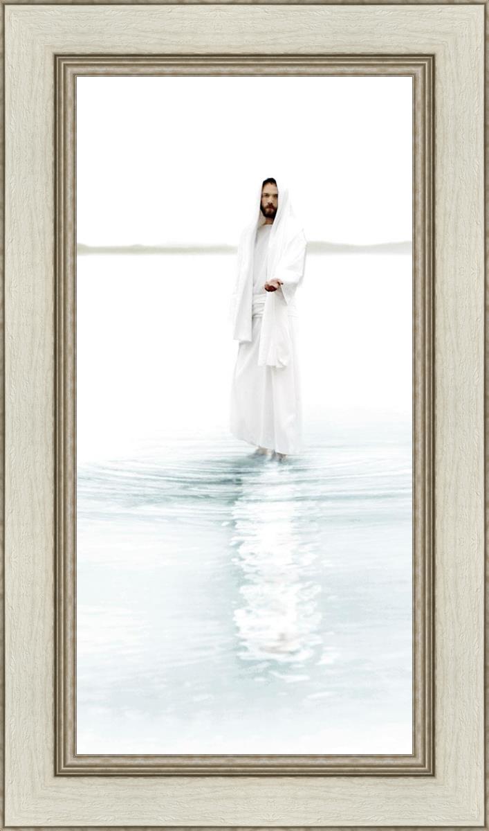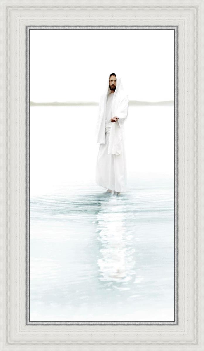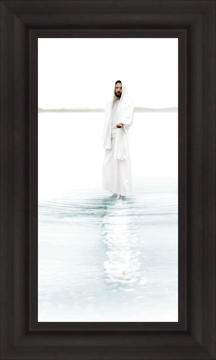 "Come and See Blue" by Scott Sumner showcases a striking mountain silhouette against a serene blue water backdrop, with Jesus Christ extending a welcoming hand, dressed in a white shawl and robe. This captivating artwork evokes a sense of spiritual invitation and tranquility, resonating with viewers seeking inspiration and a deeper connection to their faith journey.