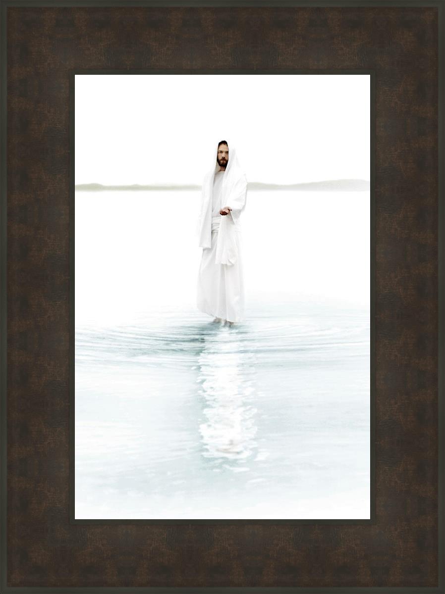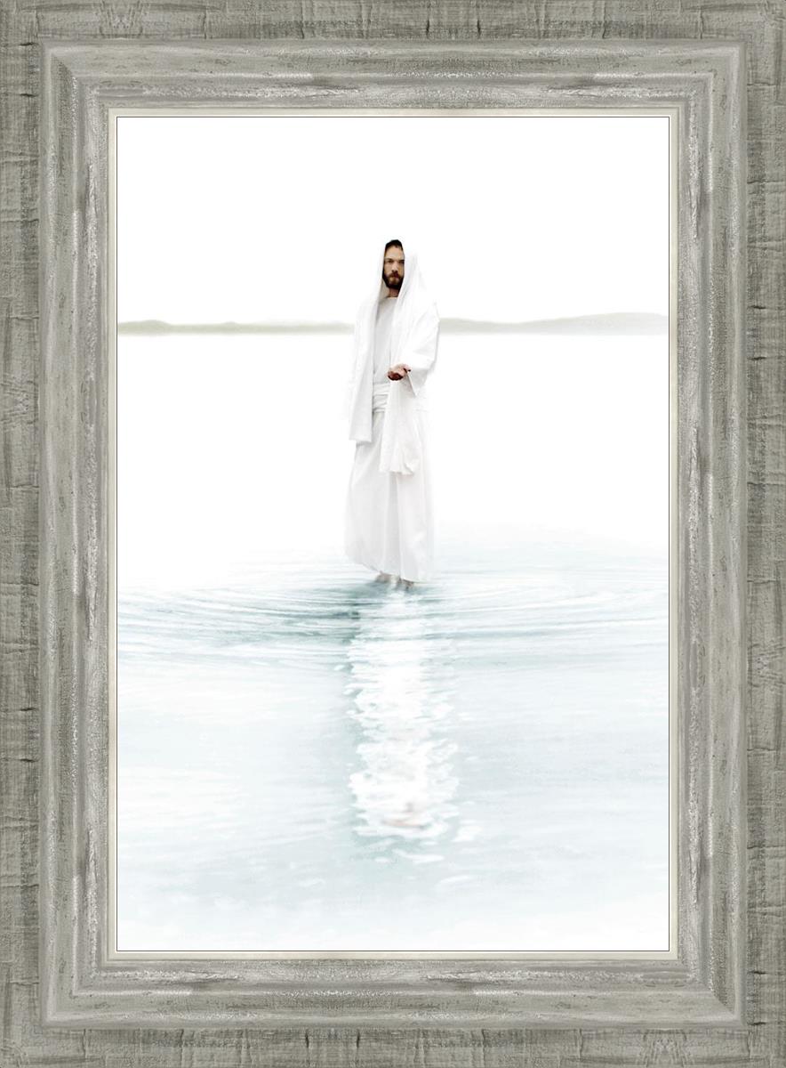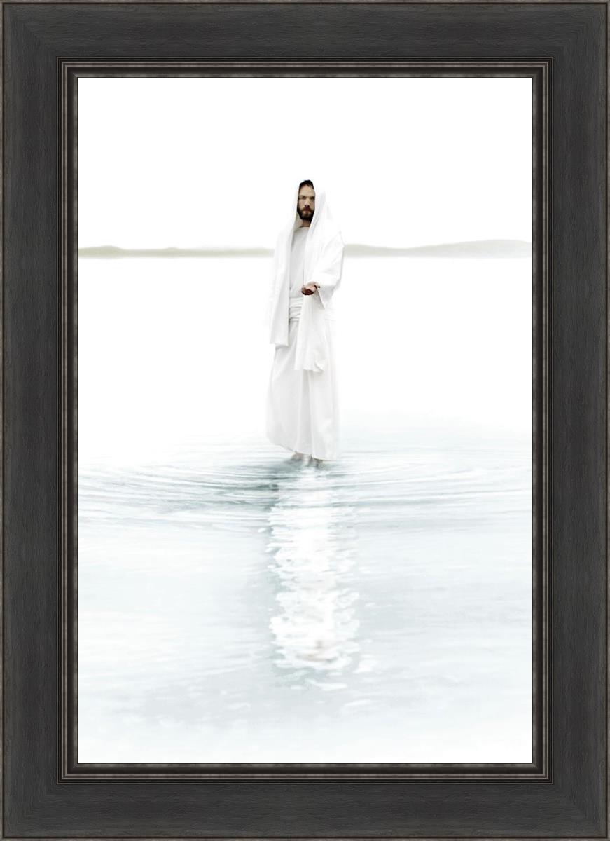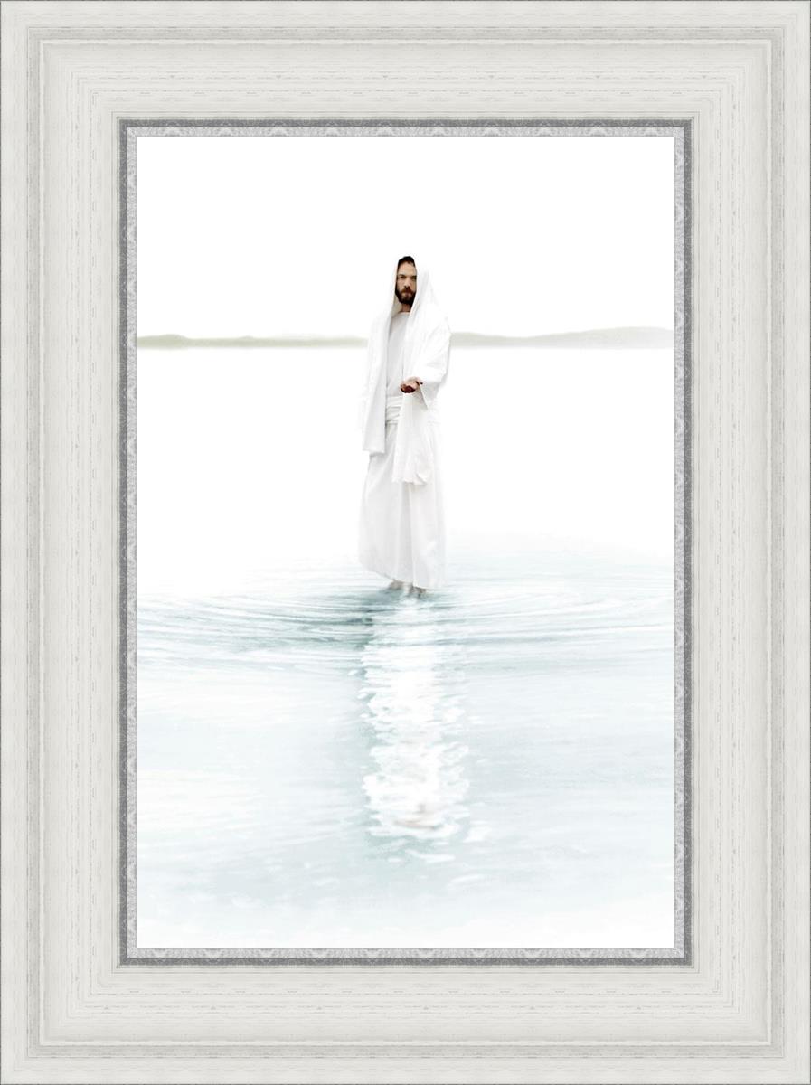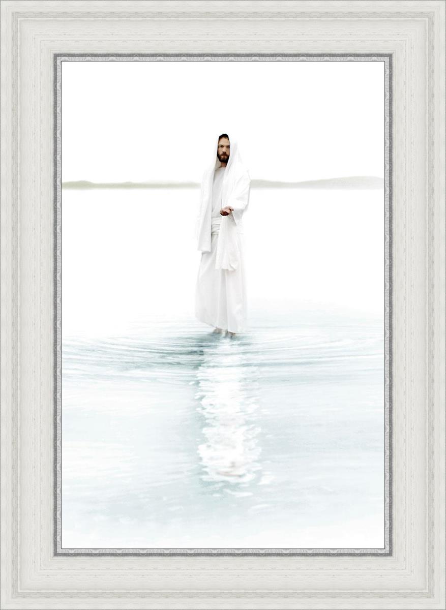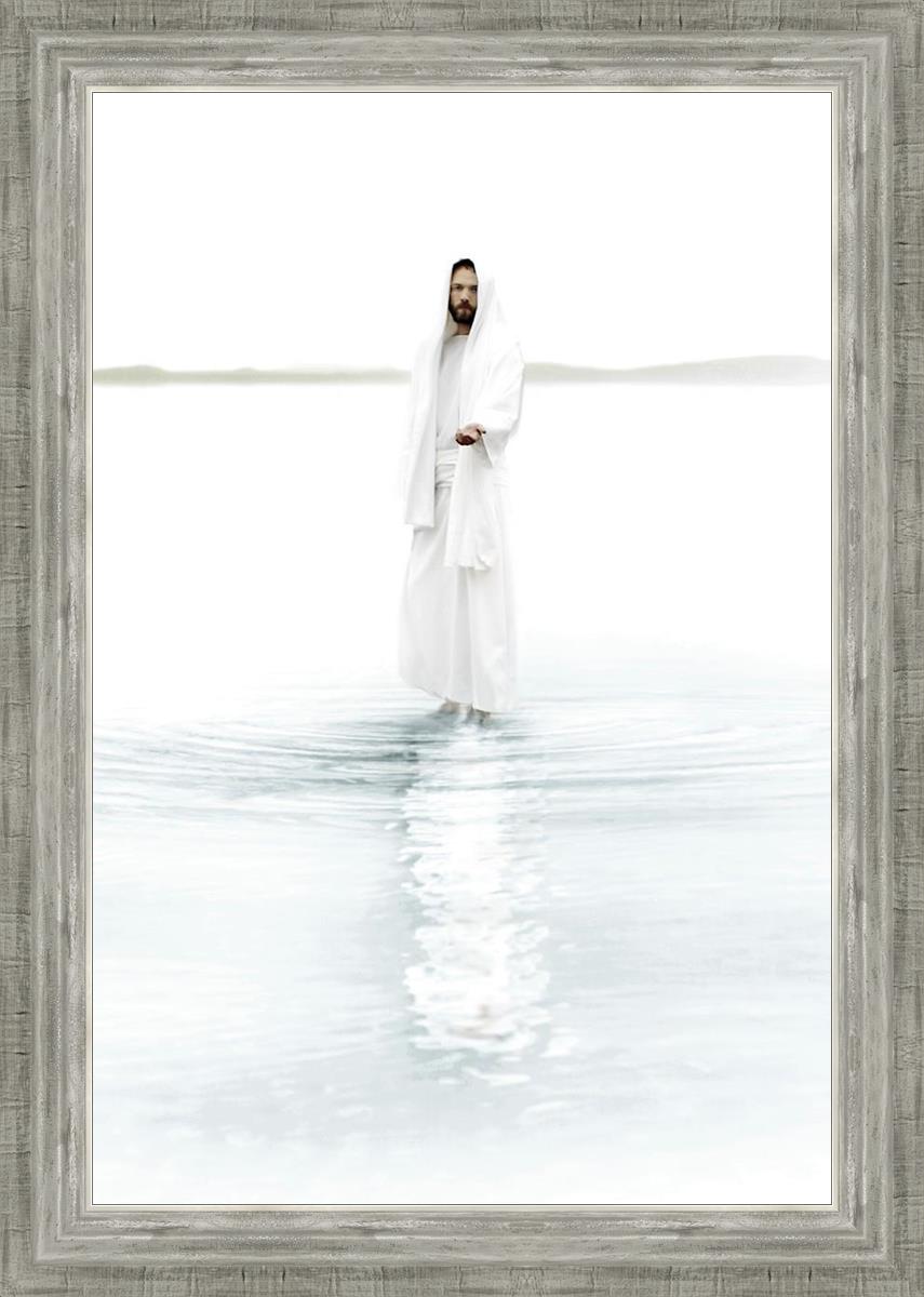 "Come and See Blue" by Scott Sumner showcases a striking mountain silhouette against a serene blue water backdrop, with Jesus Christ extending a welcoming hand, dressed in a white shawl and robe. This captivating artwork evokes a sense of spiritual invitation and tranquility, resonating with viewers seeking inspiration and a deeper connection to their faith journey.