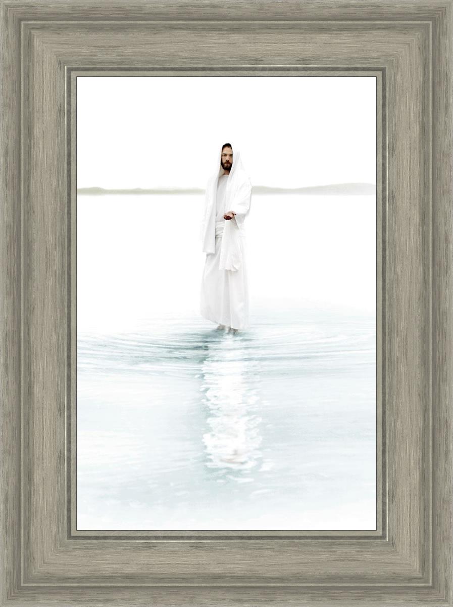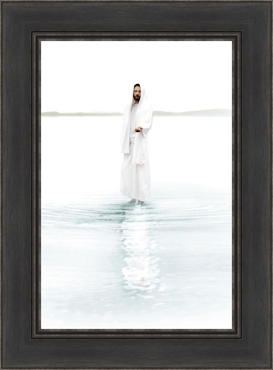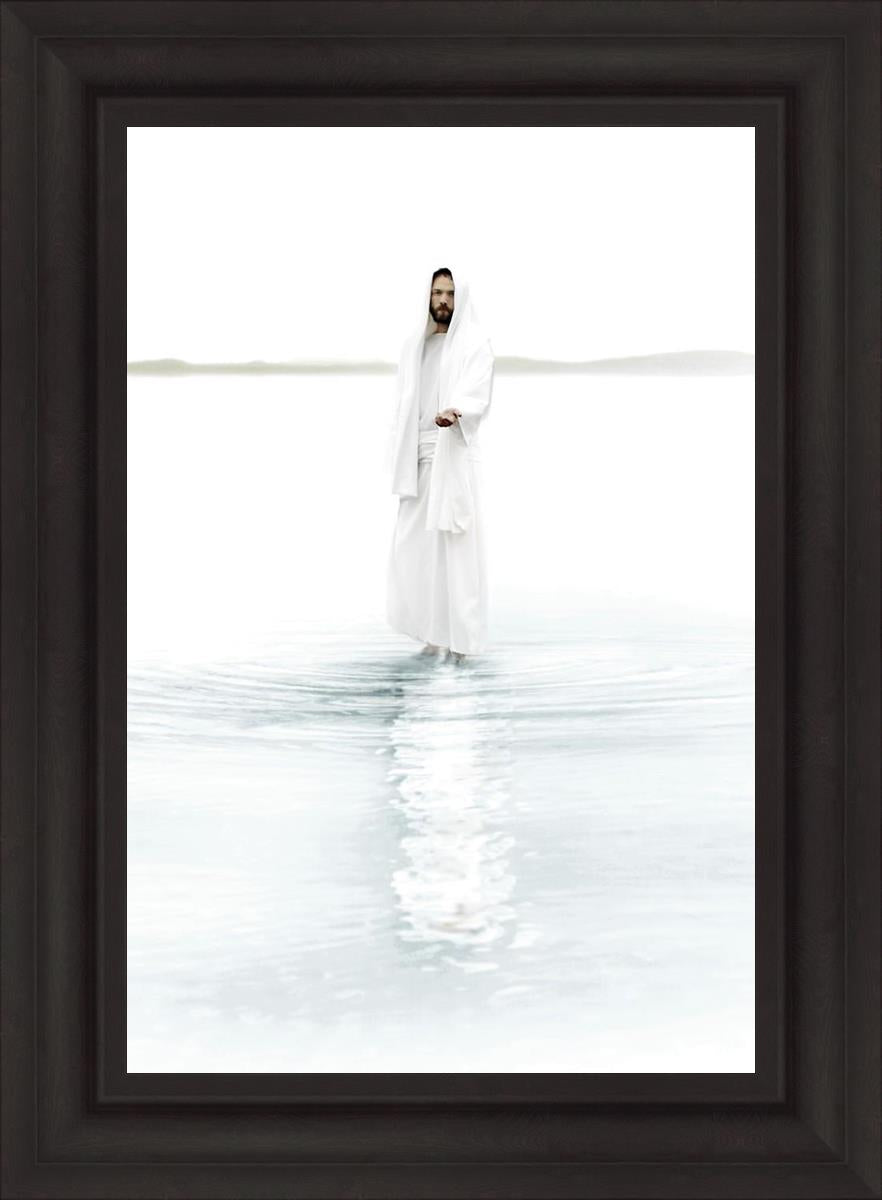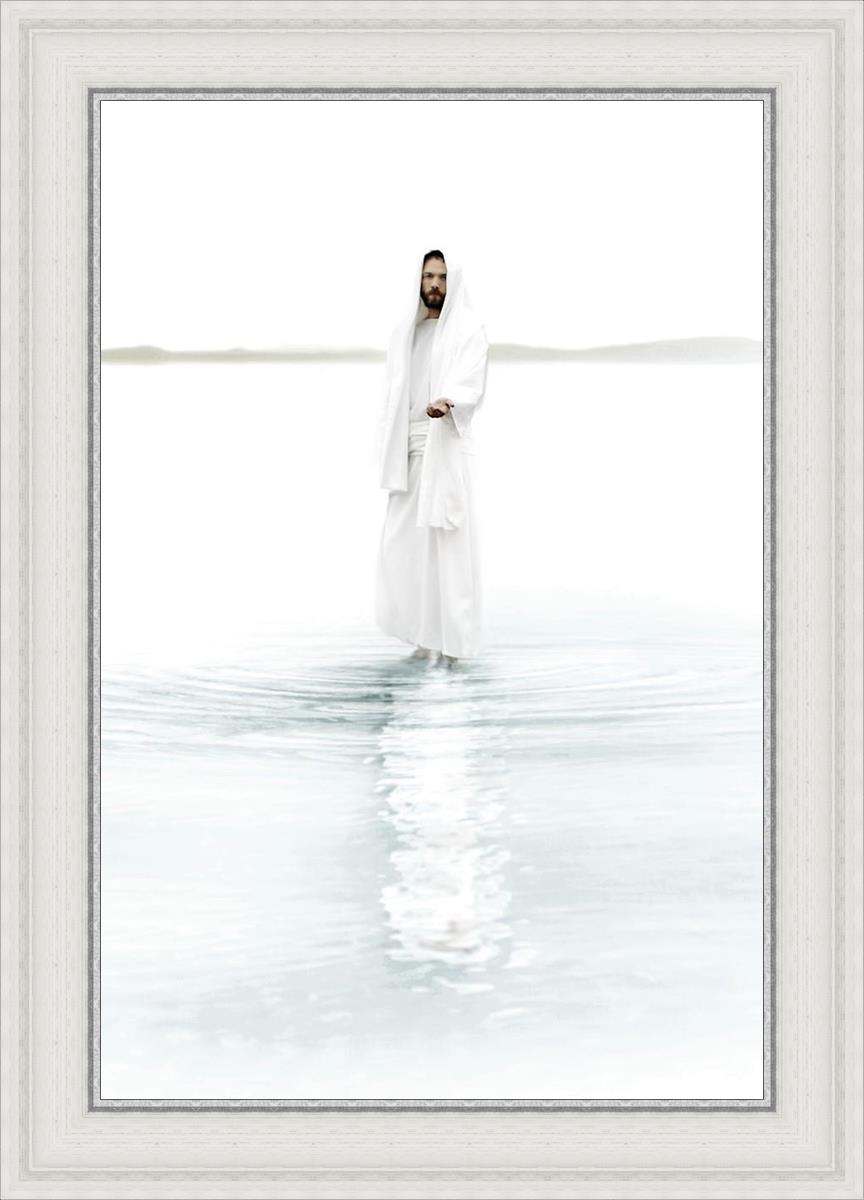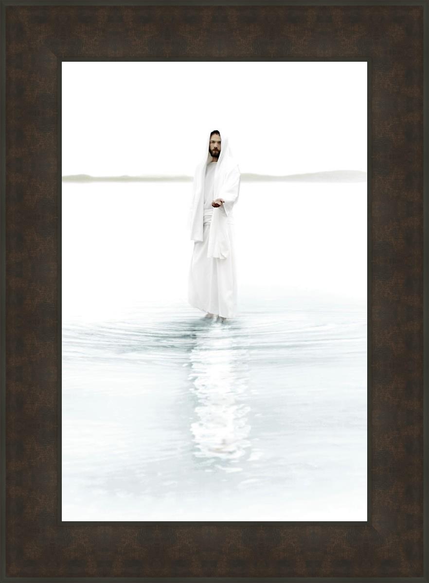 "Come and See Blue" by Scott Sumner showcases a striking mountain silhouette against a serene blue water backdrop, with Jesus Christ extending a welcoming hand, dressed in a white shawl and robe. This captivating artwork evokes a sense of spiritual invitation and tranquility, resonating with viewers seeking inspiration and a deeper connection to their faith journey.