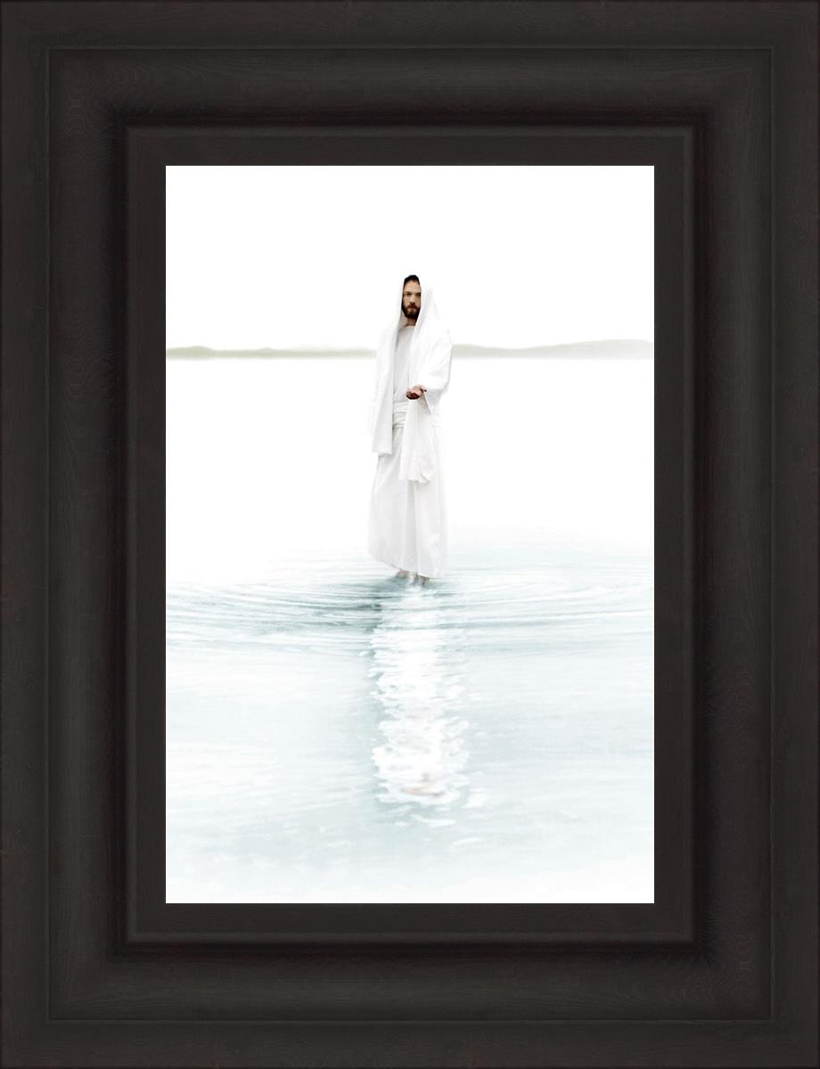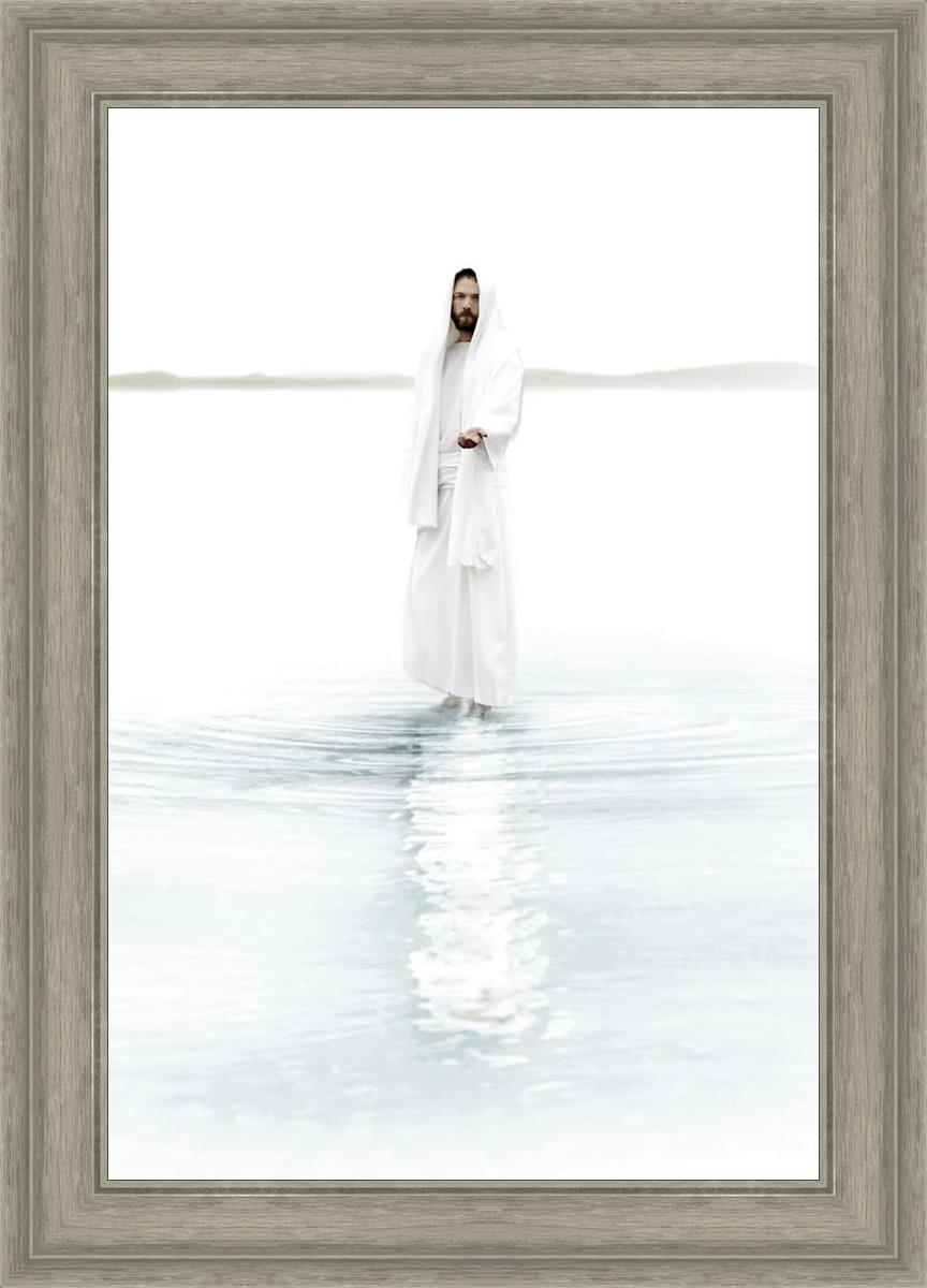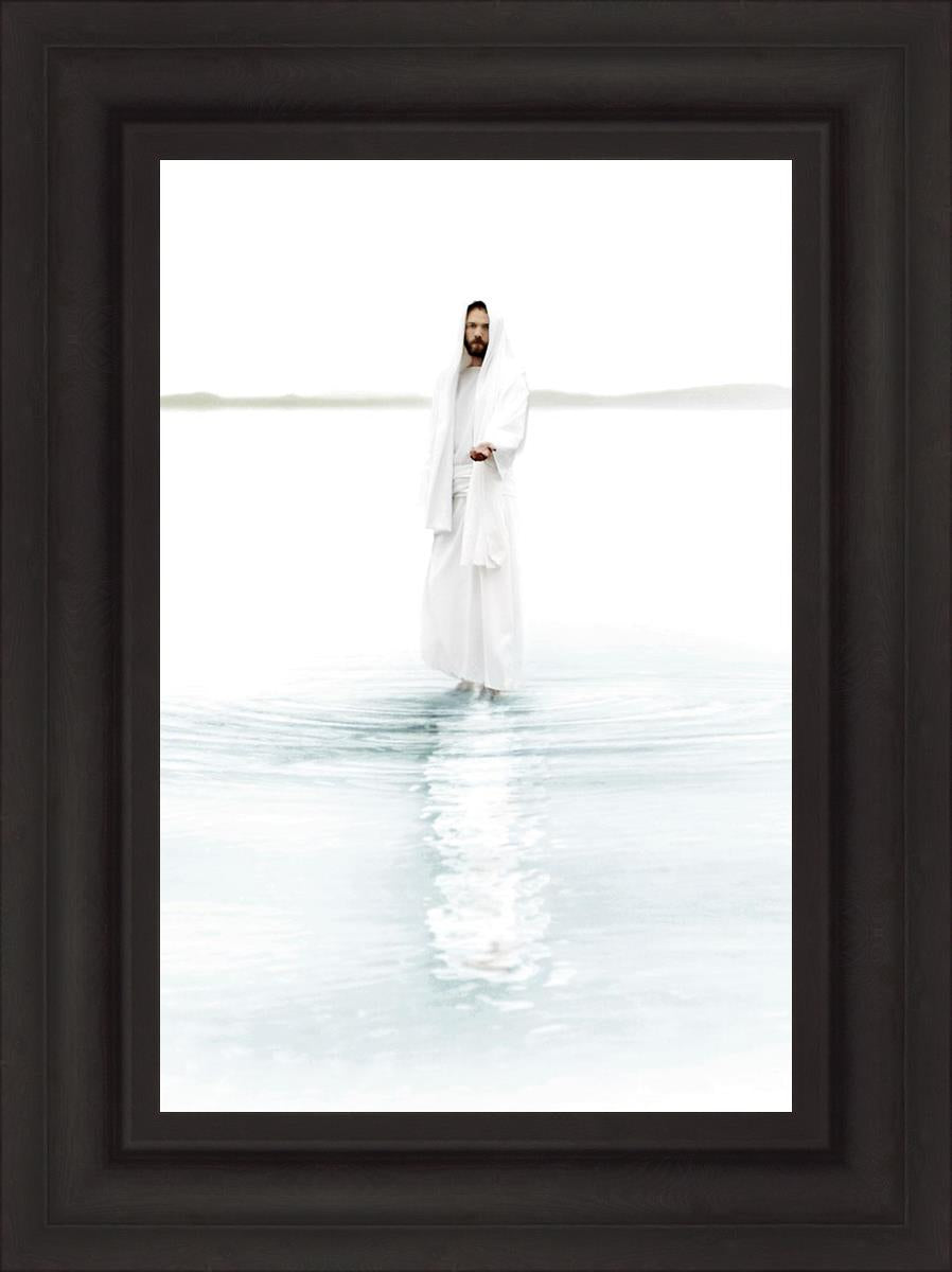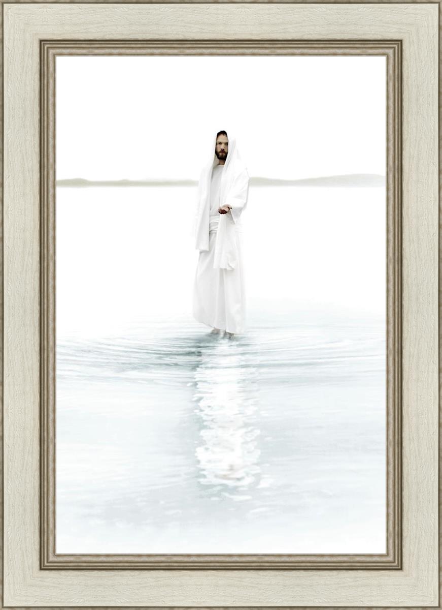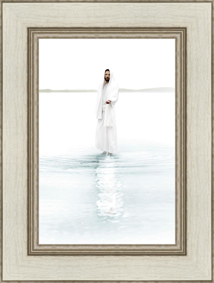 "Come and See Blue" by Scott Sumner showcases a striking mountain silhouette against a serene blue water backdrop, with Jesus Christ extending a welcoming hand, dressed in a white shawl and robe. This captivating artwork evokes a sense of spiritual invitation and tranquility, resonating with viewers seeking inspiration and a deeper connection to their faith journey.