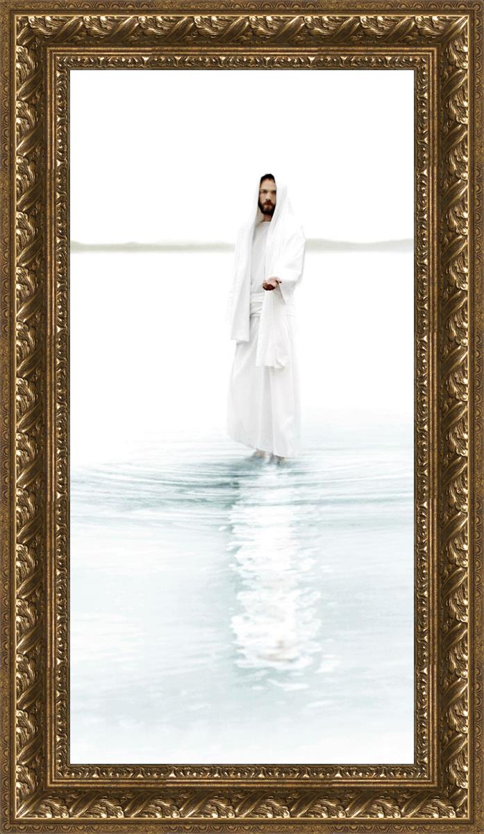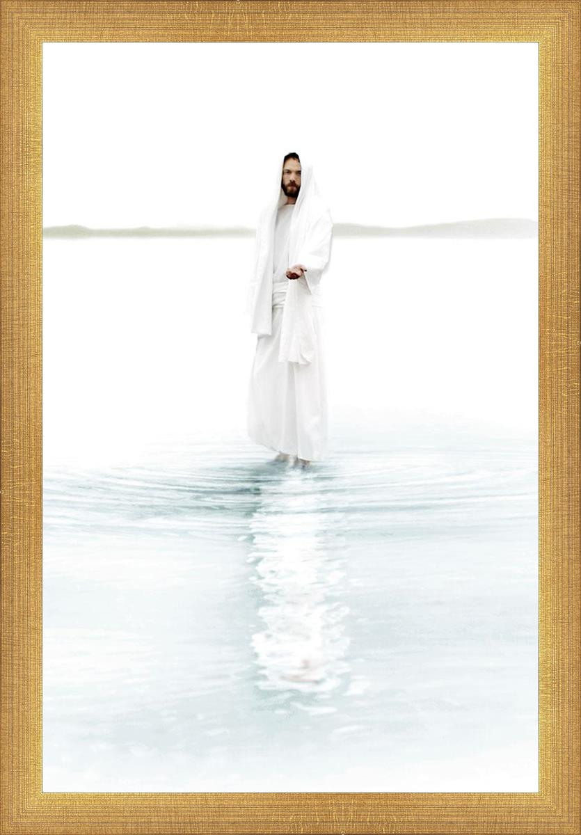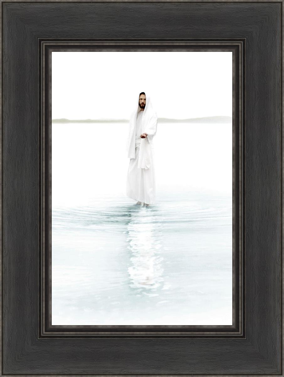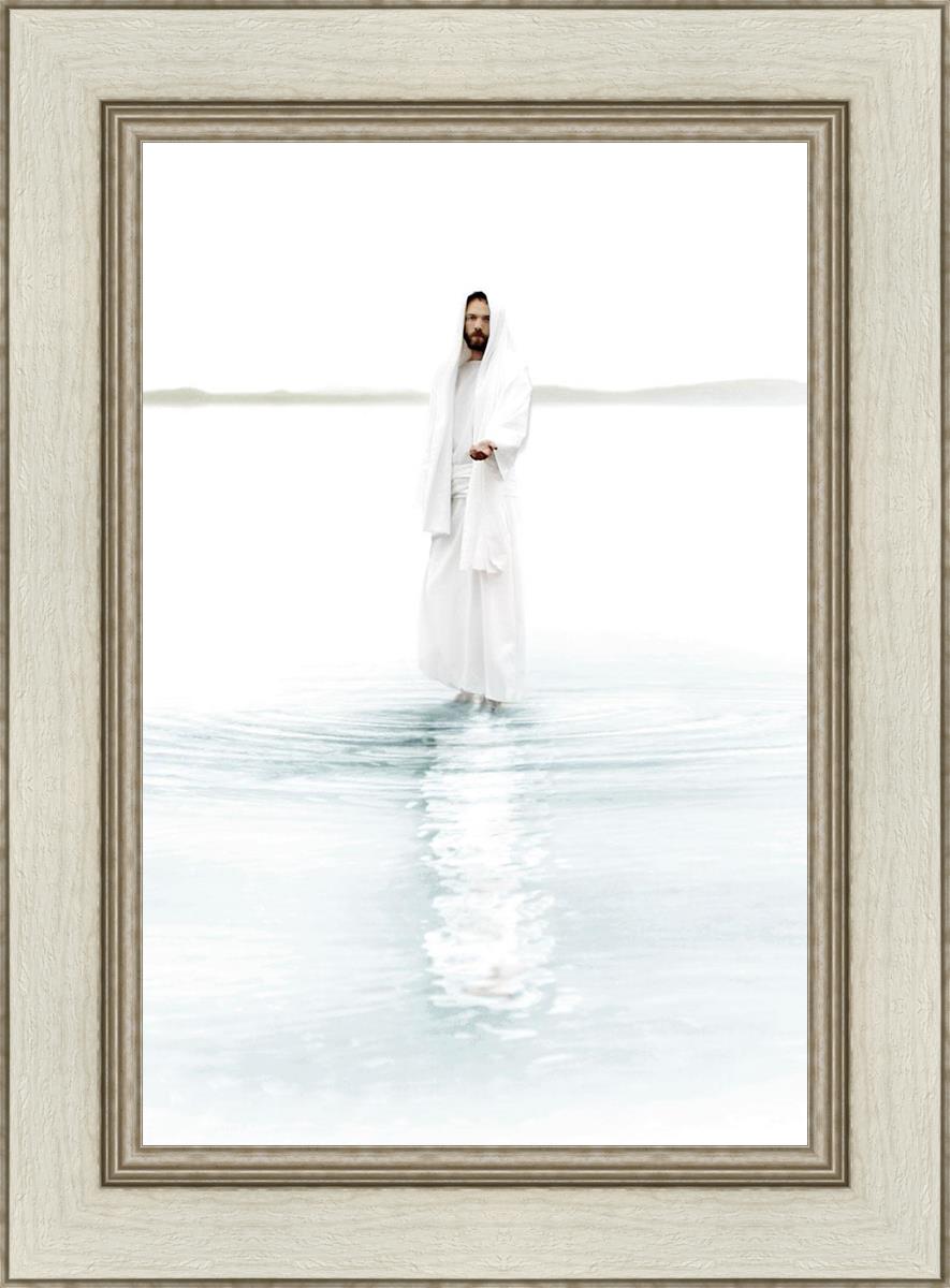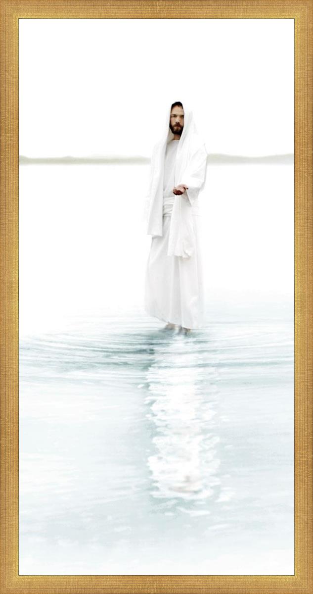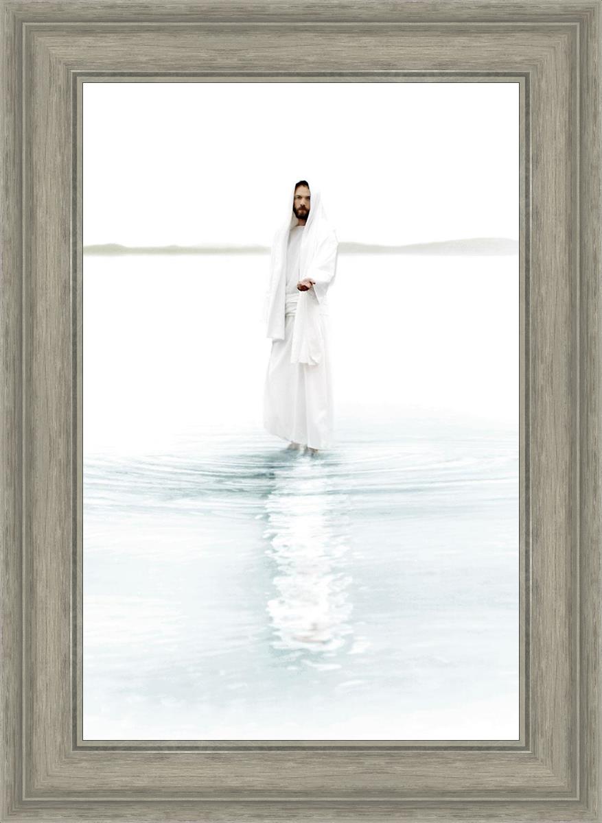 "Come and See Blue" by Scott Sumner showcases a striking mountain silhouette against a serene blue water backdrop, with Jesus Christ extending a welcoming hand, dressed in a white shawl and robe. This captivating artwork evokes a sense of spiritual invitation and tranquility, resonating with viewers seeking inspiration and a deeper connection to their faith journey.