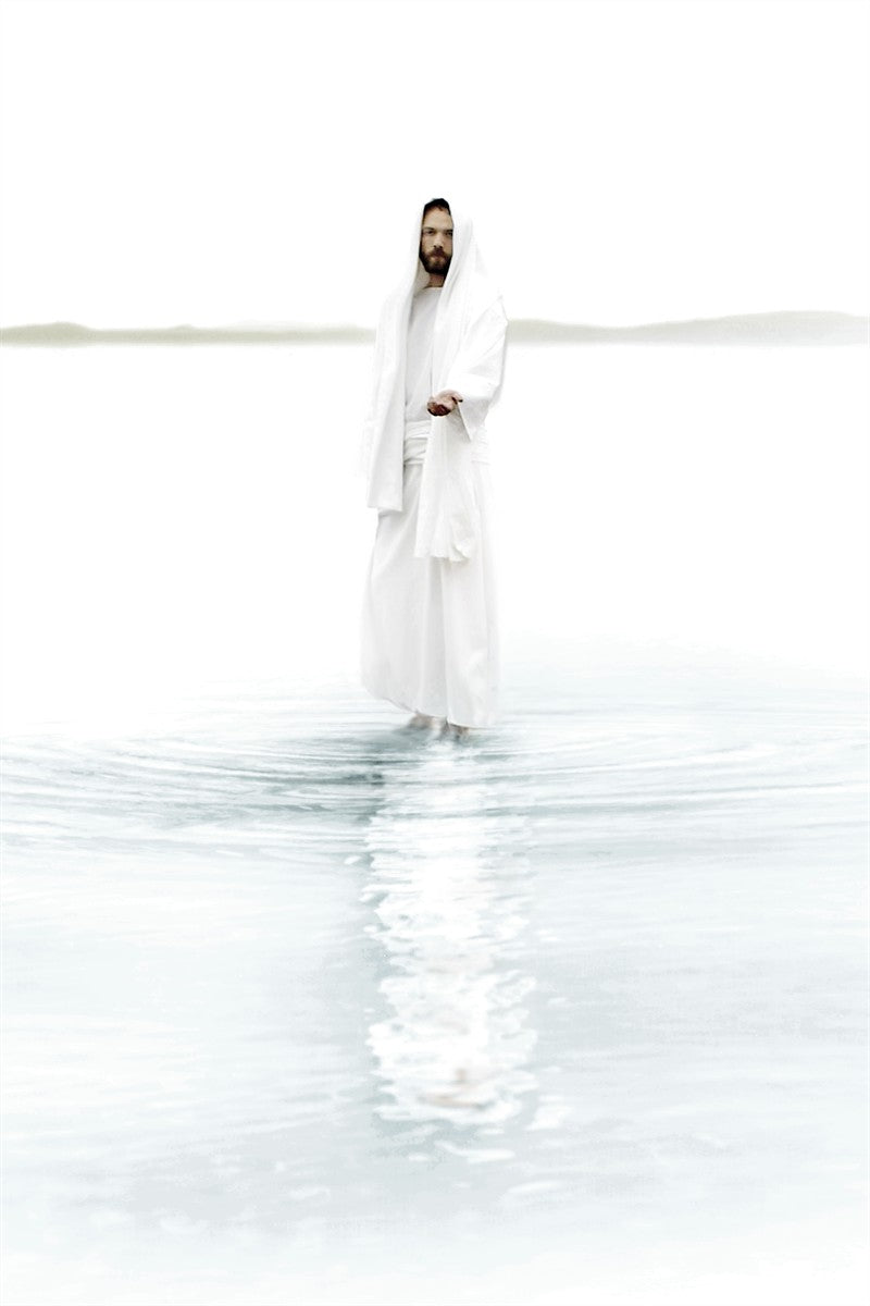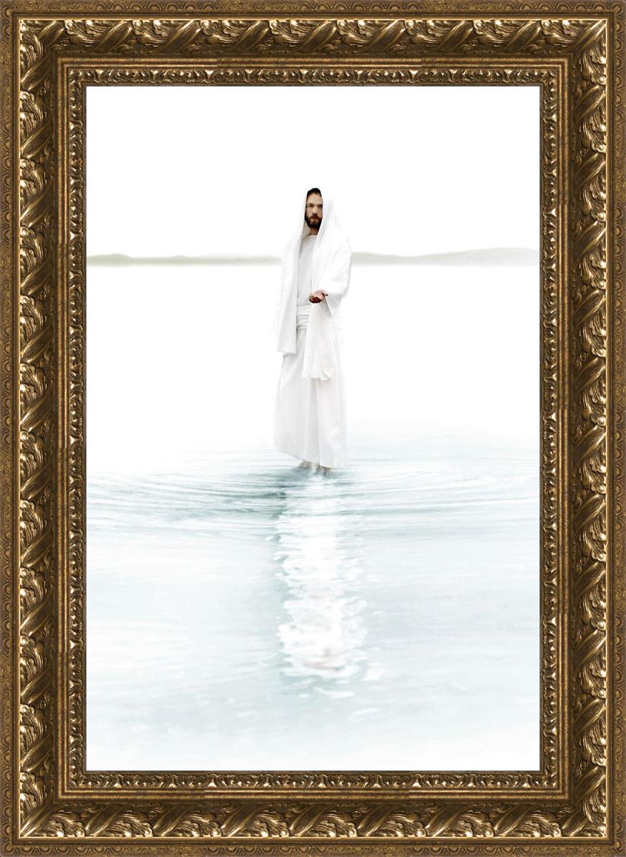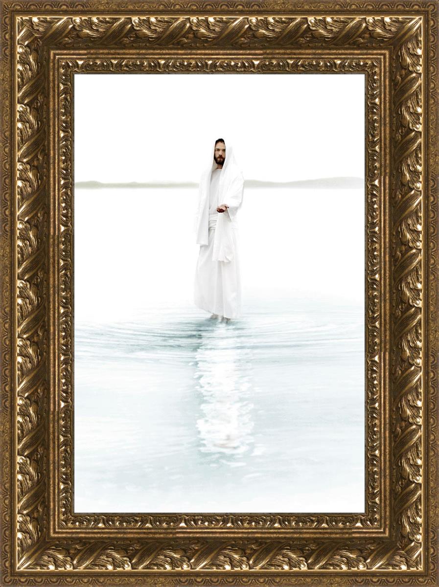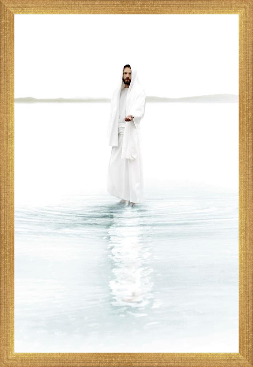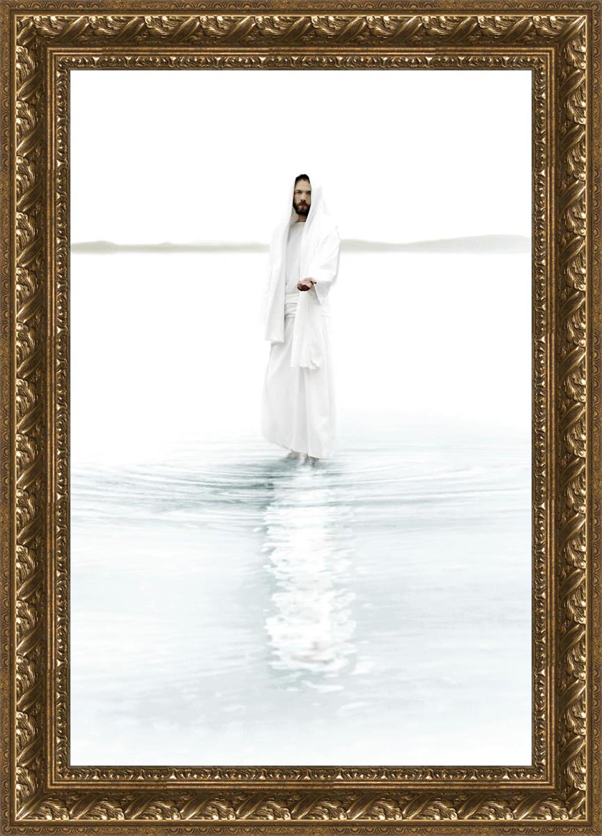 "Come and See Blue" by Scott Sumner showcases a striking mountain silhouette against a serene blue water backdrop, with Jesus Christ extending a welcoming hand, dressed in a white shawl and robe. This captivating artwork evokes a sense of spiritual invitation and tranquility, resonating with viewers seeking inspiration and a deeper connection to their faith journey.