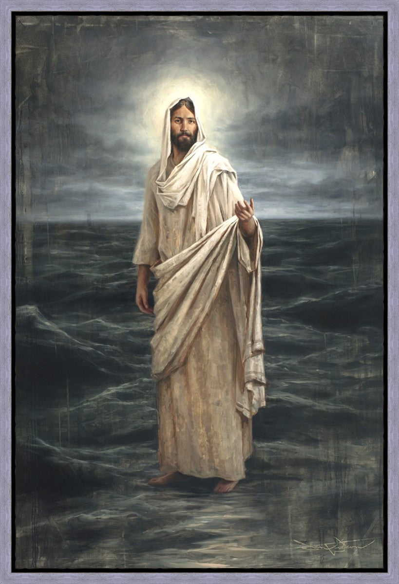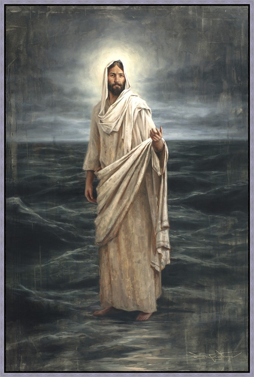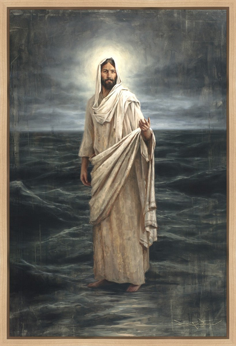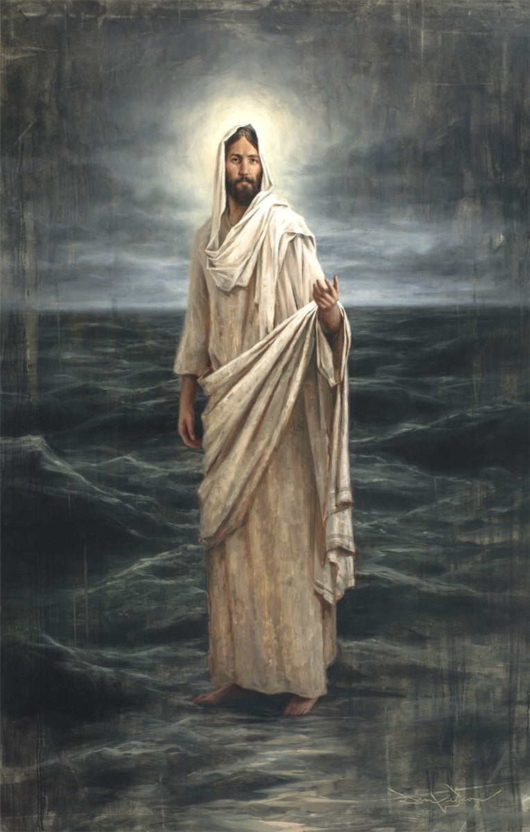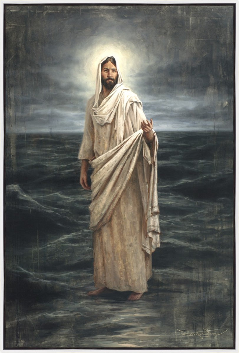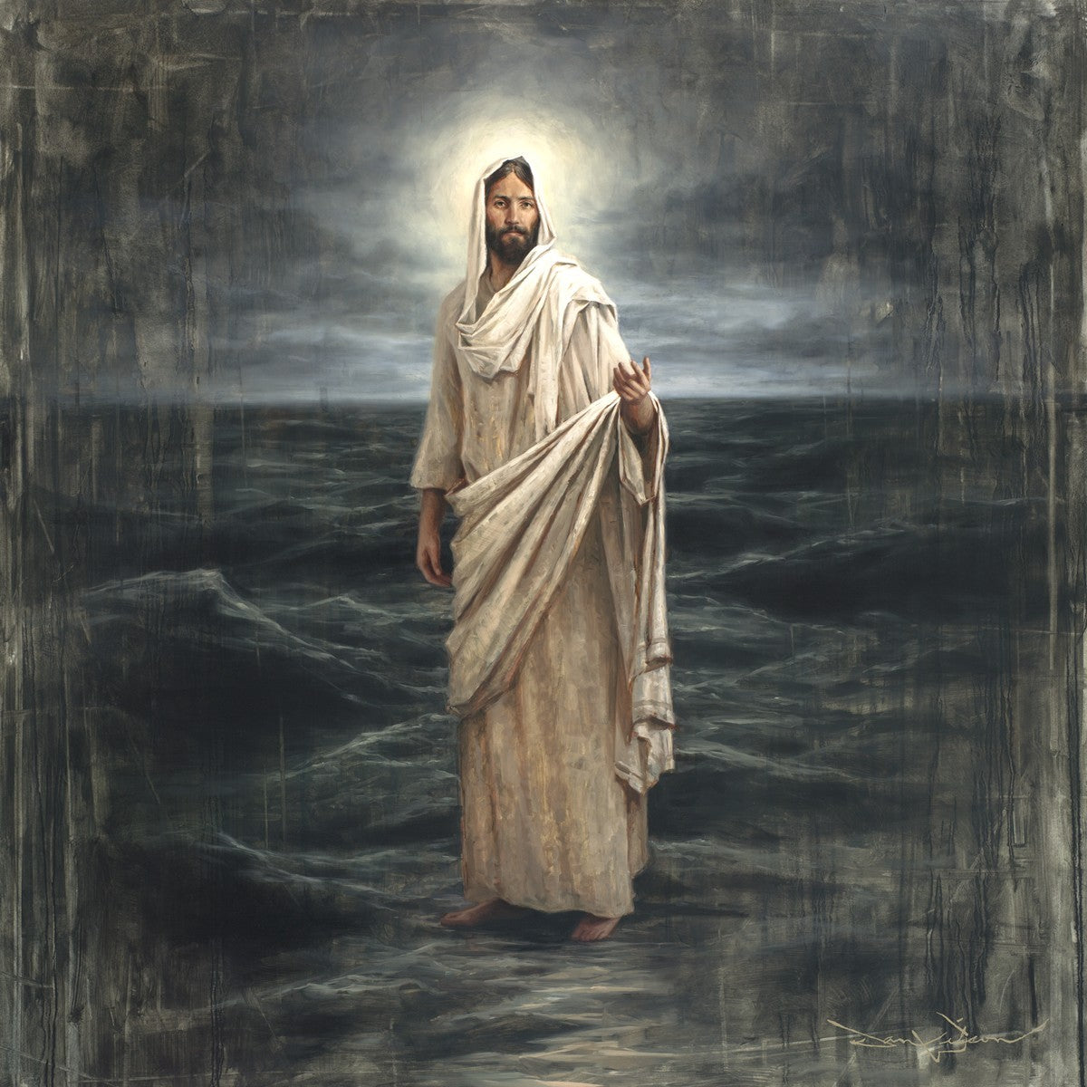 "Come, Be Not Afraid" by Dan Wilson depicts Jesus Christ walking on stormy waters, extending a reassuring hand amid rain, be ye not afraid.