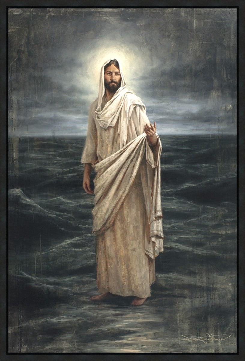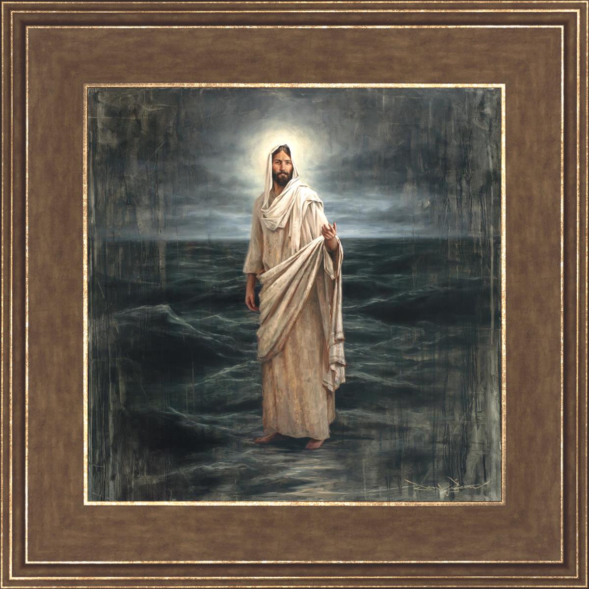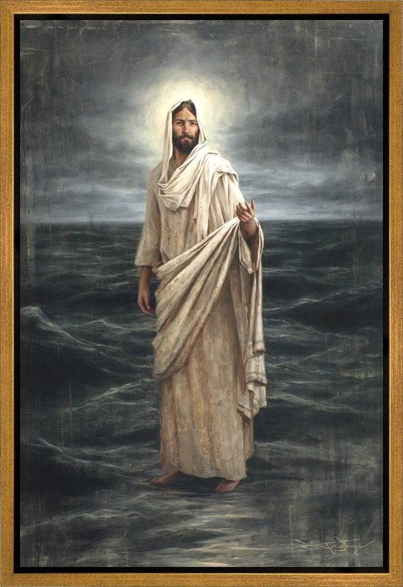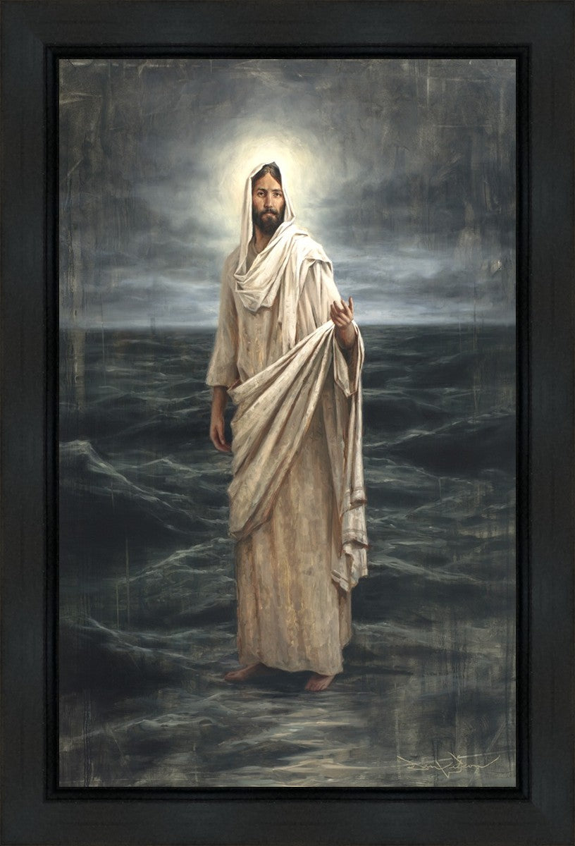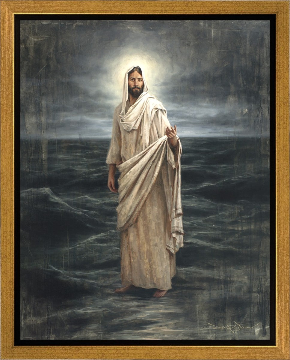 "Come, Be Not Afraid" by Dan Wilson depicts Jesus Christ walking on stormy waters, extending a reassuring hand amid rain, be ye not afraid.