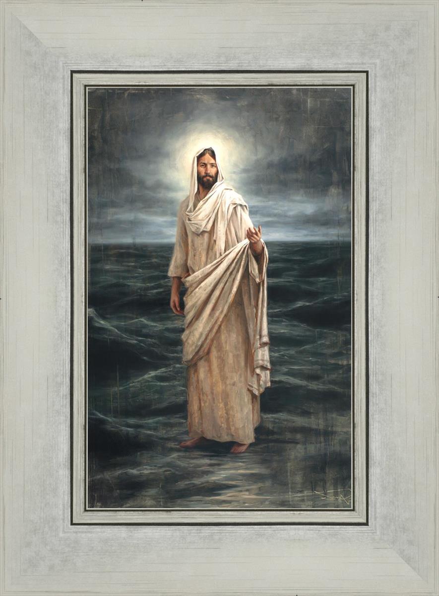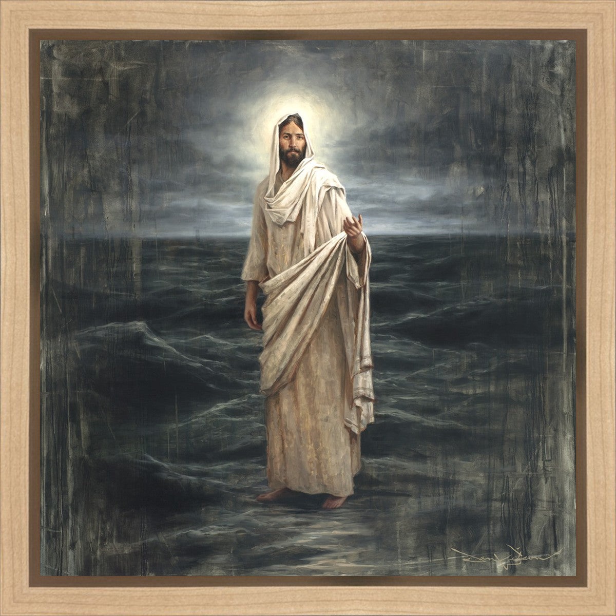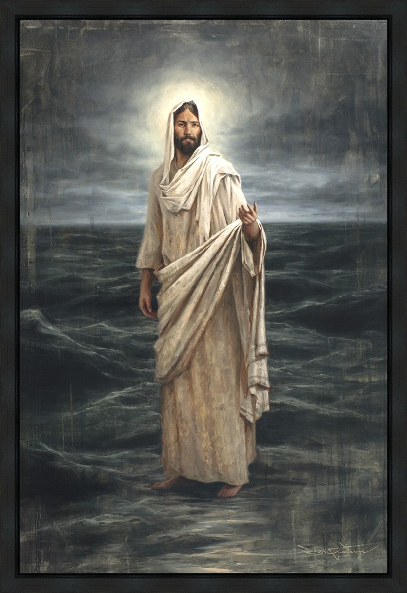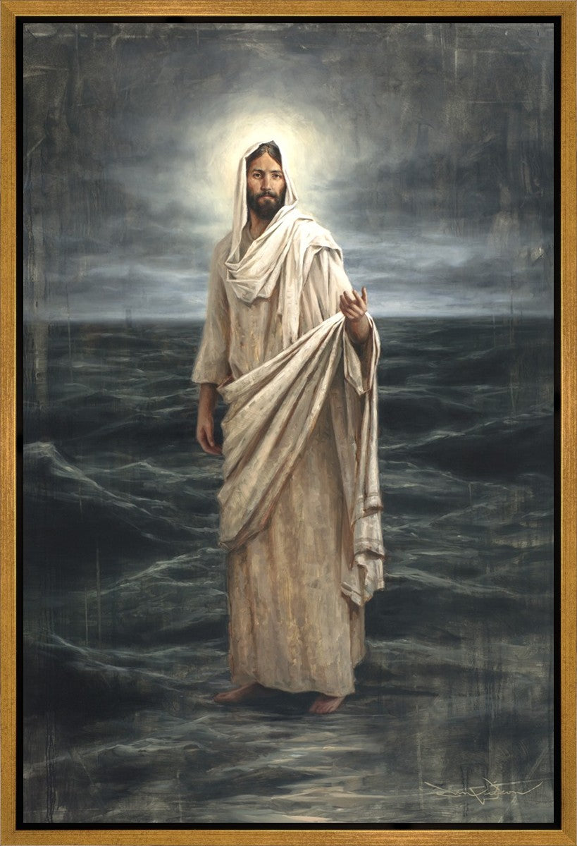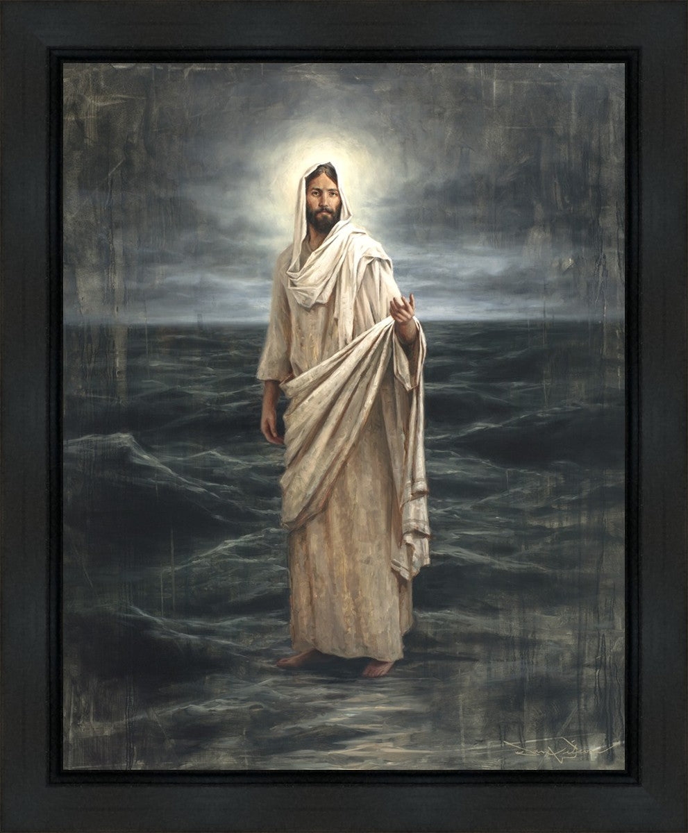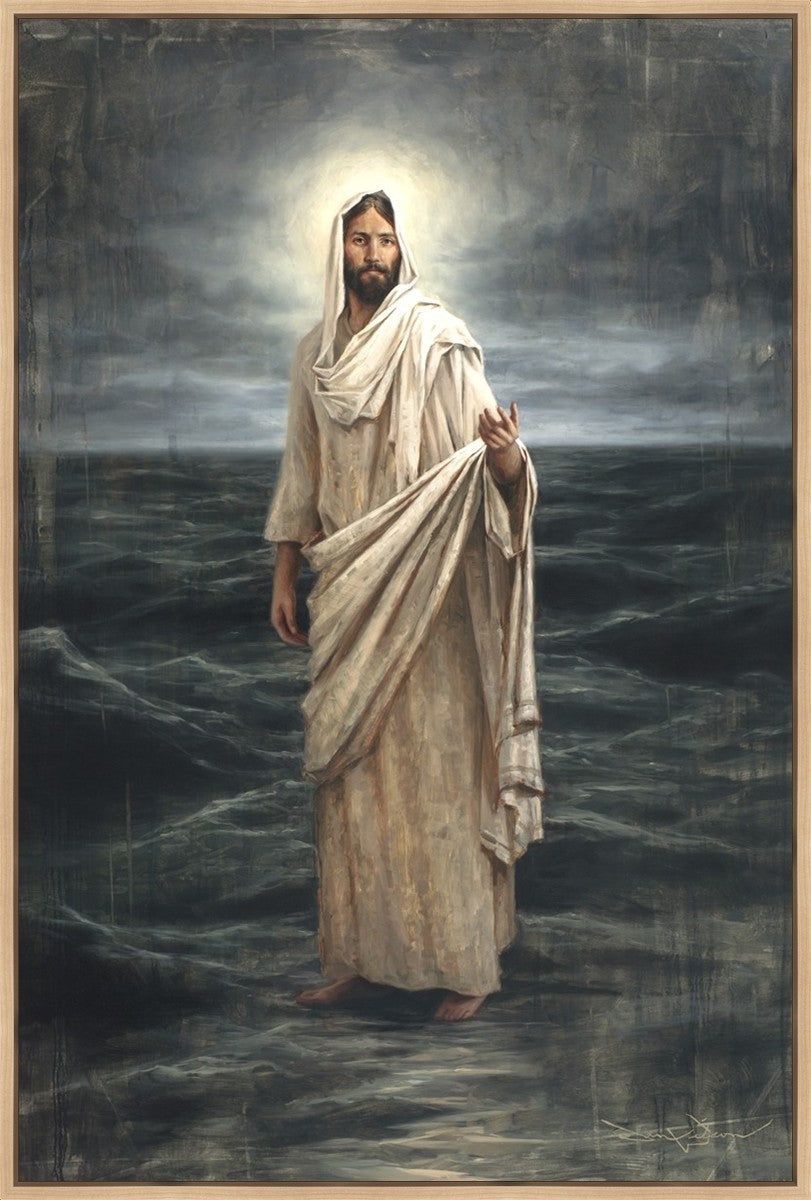 "Come, Be Not Afraid" by Dan Wilson depicts Jesus Christ walking on stormy waters, extending a reassuring hand amid rain, be ye not afraid.