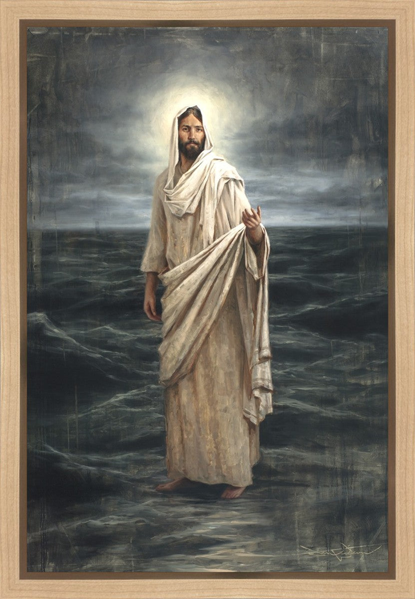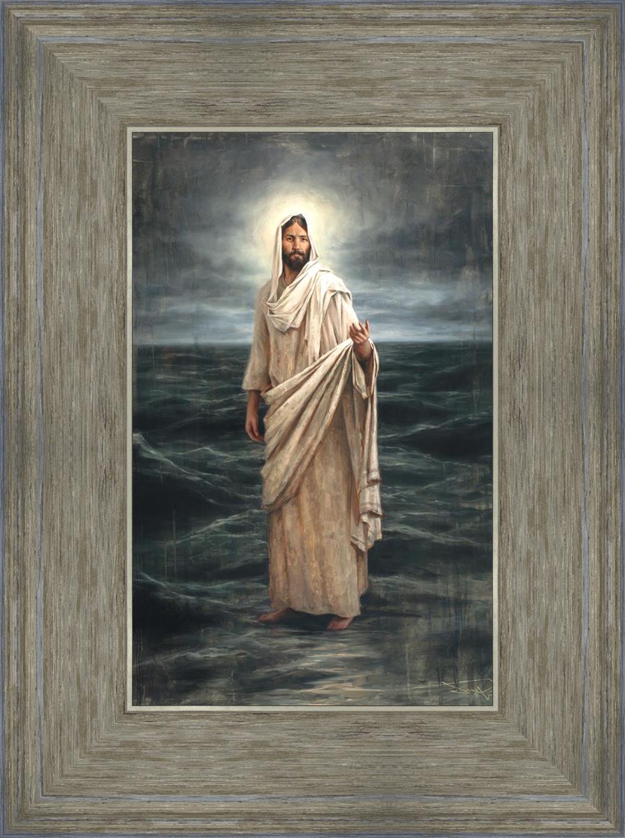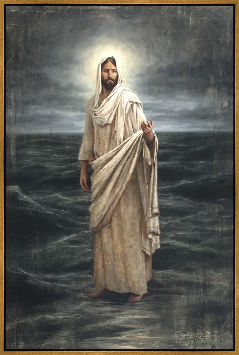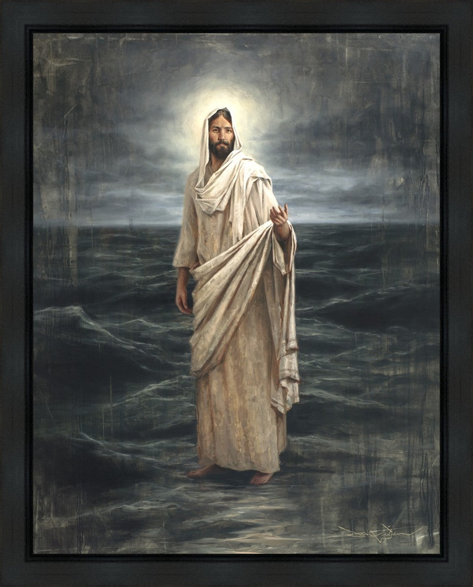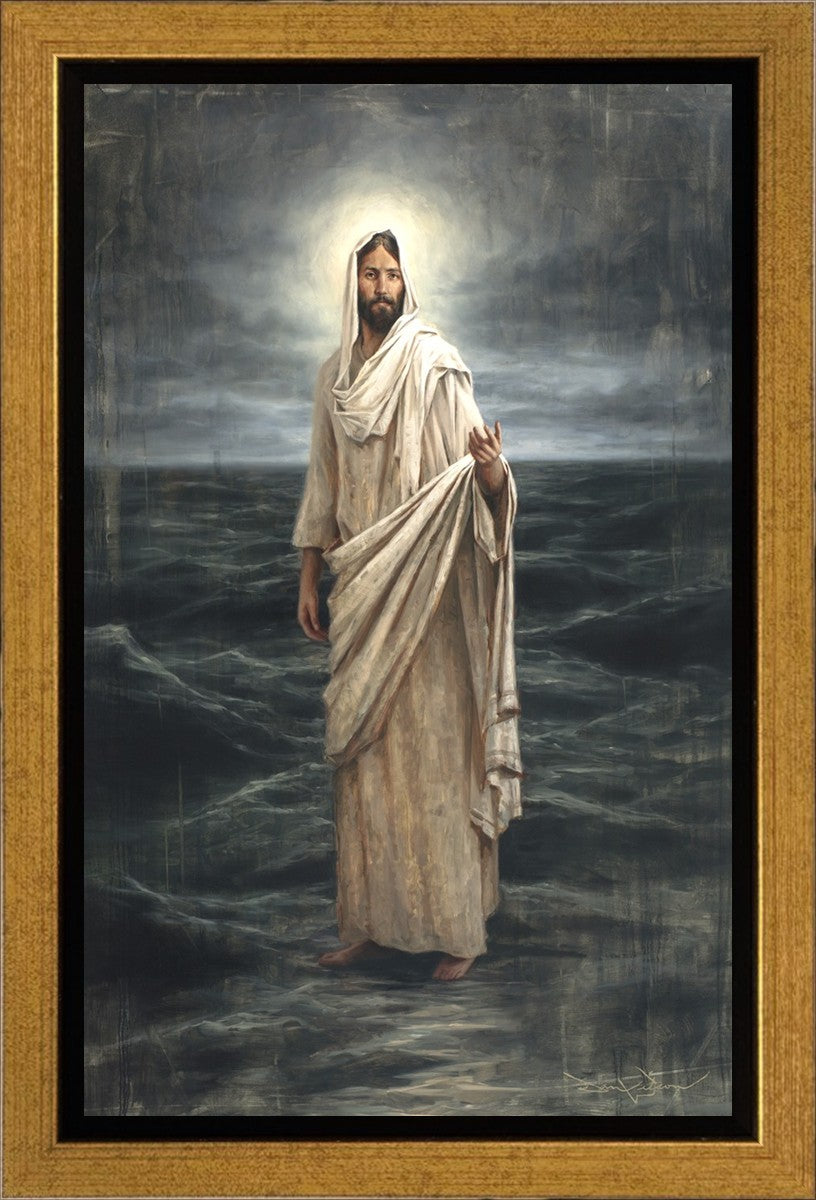 "Come, Be Not Afraid" by Dan Wilson depicts Jesus Christ walking on stormy waters, extending a reassuring hand amid rain, be ye not afraid.