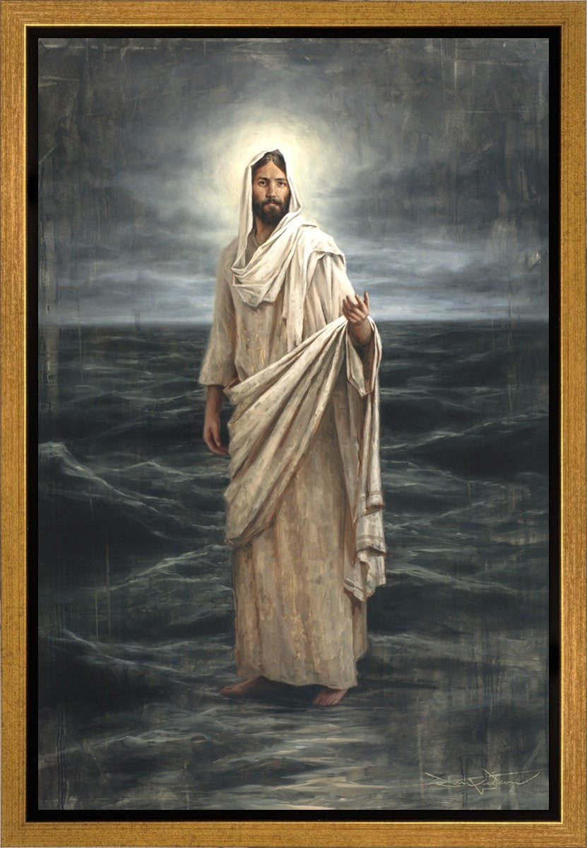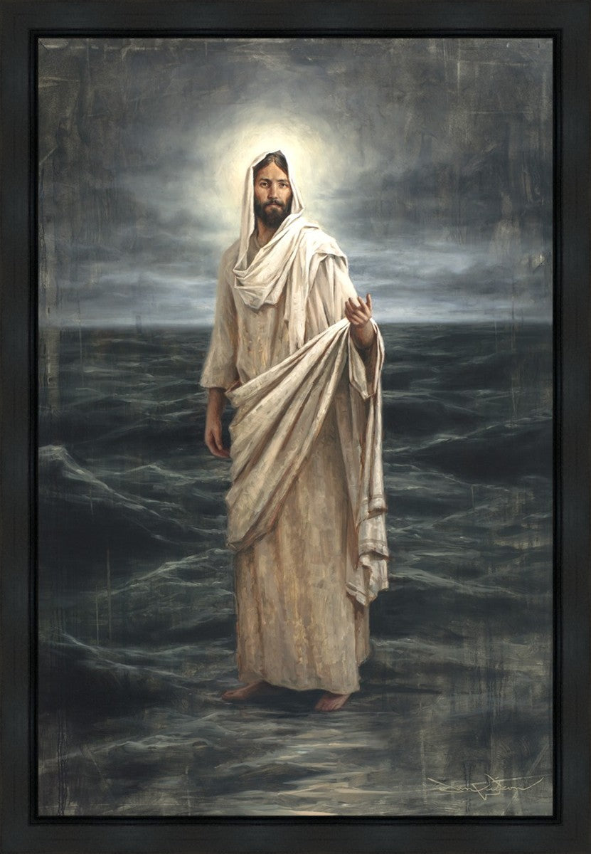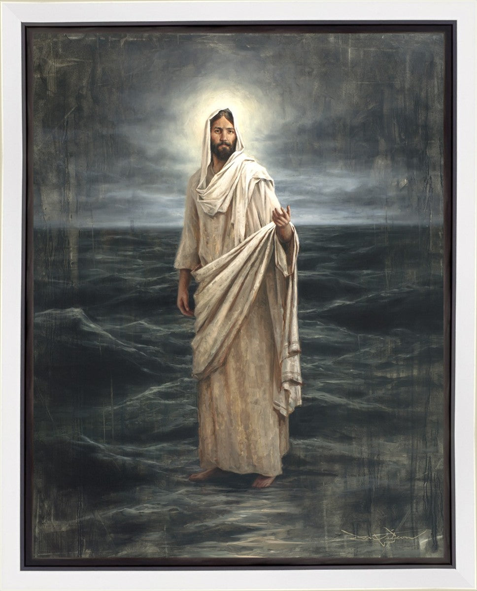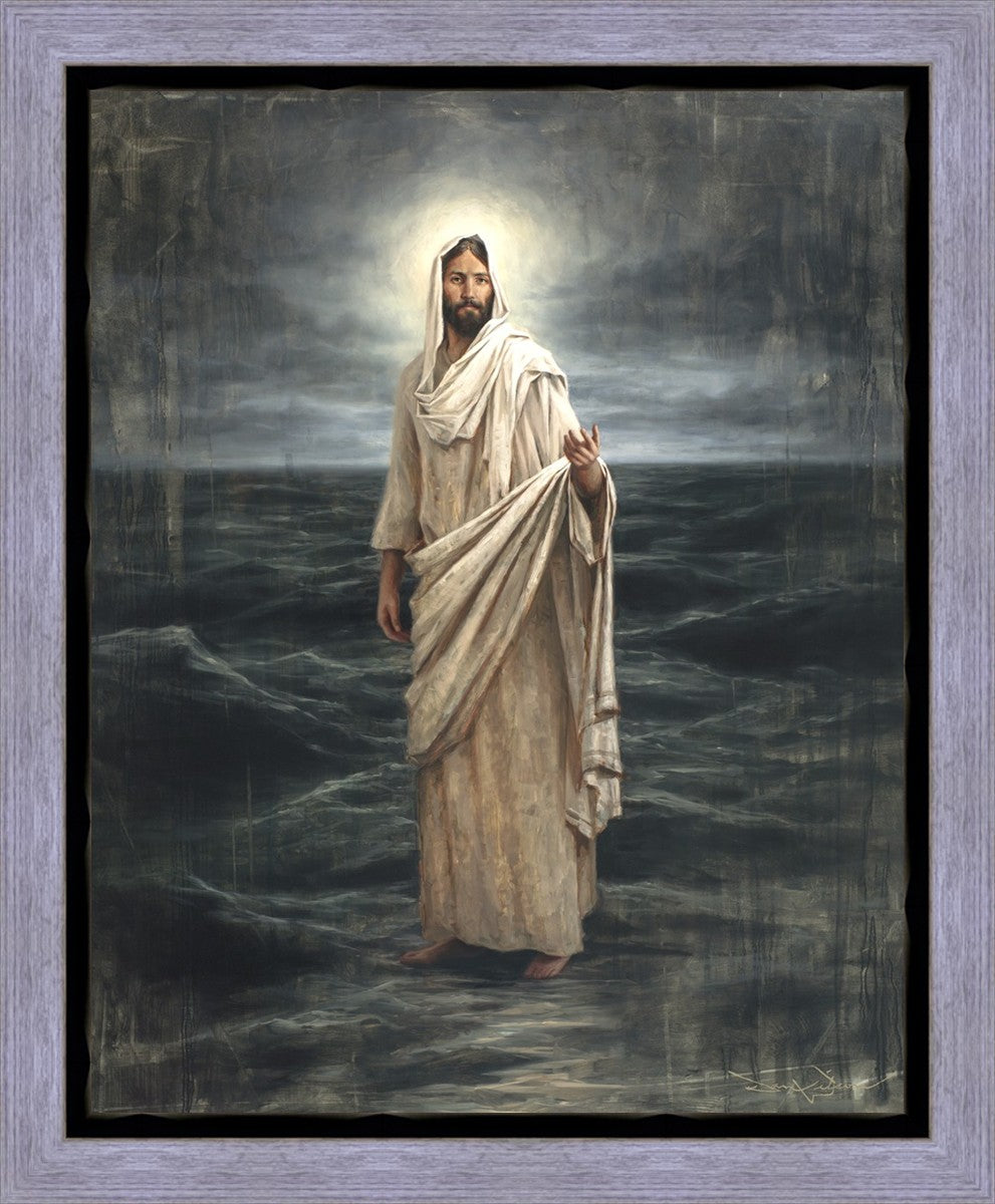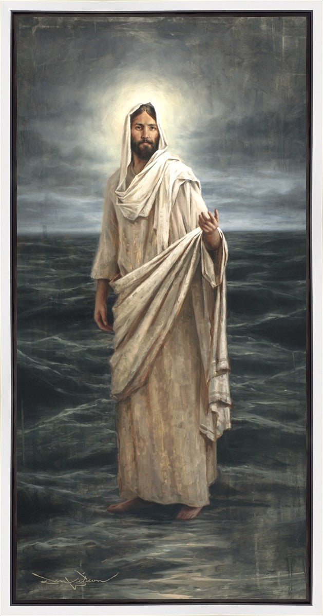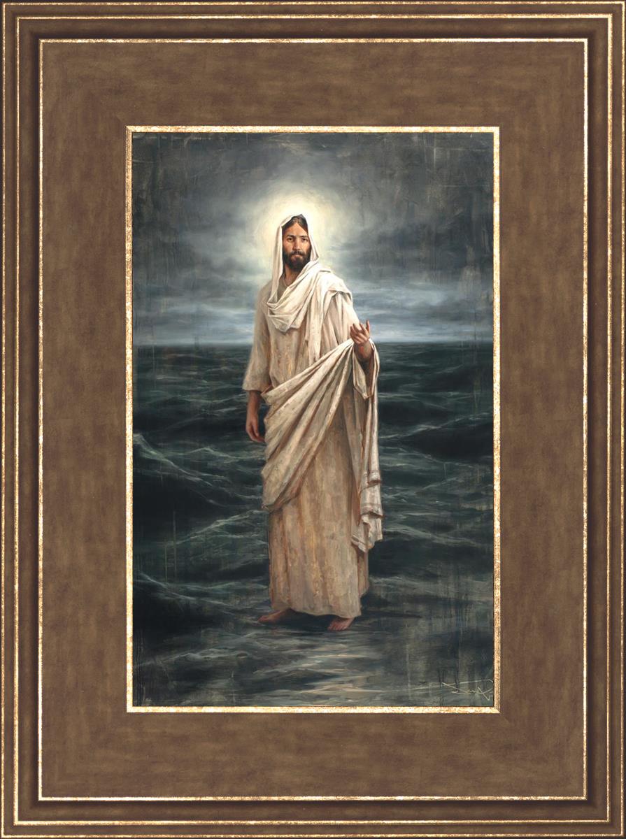 "Come, Be Not Afraid" by Dan Wilson depicts Jesus Christ walking on stormy waters, extending a reassuring hand amid rain, be ye not afraid.