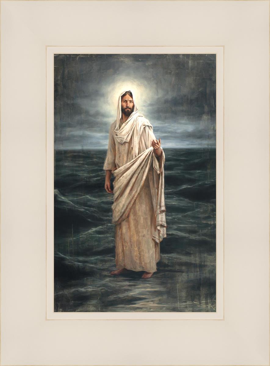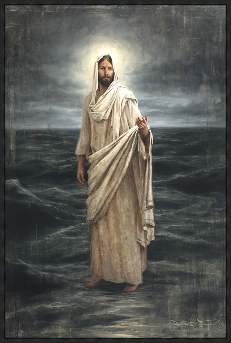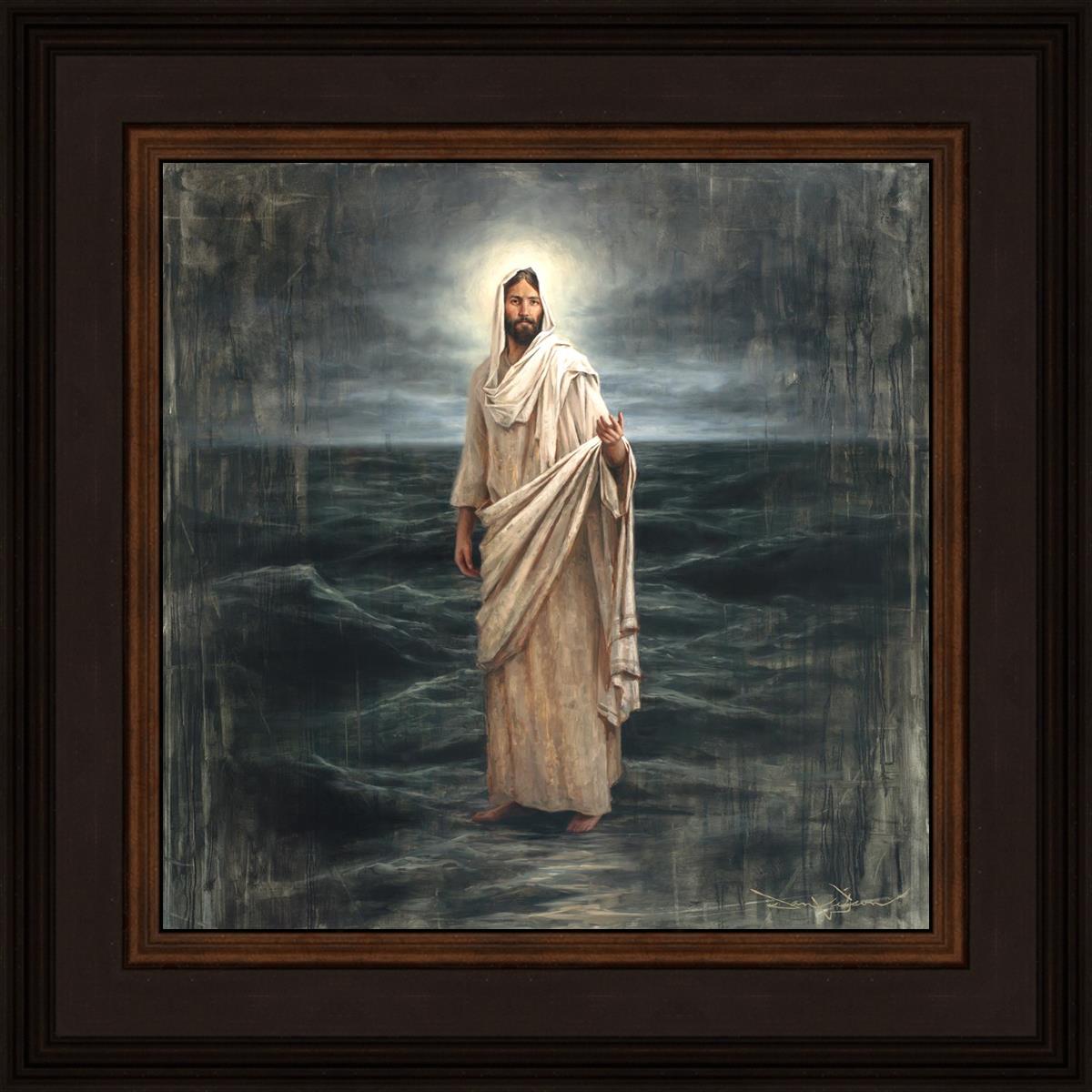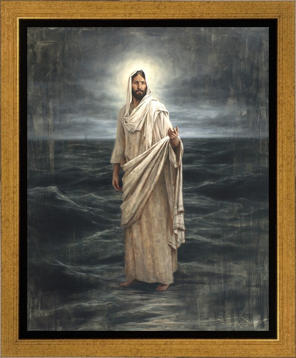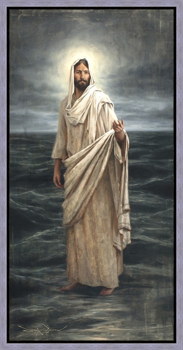 "Come, Be Not Afraid" by Dan Wilson depicts Jesus Christ walking on stormy waters, extending a reassuring hand amid rain, be ye not afraid.
