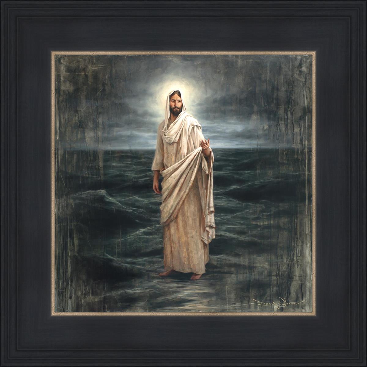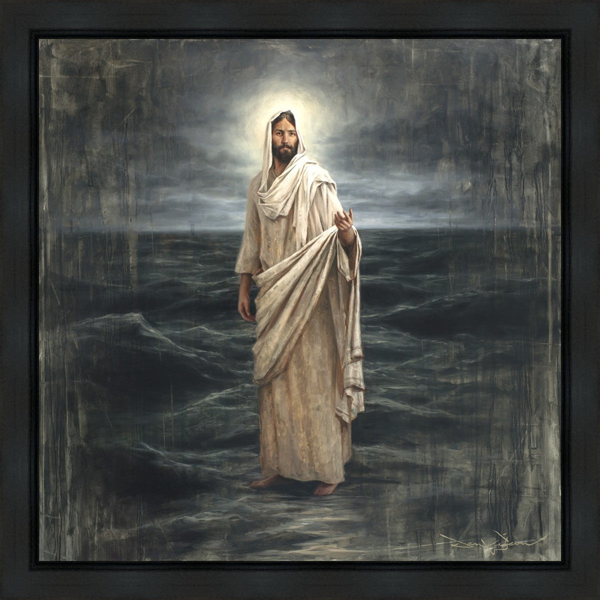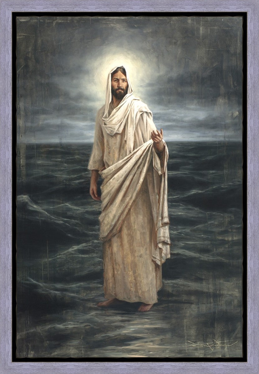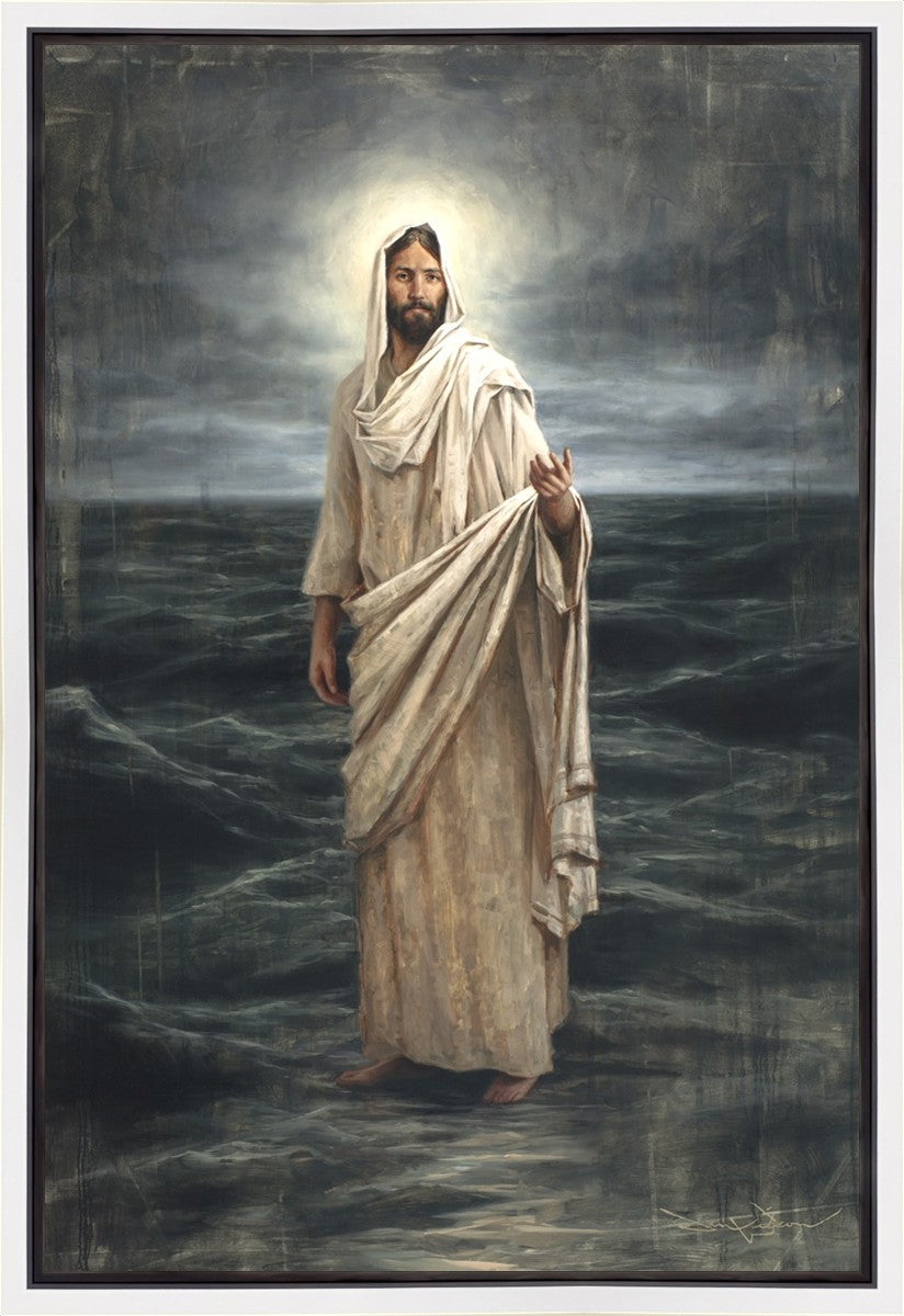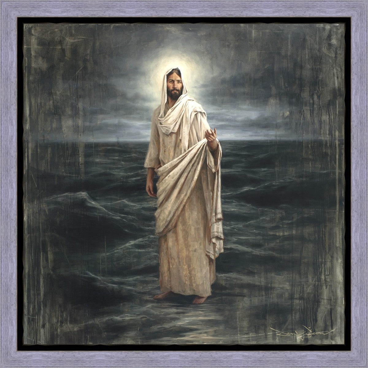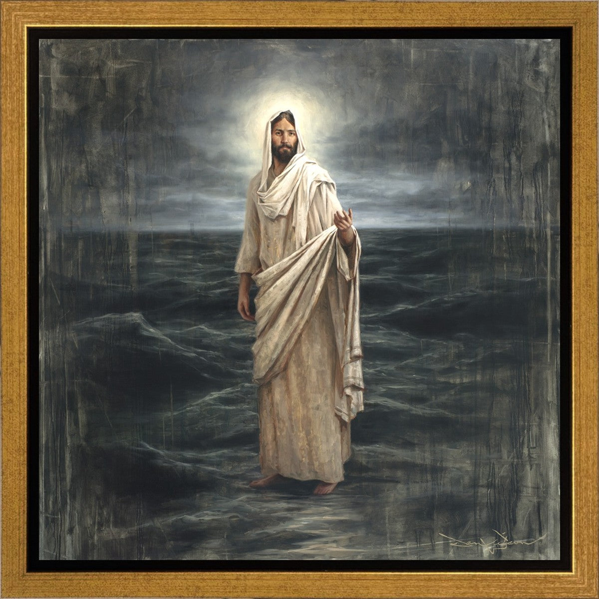 "Come, Be Not Afraid" by Dan Wilson depicts Jesus Christ walking on stormy waters, extending a reassuring hand amid rain, be ye not afraid.