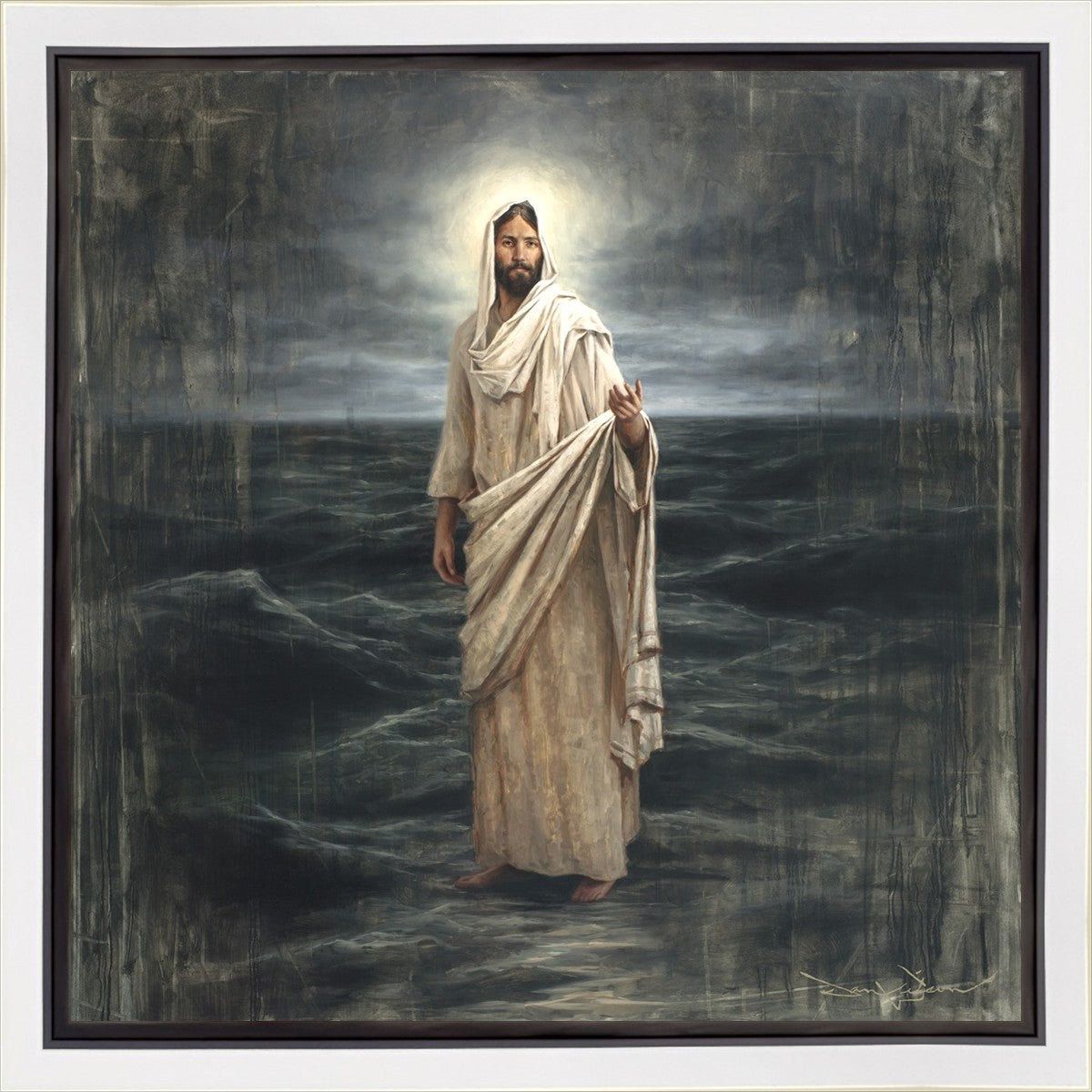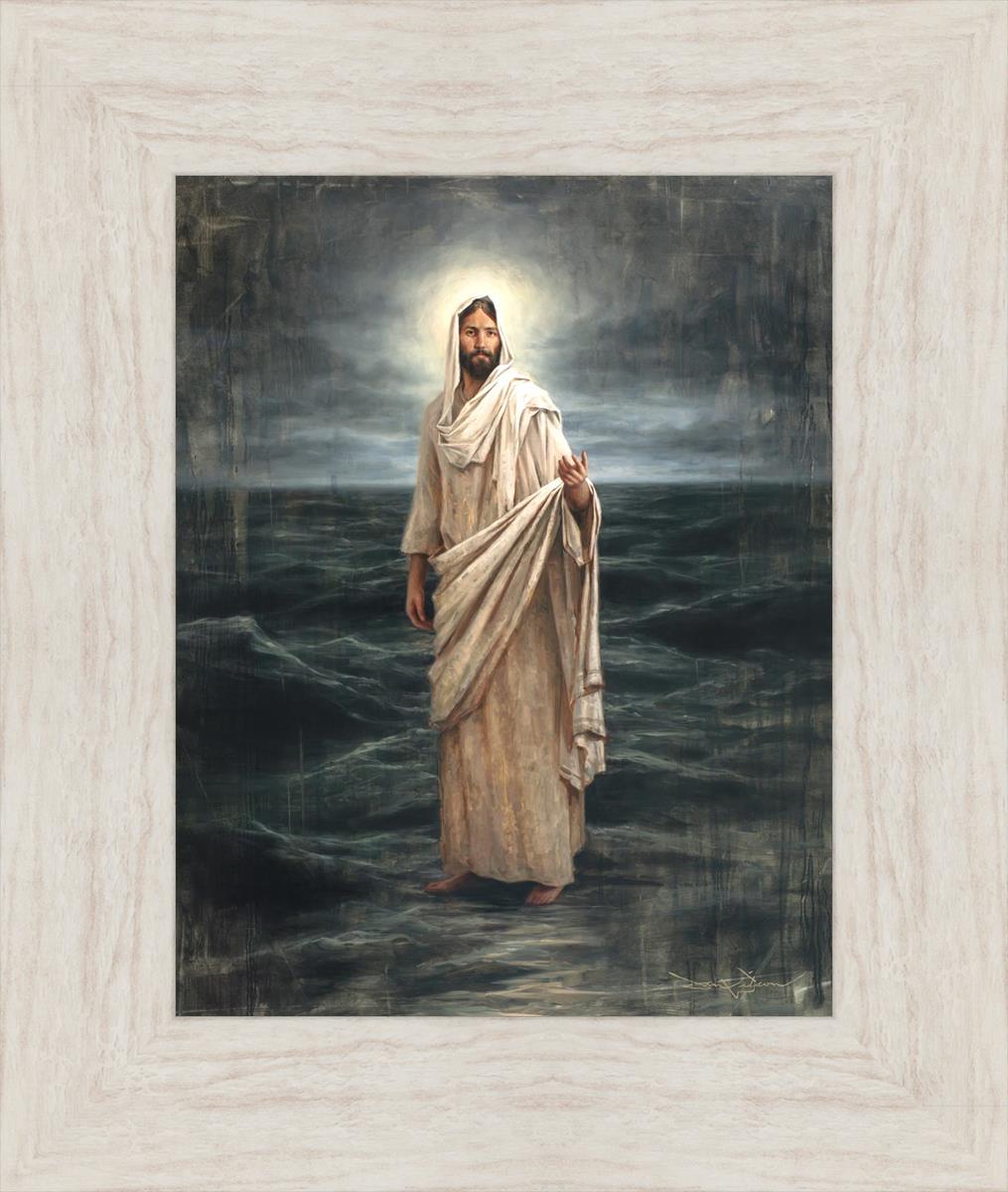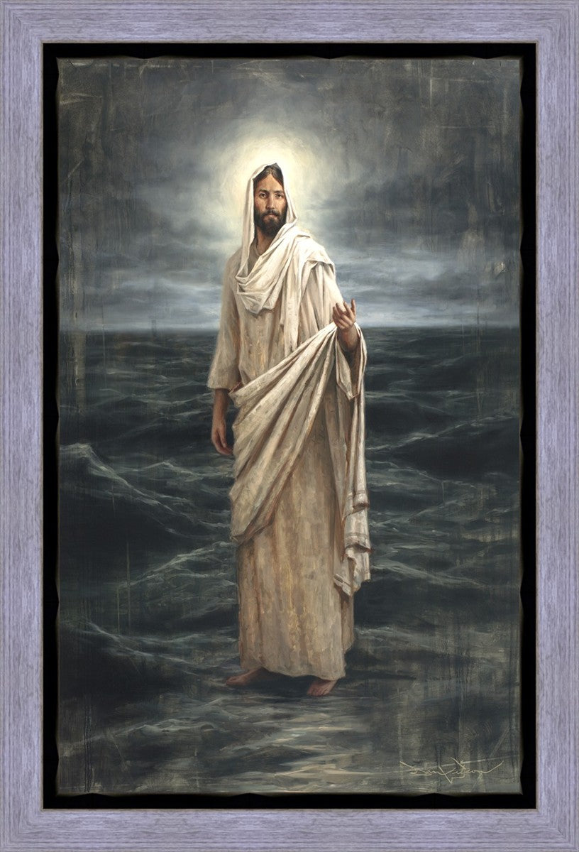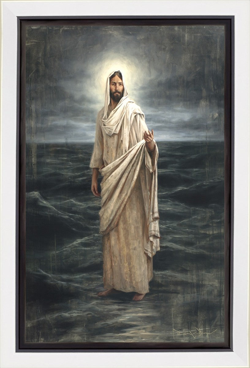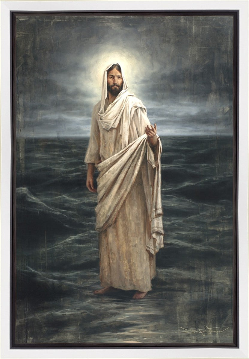 "Come, Be Not Afraid" by Dan Wilson depicts Jesus Christ walking on stormy waters, extending a reassuring hand amid rain, be ye not afraid.