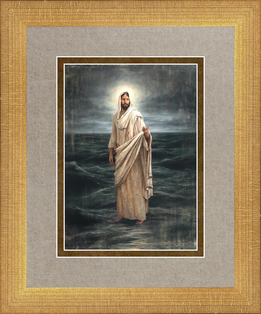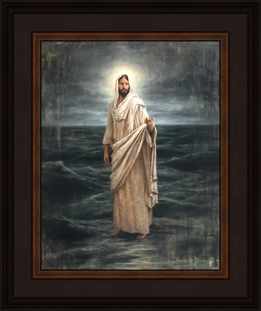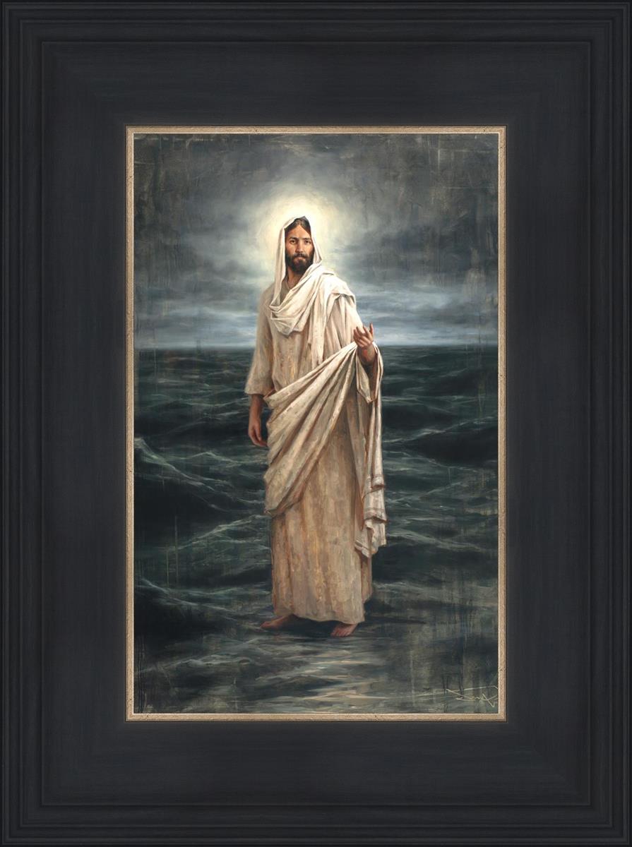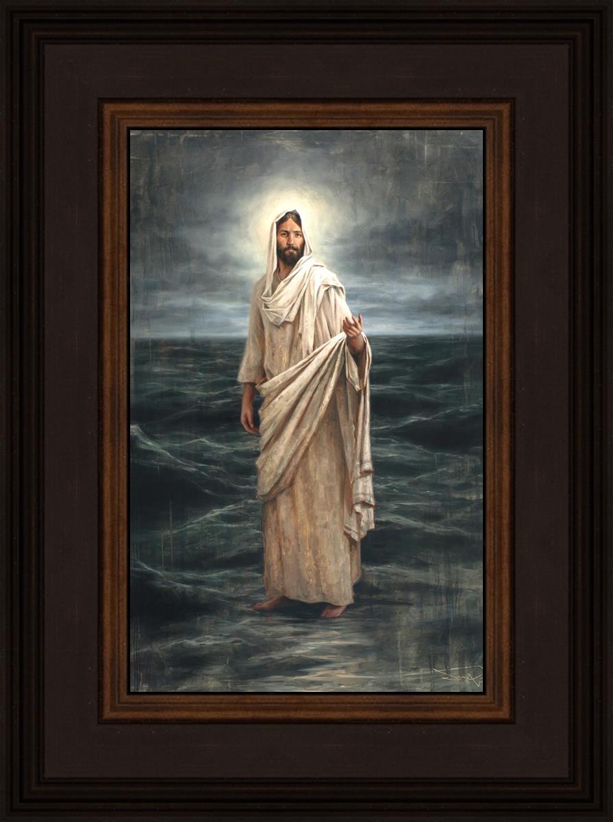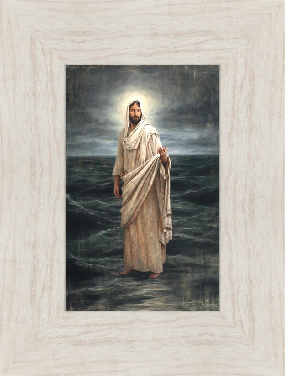 "Come, Be Not Afraid" by Dan Wilson depicts Jesus Christ walking on stormy waters, extending a reassuring hand amid rain, be ye not afraid.
