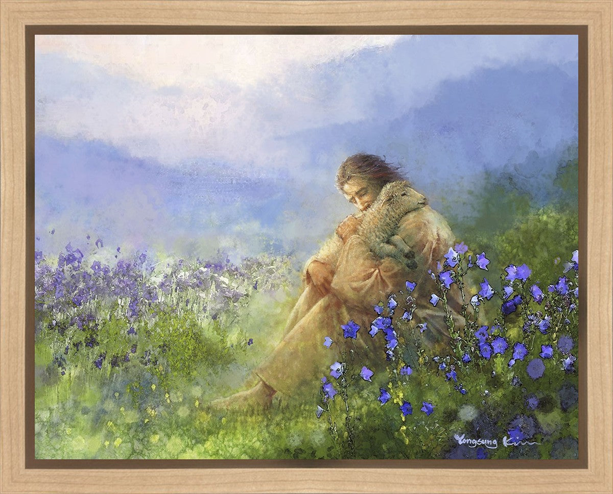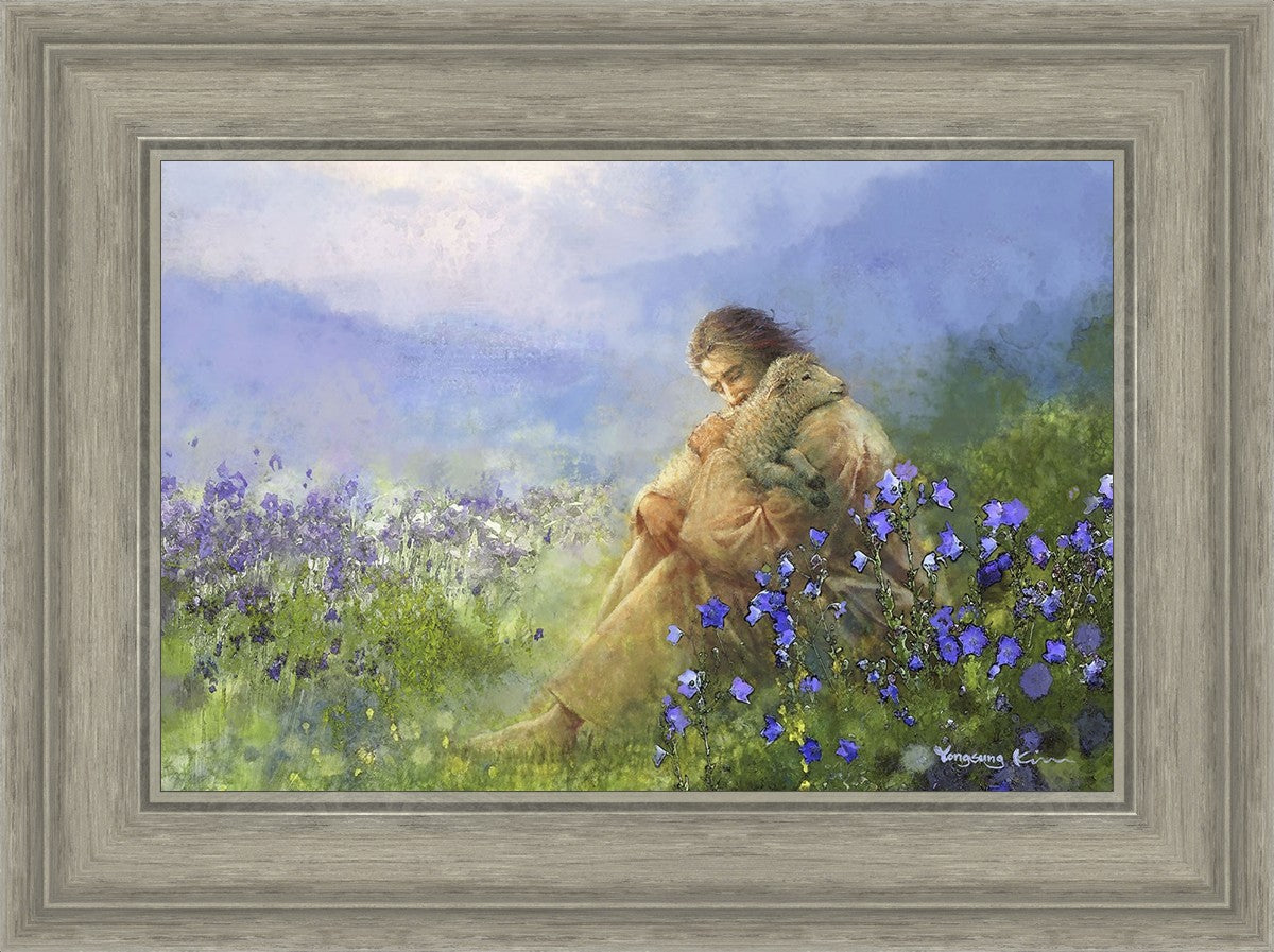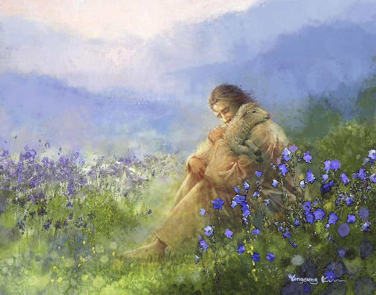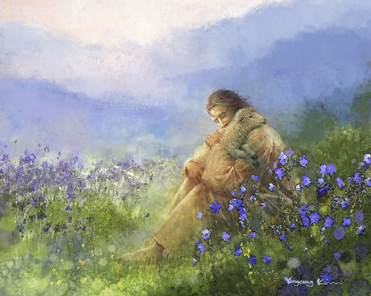 "Comforter" by Yongsung Kim portrays Jesus Christ tenderly embracing a lamb amidst a serene field of purple flowers beneath a calming blue sky, emanating divine comfort and compassion. This touching artwork evokes feelings of solace and compassion, resonating with viewers seeking spiritual reassurance and a deeper connection to their faith.