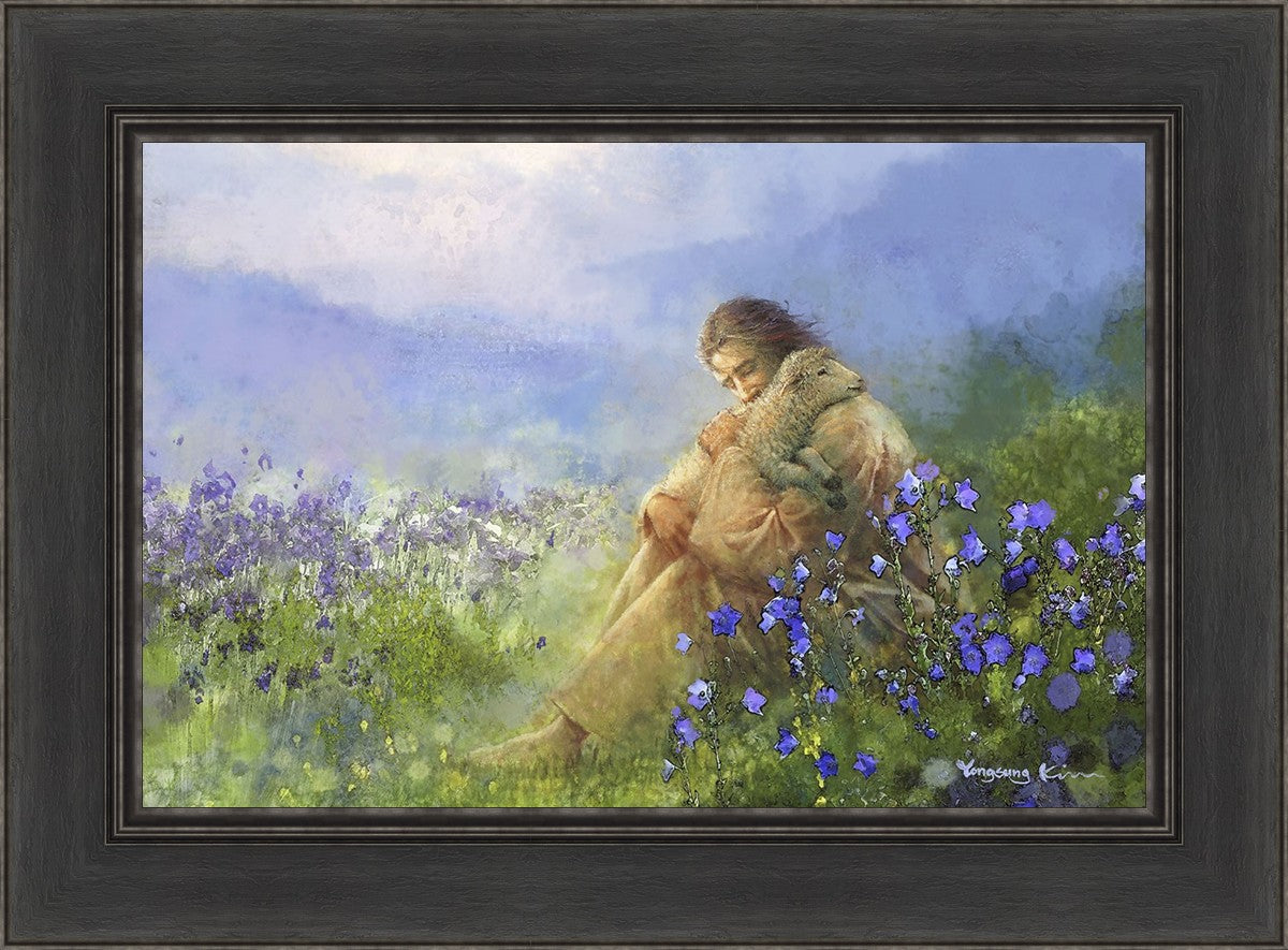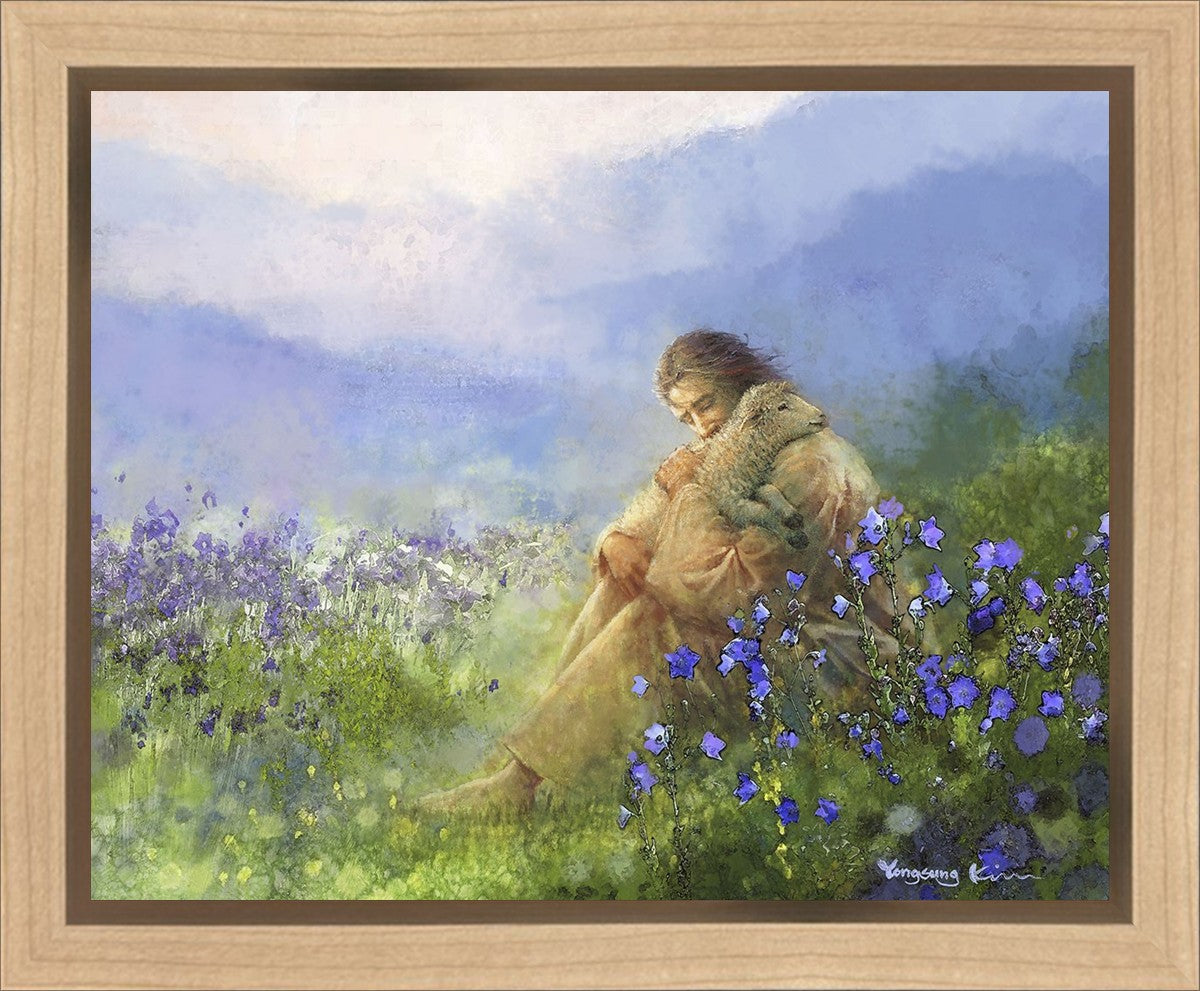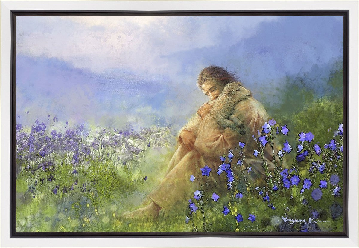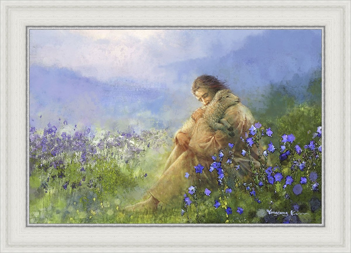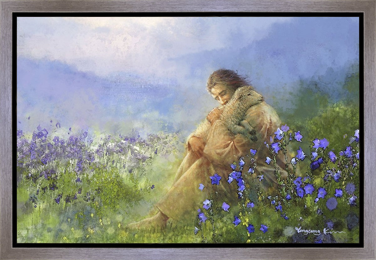 "Comforter" by Yongsung Kim portrays Jesus Christ tenderly embracing a lamb amidst a serene field of purple flowers beneath a calming blue sky, emanating divine comfort and compassion. This touching artwork evokes feelings of solace and compassion, resonating with viewers seeking spiritual reassurance and a deeper connection to their faith.
