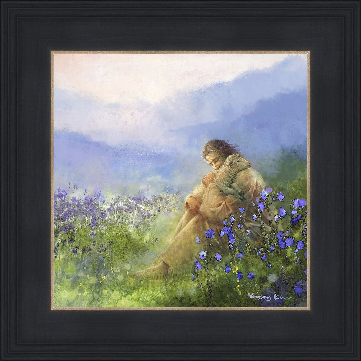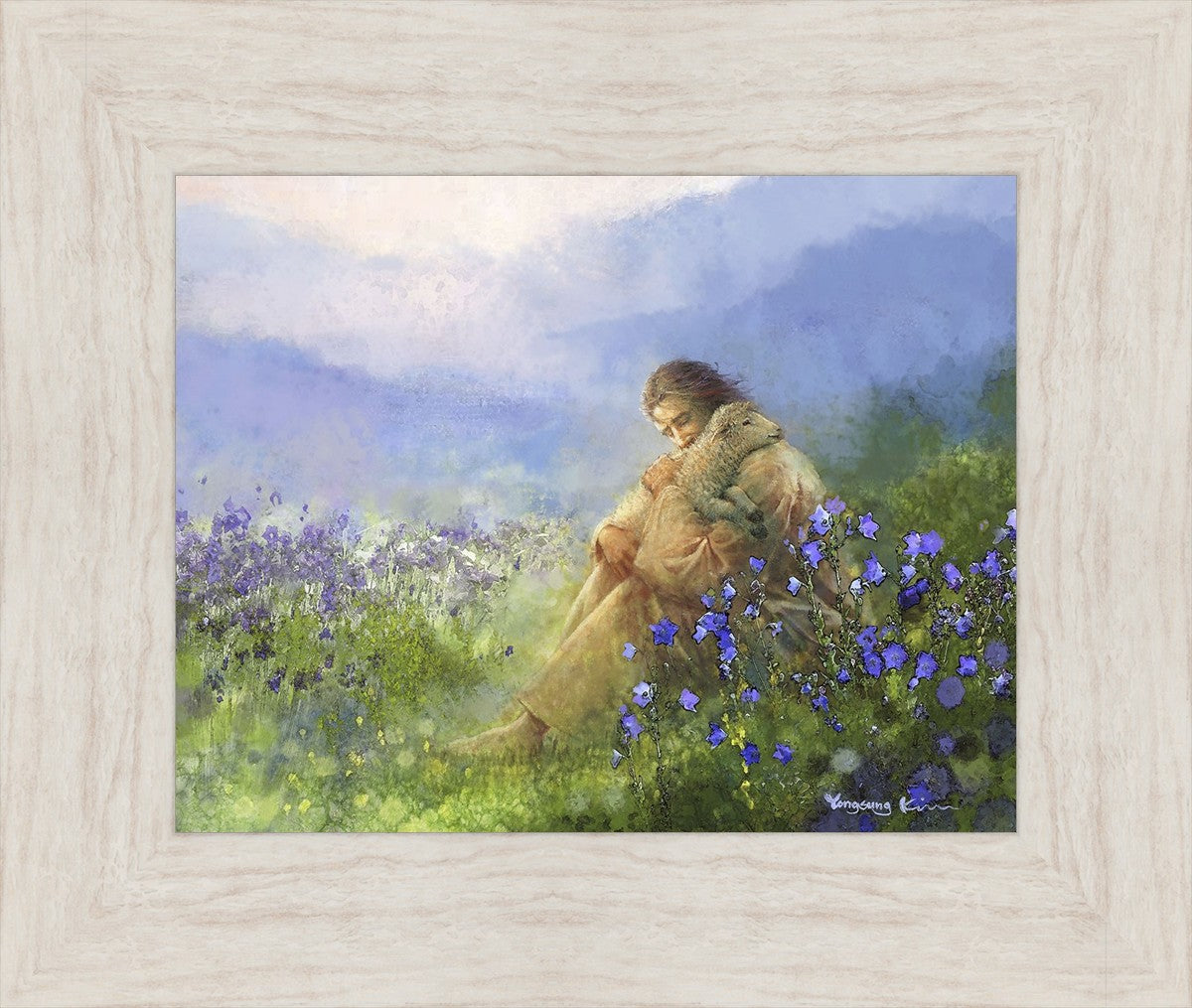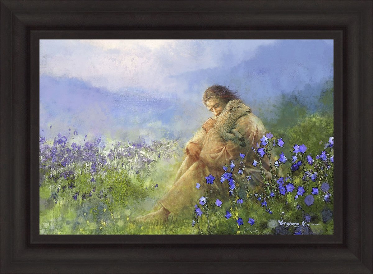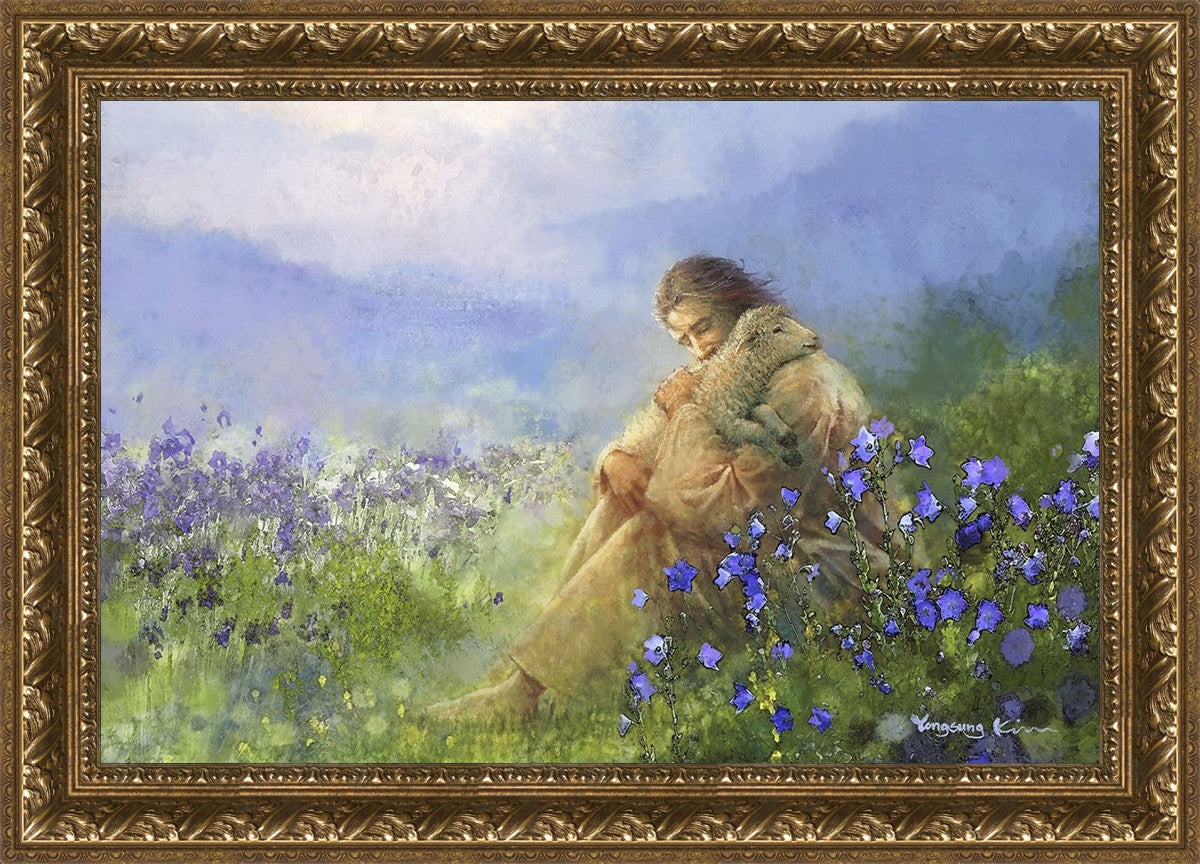 "Comforter" by Yongsung Kim portrays Jesus Christ tenderly embracing a lamb amidst a serene field of purple flowers beneath a calming blue sky, emanating divine comfort and compassion. This touching artwork evokes feelings of solace and compassion, resonating with viewers seeking spiritual reassurance and a deeper connection to their faith.