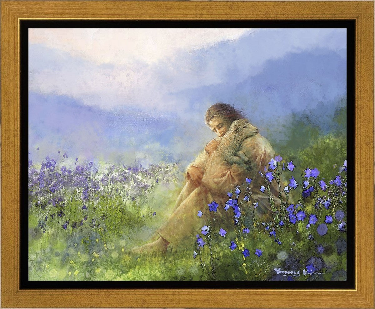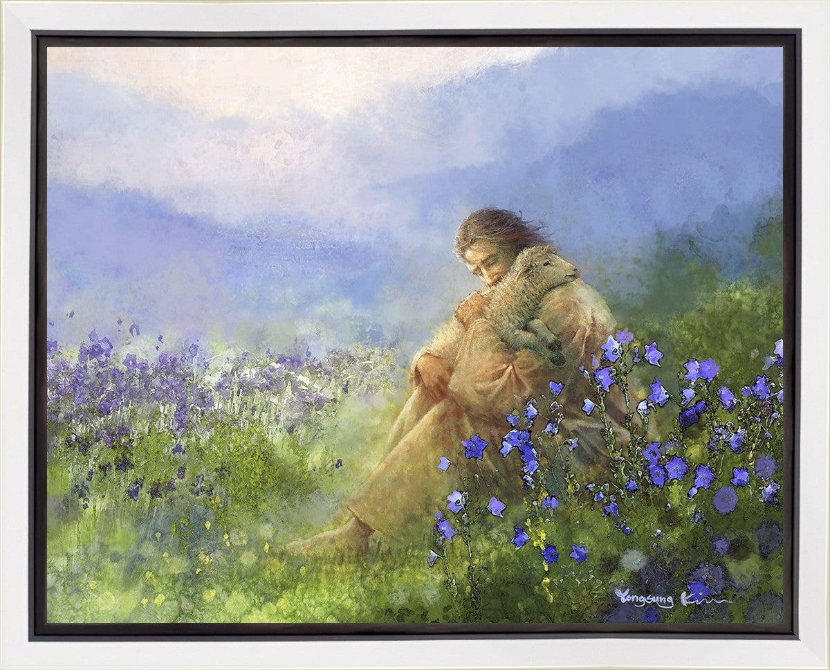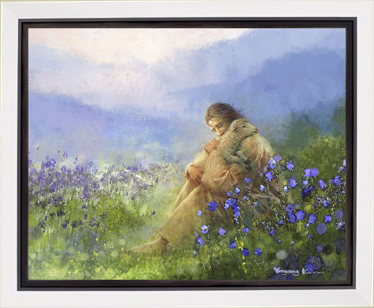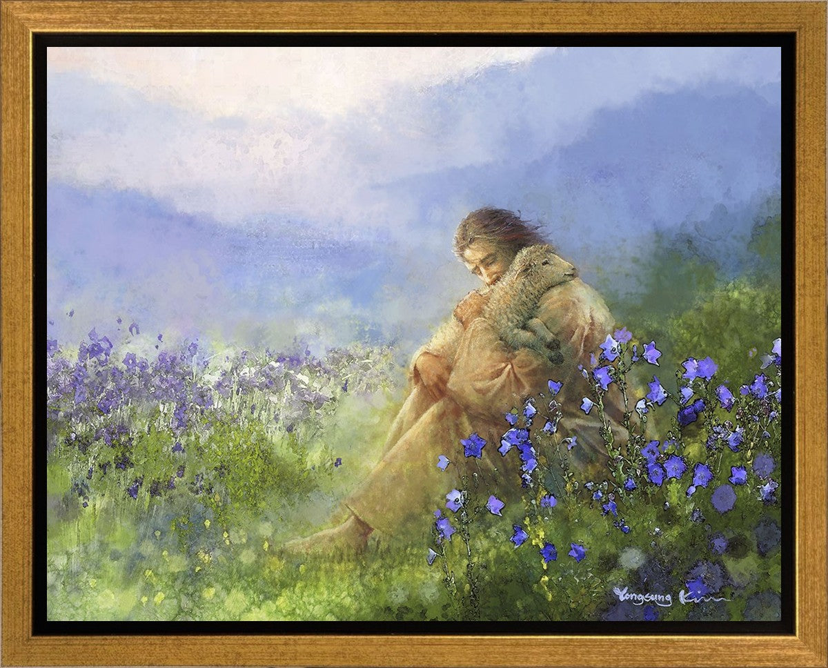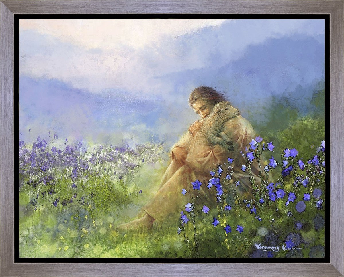 "Comforter" by Yongsung Kim portrays Jesus Christ tenderly embracing a lamb amidst a serene field of purple flowers beneath a calming blue sky, emanating divine comfort and compassion. This touching artwork evokes feelings of solace and compassion, resonating with viewers seeking spiritual reassurance and a deeper connection to their faith.