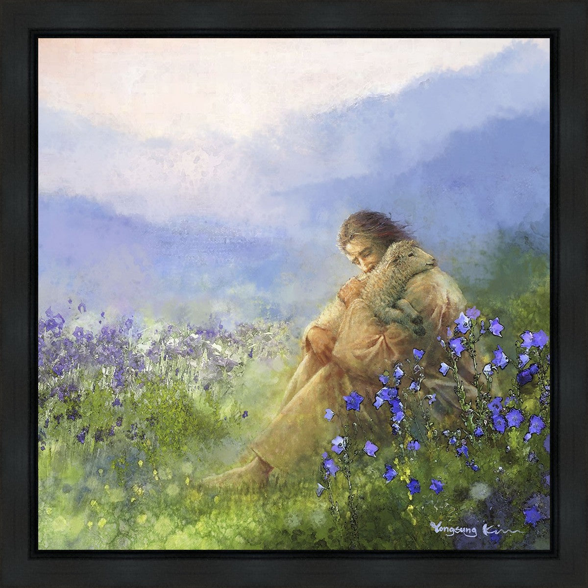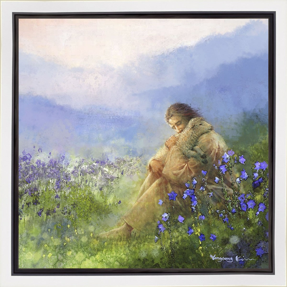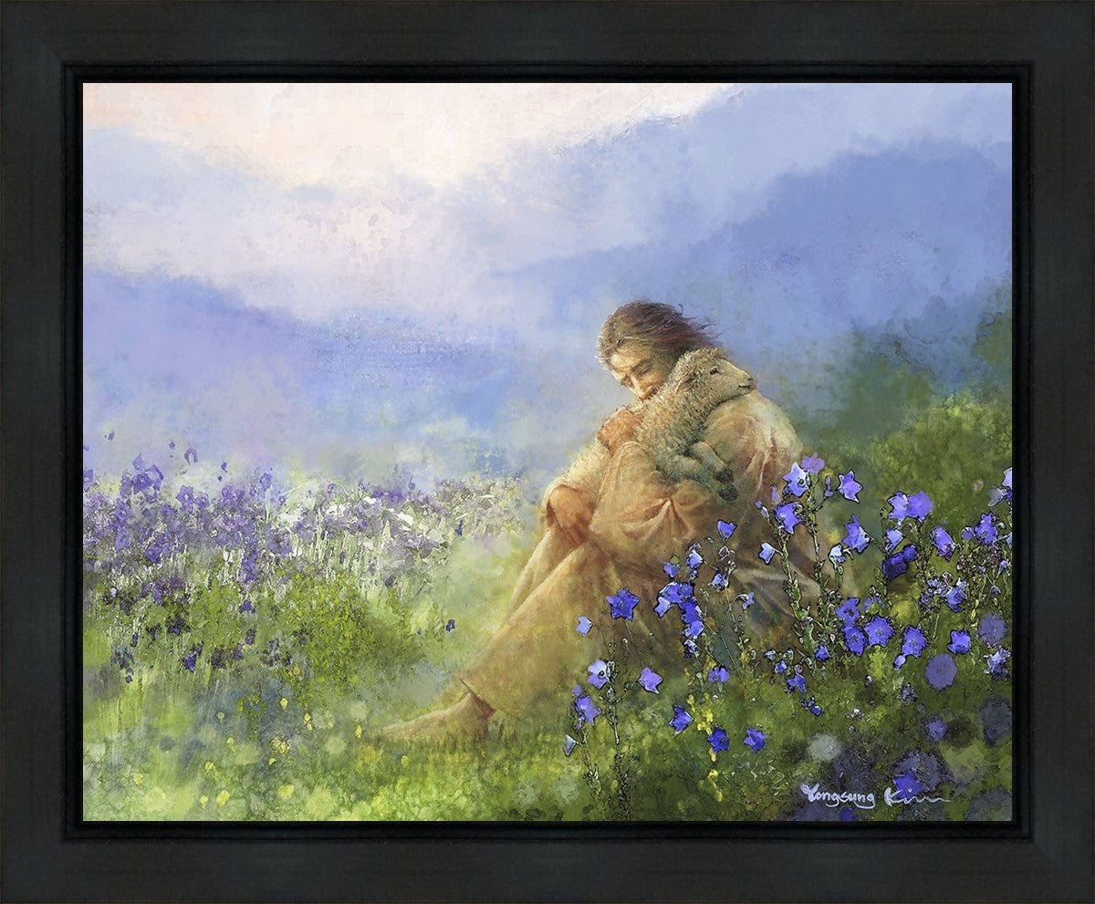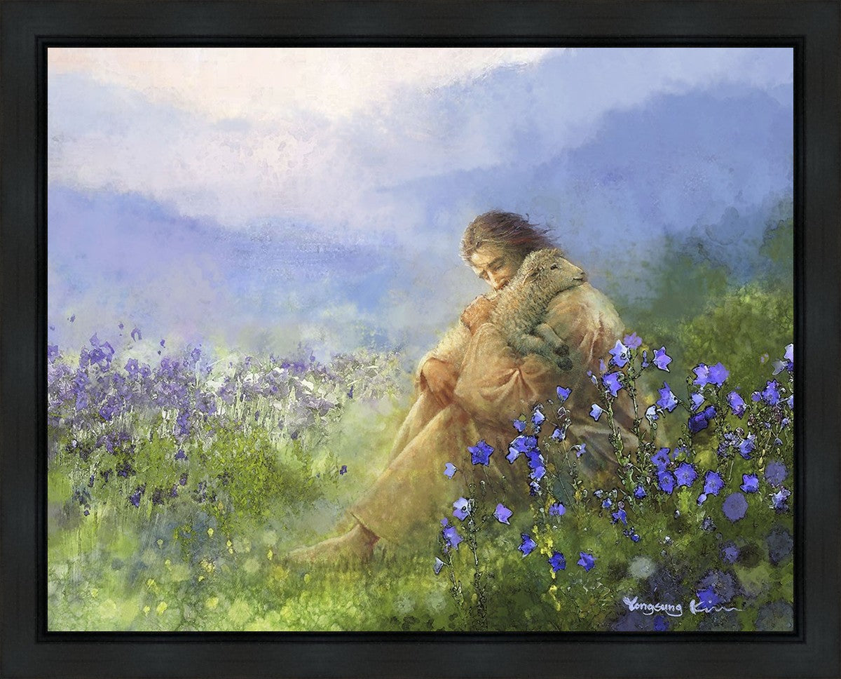 "Comforter" by Yongsung Kim portrays Jesus Christ tenderly embracing a lamb amidst a serene field of purple flowers beneath a calming blue sky, emanating divine comfort and compassion. This touching artwork evokes feelings of solace and compassion, resonating with viewers seeking spiritual reassurance and a deeper connection to their faith.