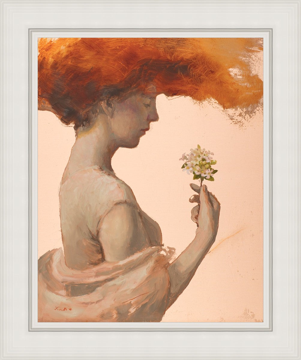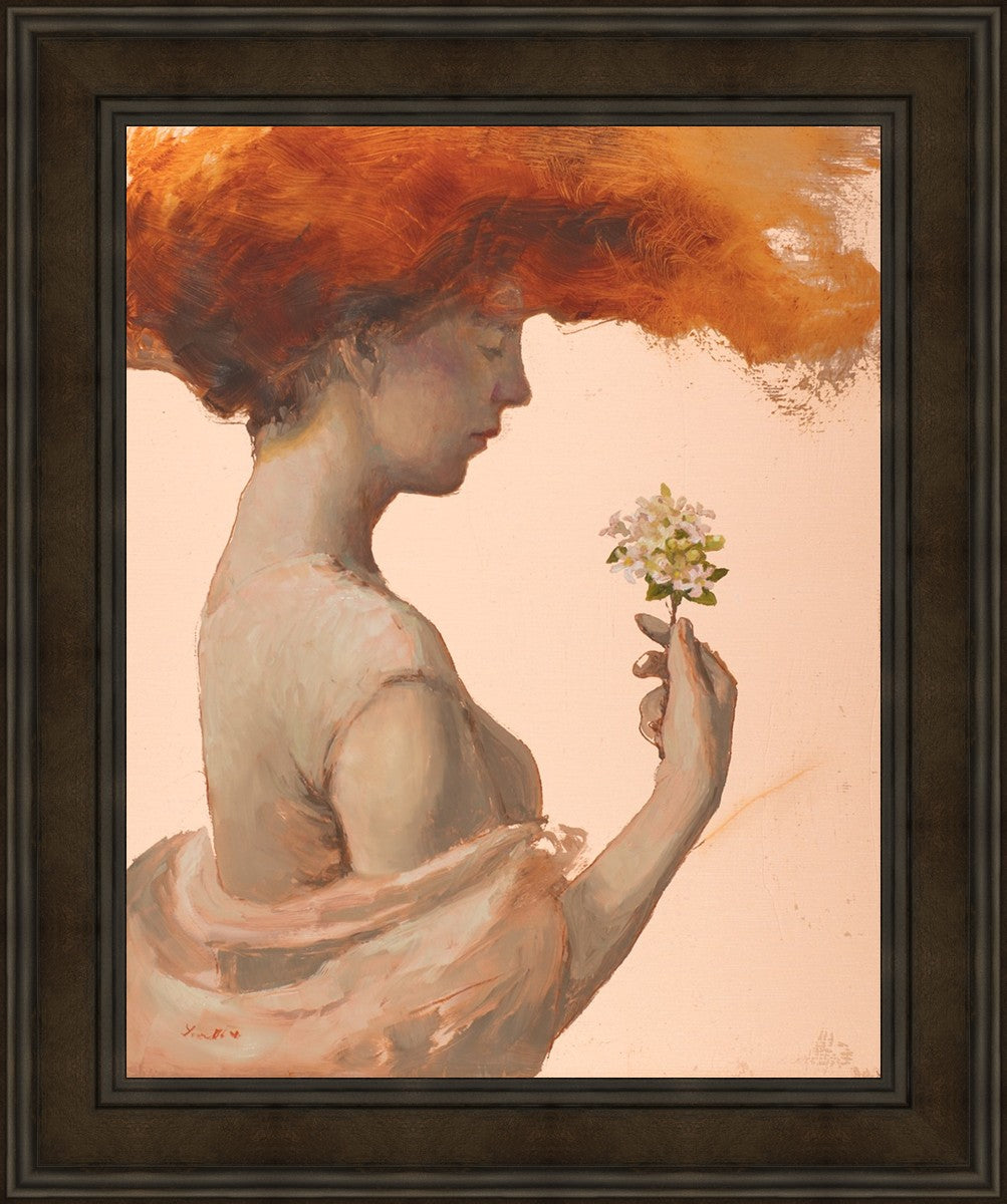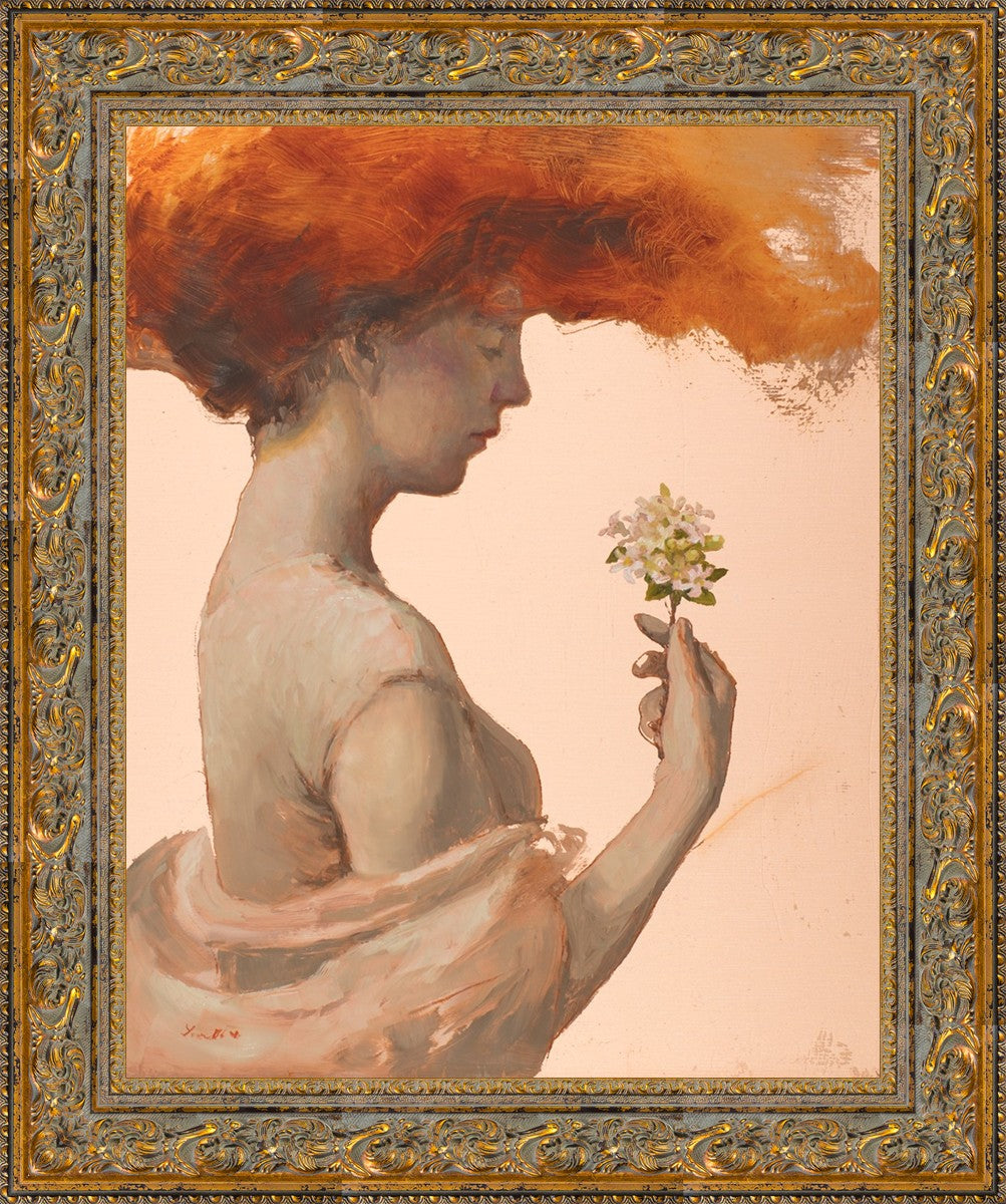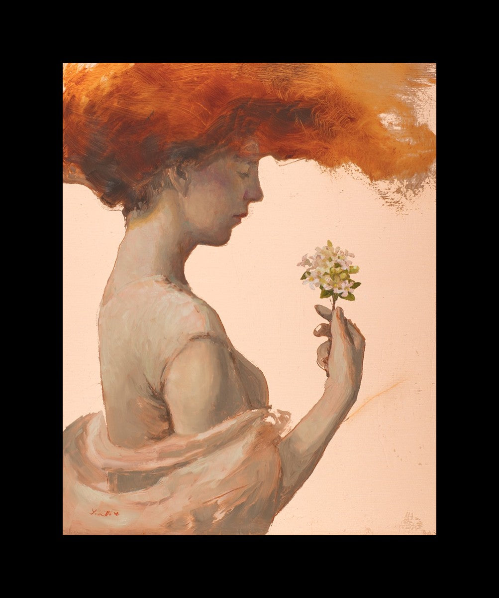 In order to believe in a loving God, I have been forced to grapple with the complex paradox of the existence of divine love and the presence of evil, death, and sin. The jasmine flowers in this painting represent the love of God, and the woman directs her attention to them. The fragile blooms are contrasted with her red hair which resembles fire and represents the Holy Spirit and a refiners fire.