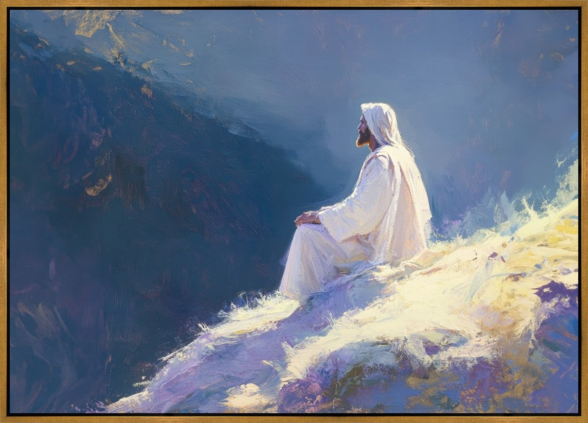 In "Contemplation," we sought to portray a moment of Jesus in quiet reflection, perched on a sunlit ridge. The vibrant colors and ethereal light reflect our desire to capture His peace and spiritual strength. Our simple message is one of hope and stillness, inviting viewers to find solace in His presence amidst life's vastness.