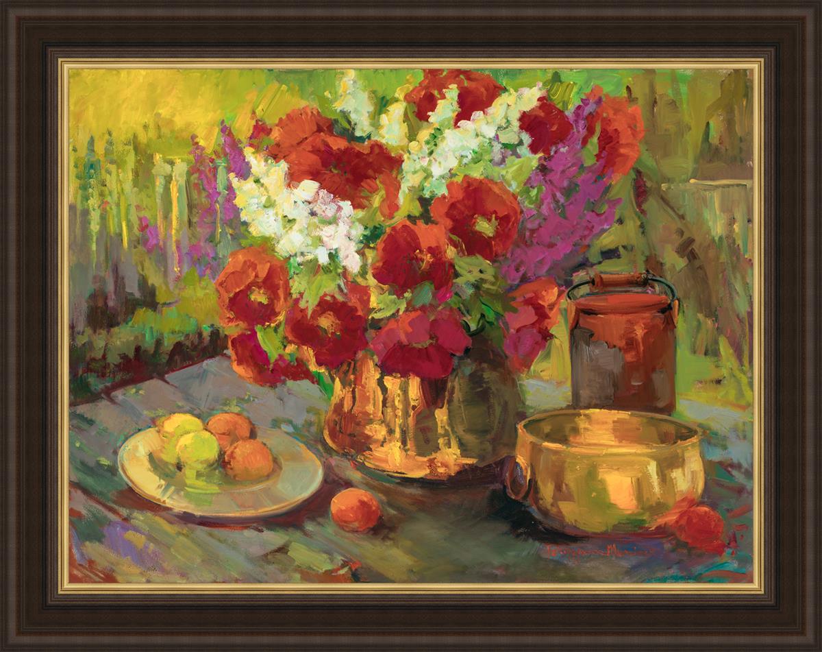 Sun, summer, green lawns, and red poppies. These are a few of my favorite things especially when set off by shining brass and copper. This painting was done on a hot afternoon sunshine day in June. It seemed to me as I sat outside under my umbrella that nothing could be