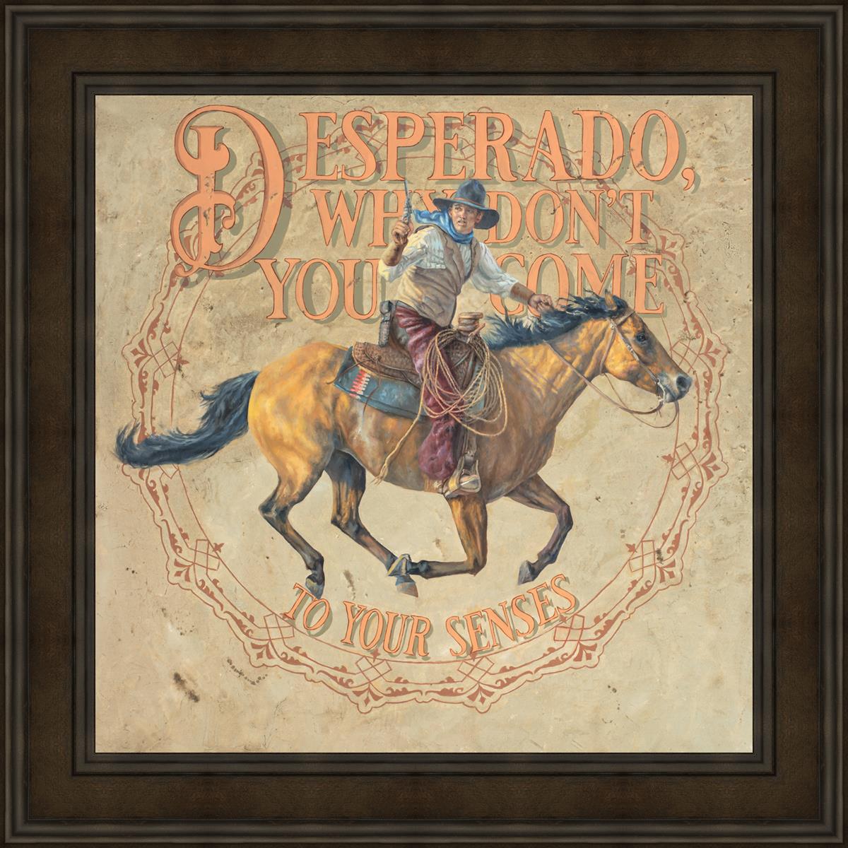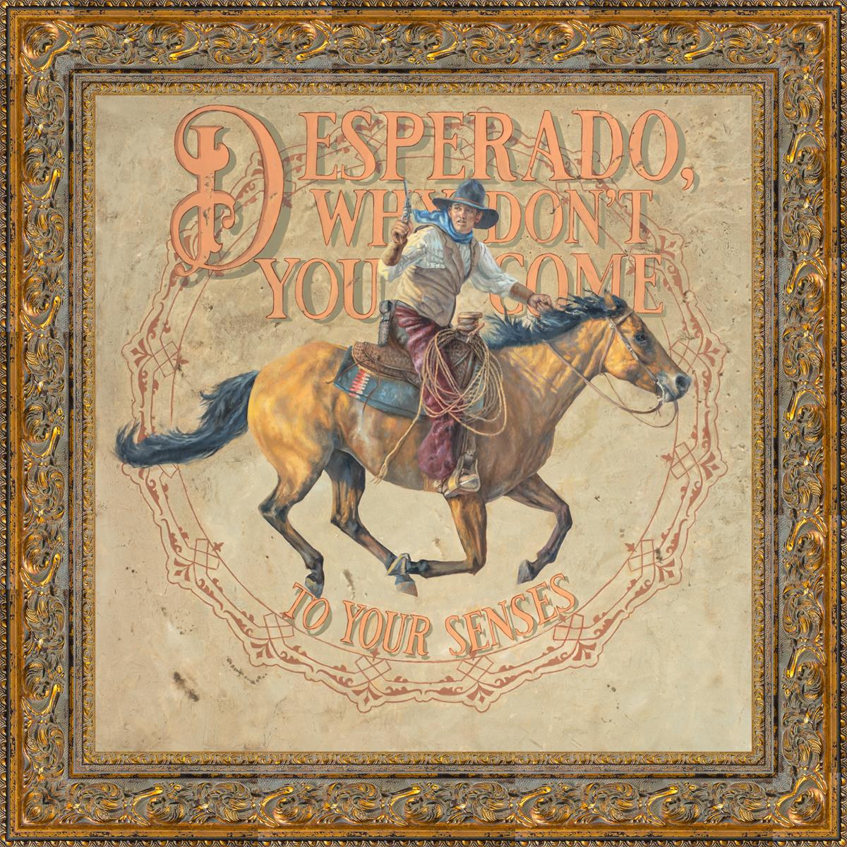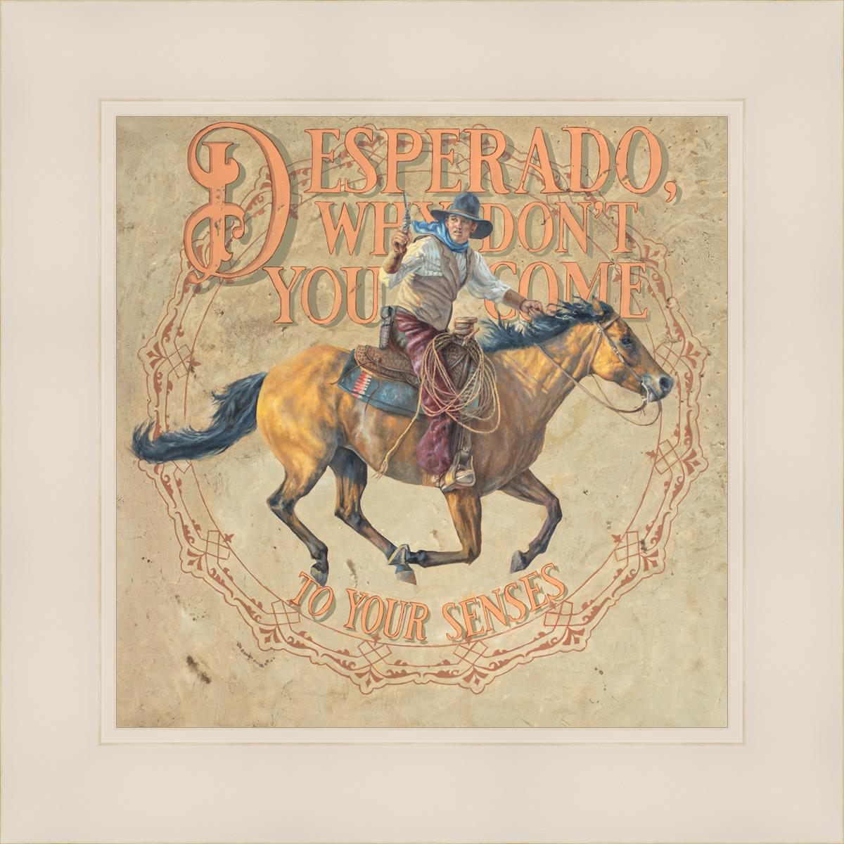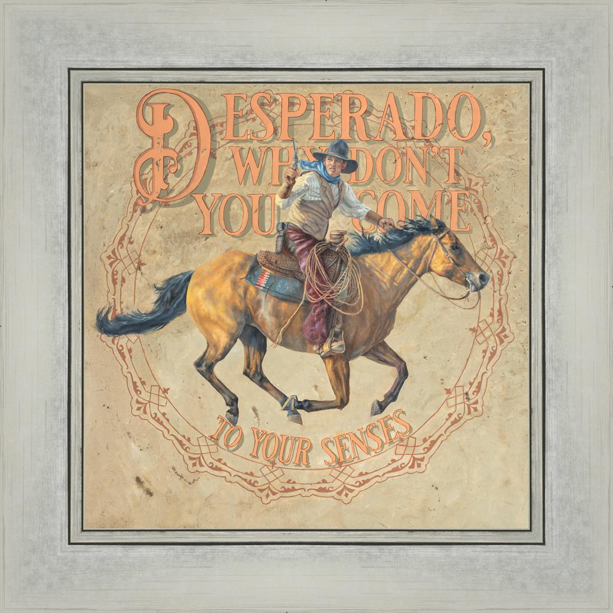 Desperado is of course from the Eagles song ||Desperado||. The first line is ||Desperado why dont you come to your senses|| where we have the Young Outlaw thats running from the law. My hope is that it brings back memories for people that remember that song and it puts a smile on their face. Who said Fine Art cant make us smile?