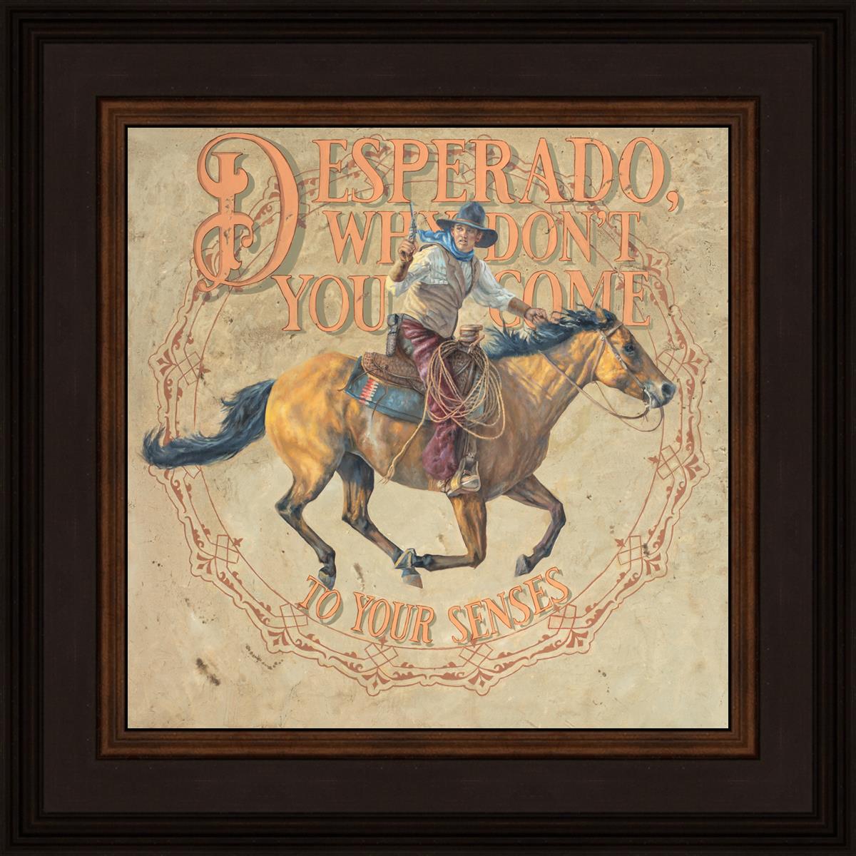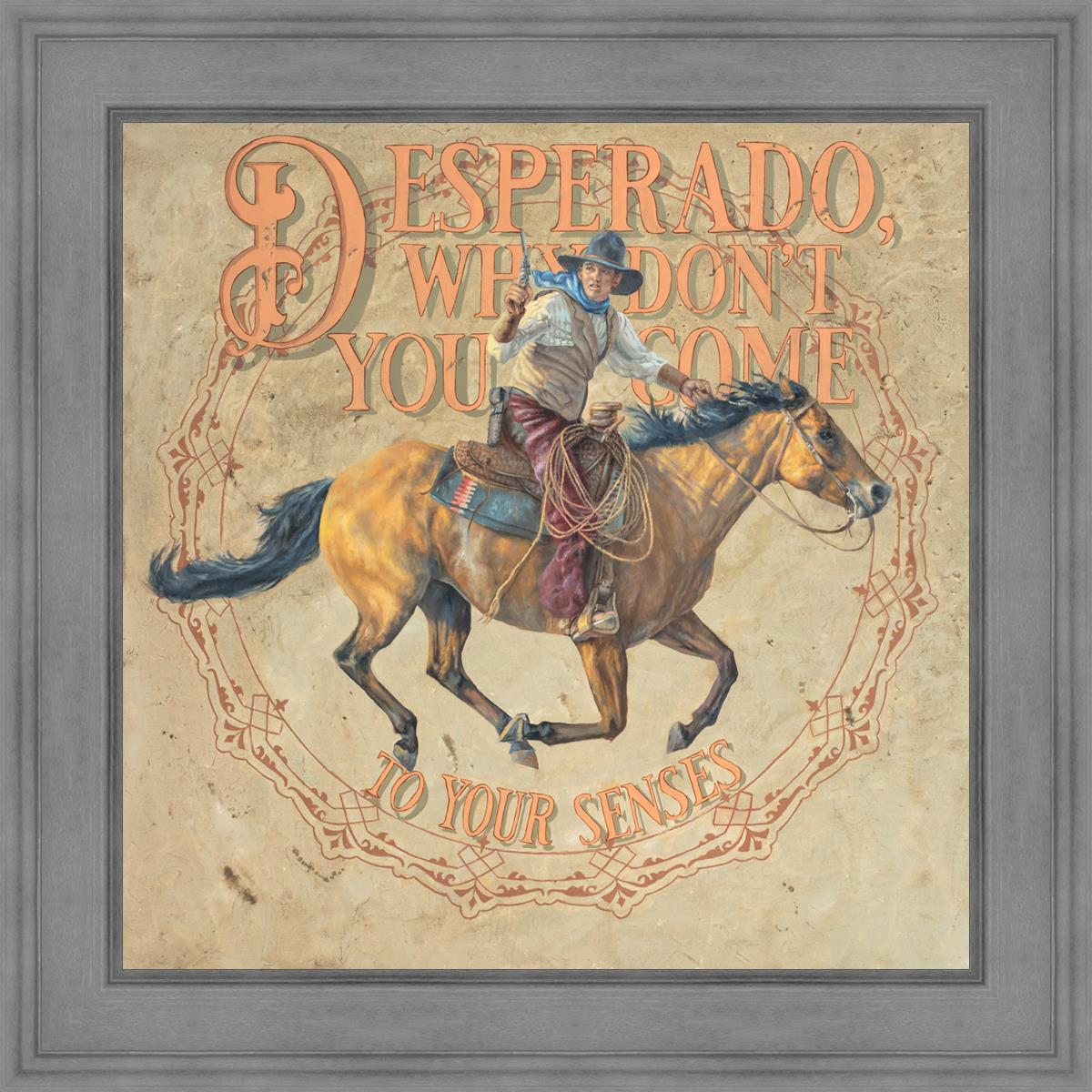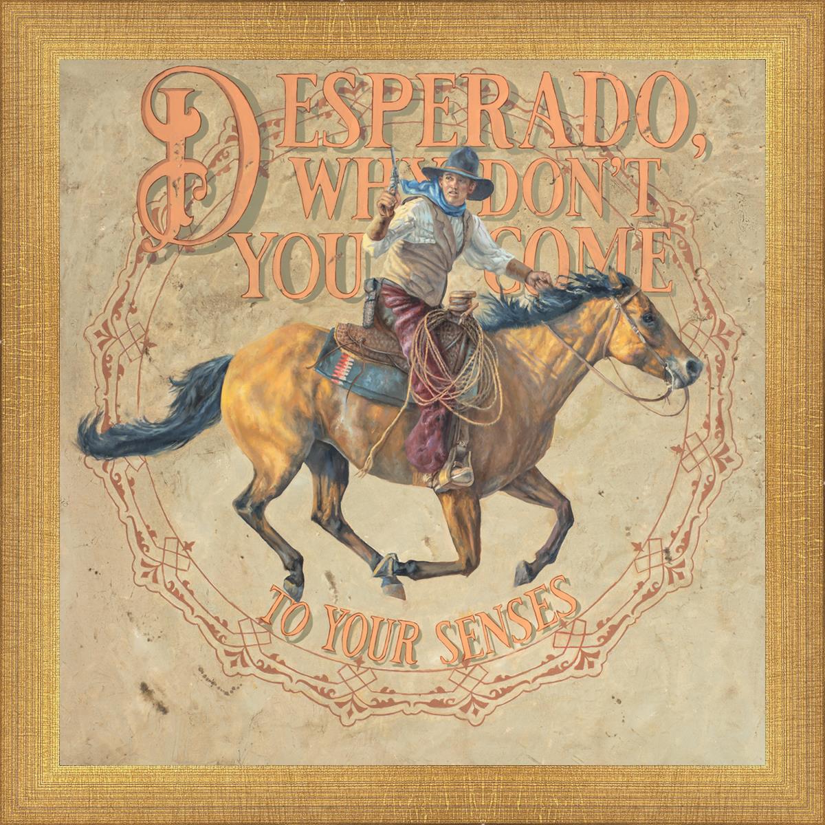 Desperado is of course from the Eagles song ||Desperado||. The first line is ||Desperado why dont you come to your senses|| where we have the Young Outlaw thats running from the law. My hope is that it brings back memories for people that remember that song and it puts a smile on their face. Who said Fine Art cant make us smile?