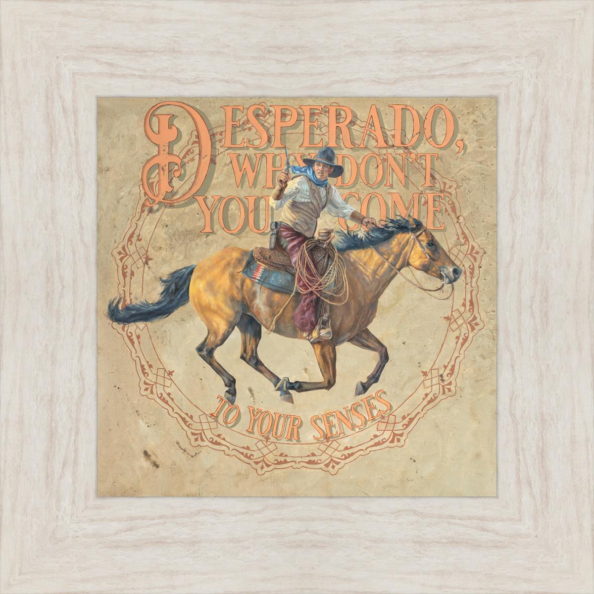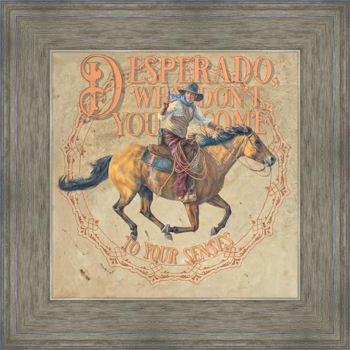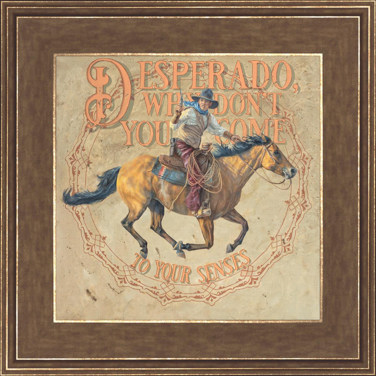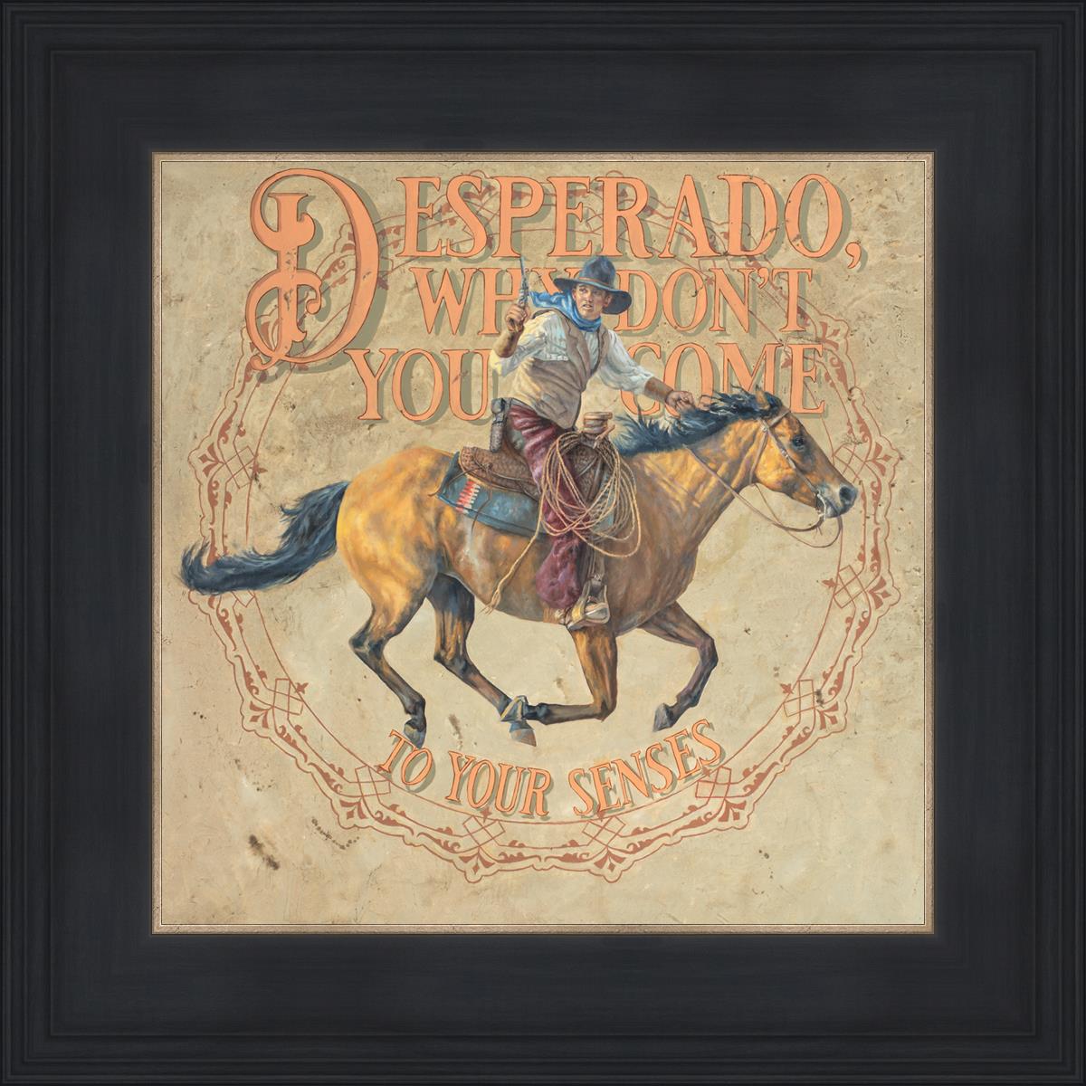 Desperado is of course from the Eagles song ||Desperado||. The first line is ||Desperado why dont you come to your senses|| where we have the Young Outlaw thats running from the law. My hope is that it brings back memories for people that remember that song and it puts a smile on their face. Who said Fine Art cant make us smile?