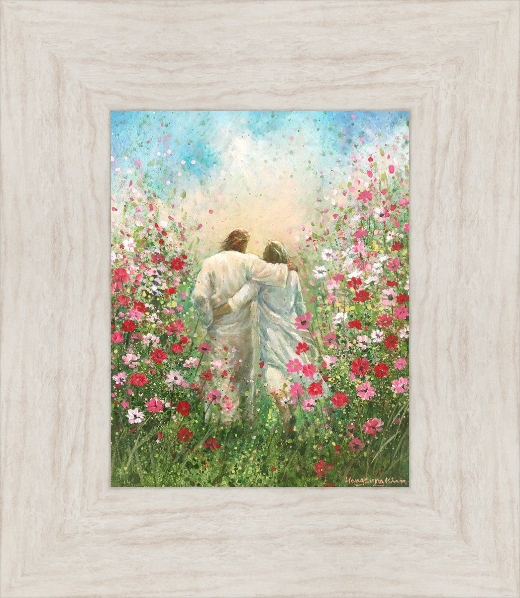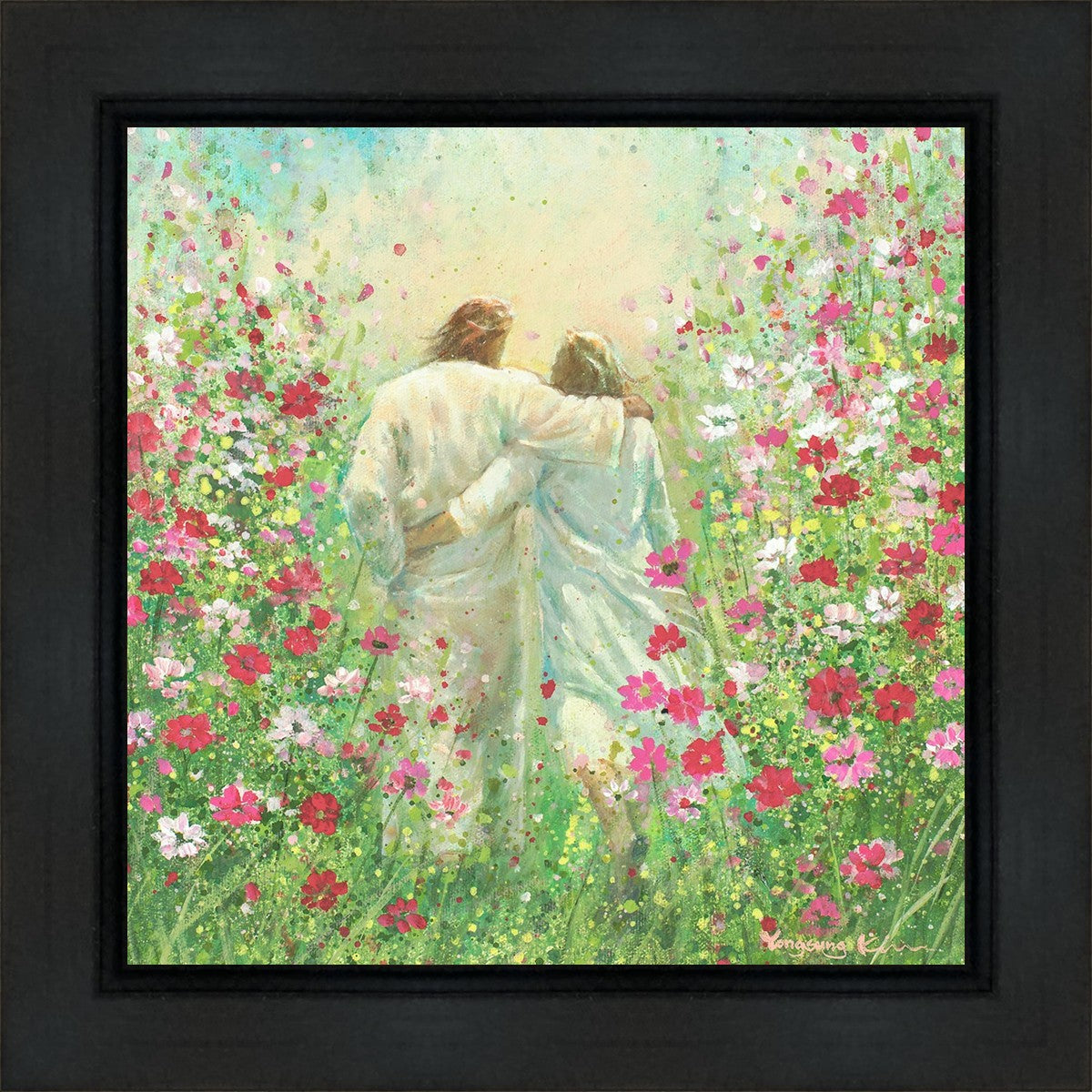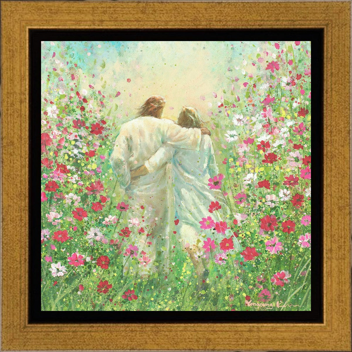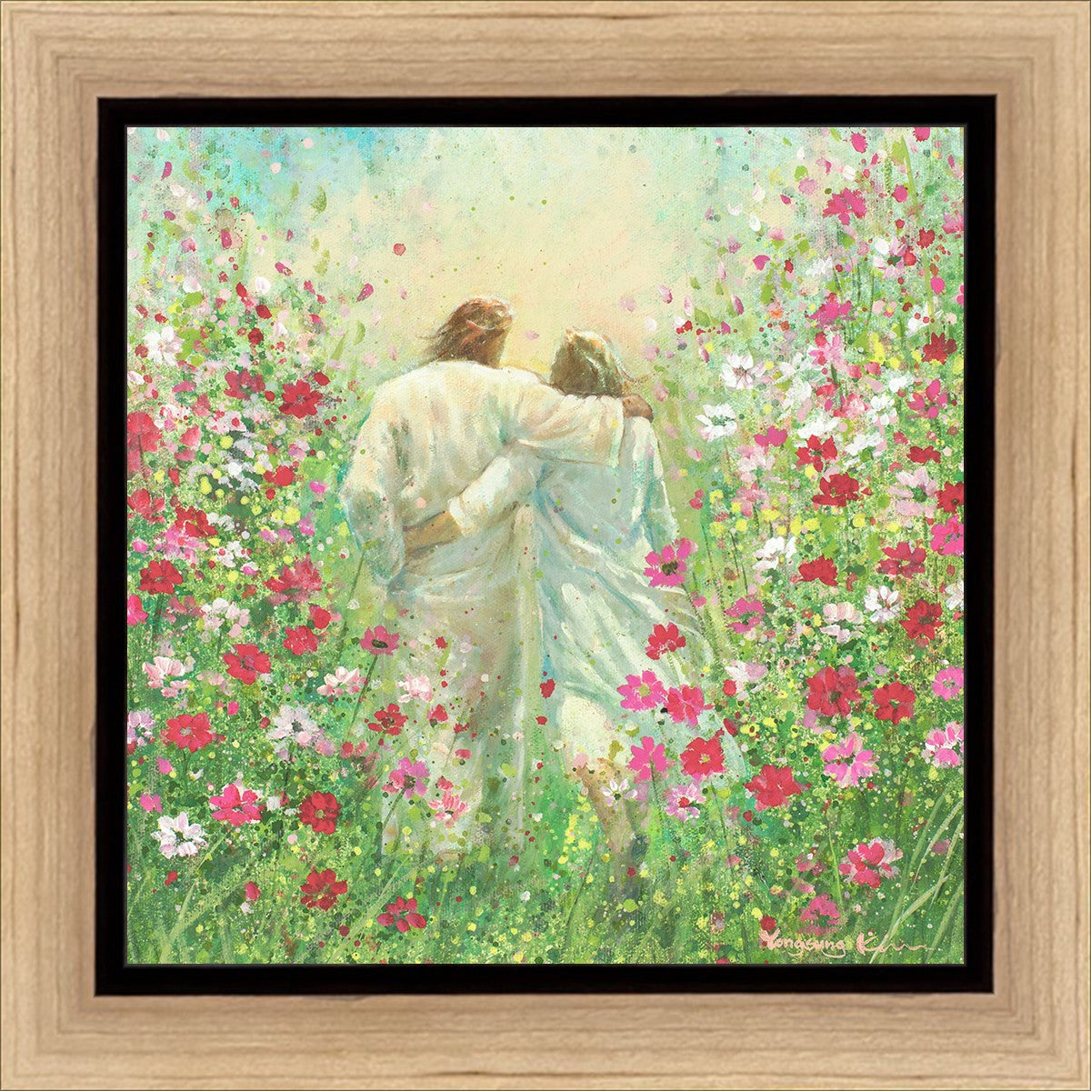 "Divine Companion" by Yongsung Kim portrays Jesus Christ offering guidance to a follower in a vibrant field of flowers. This piece captures the essence of faith, guidance, and the beauty of walking with Christ.