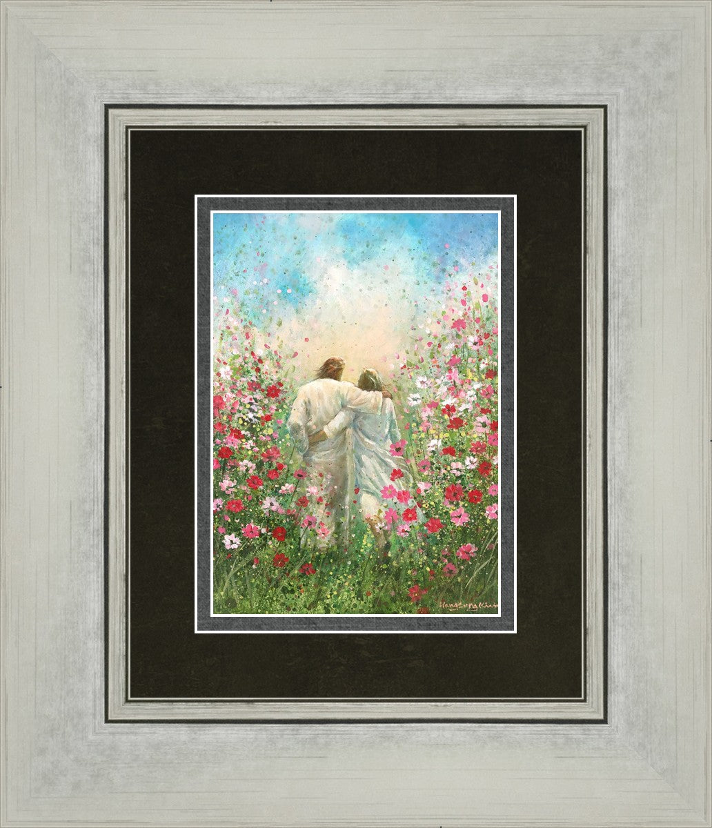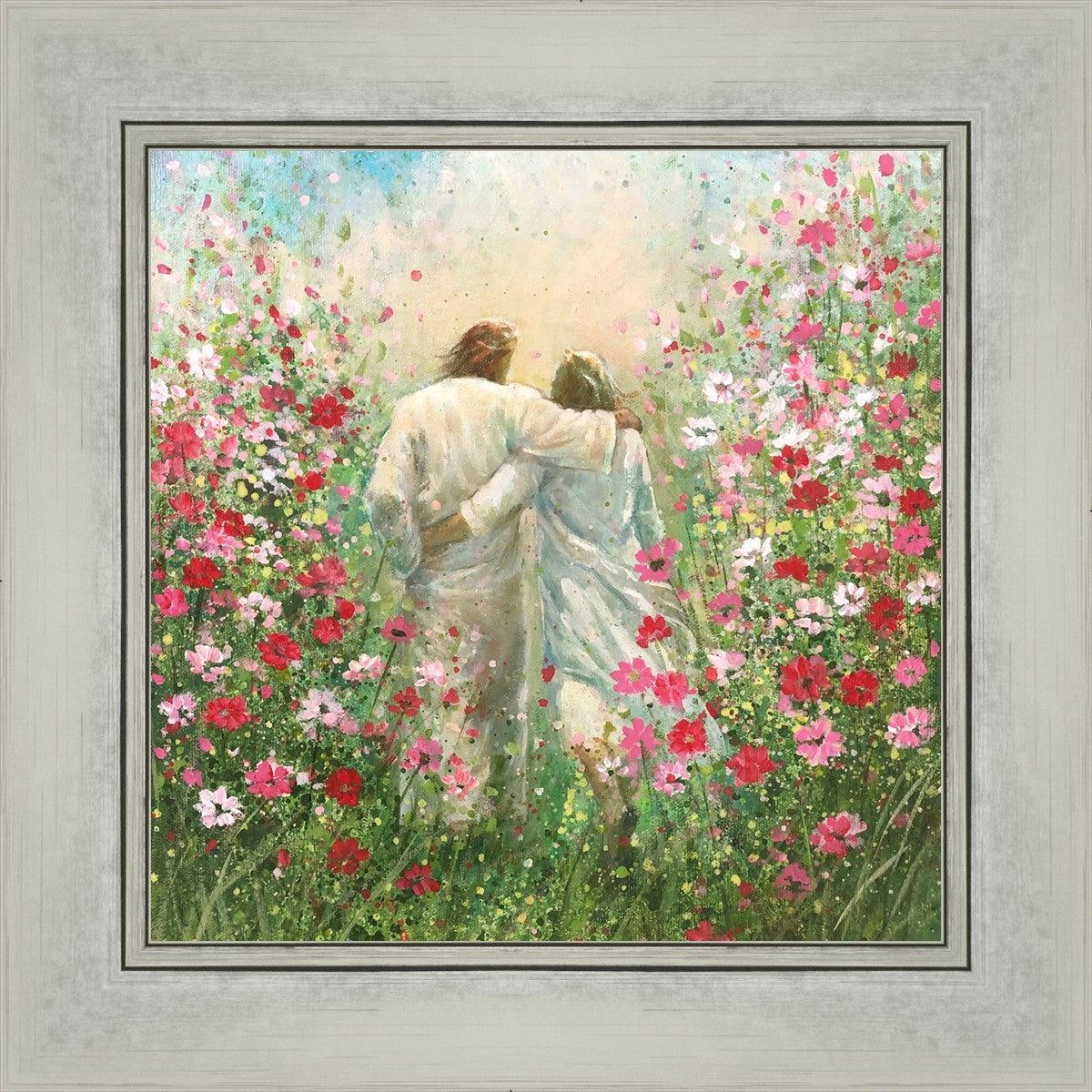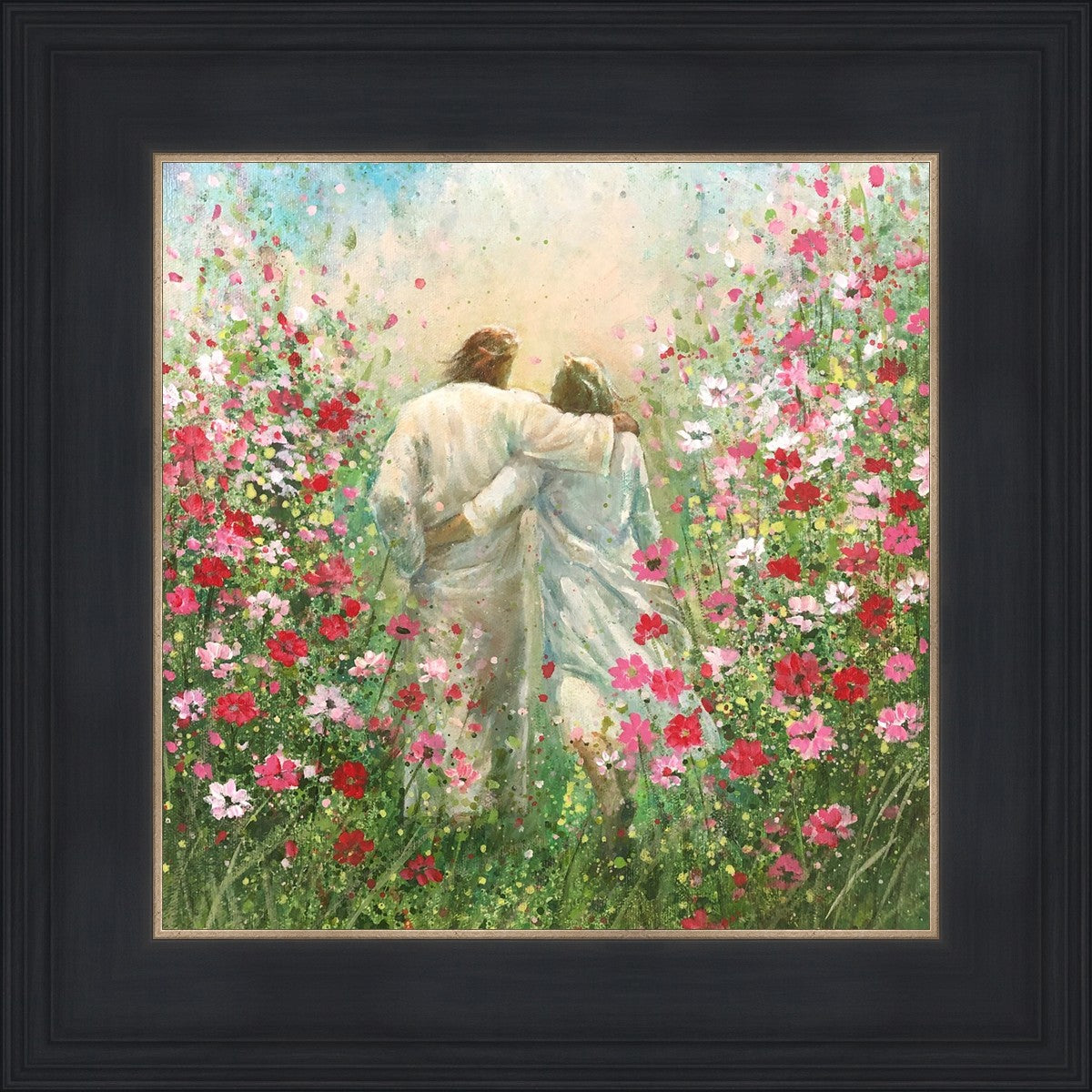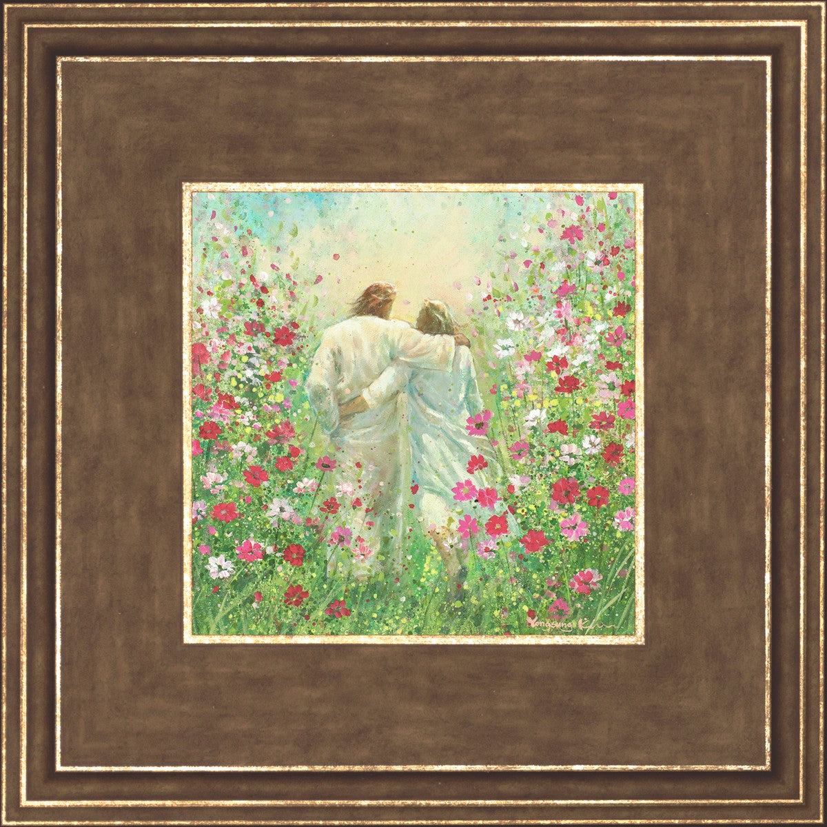 "Divine Companion" by Yongsung Kim portrays Jesus Christ offering guidance to a follower in a vibrant field of flowers. This piece captures the essence of faith, guidance, and the beauty of walking with Christ.