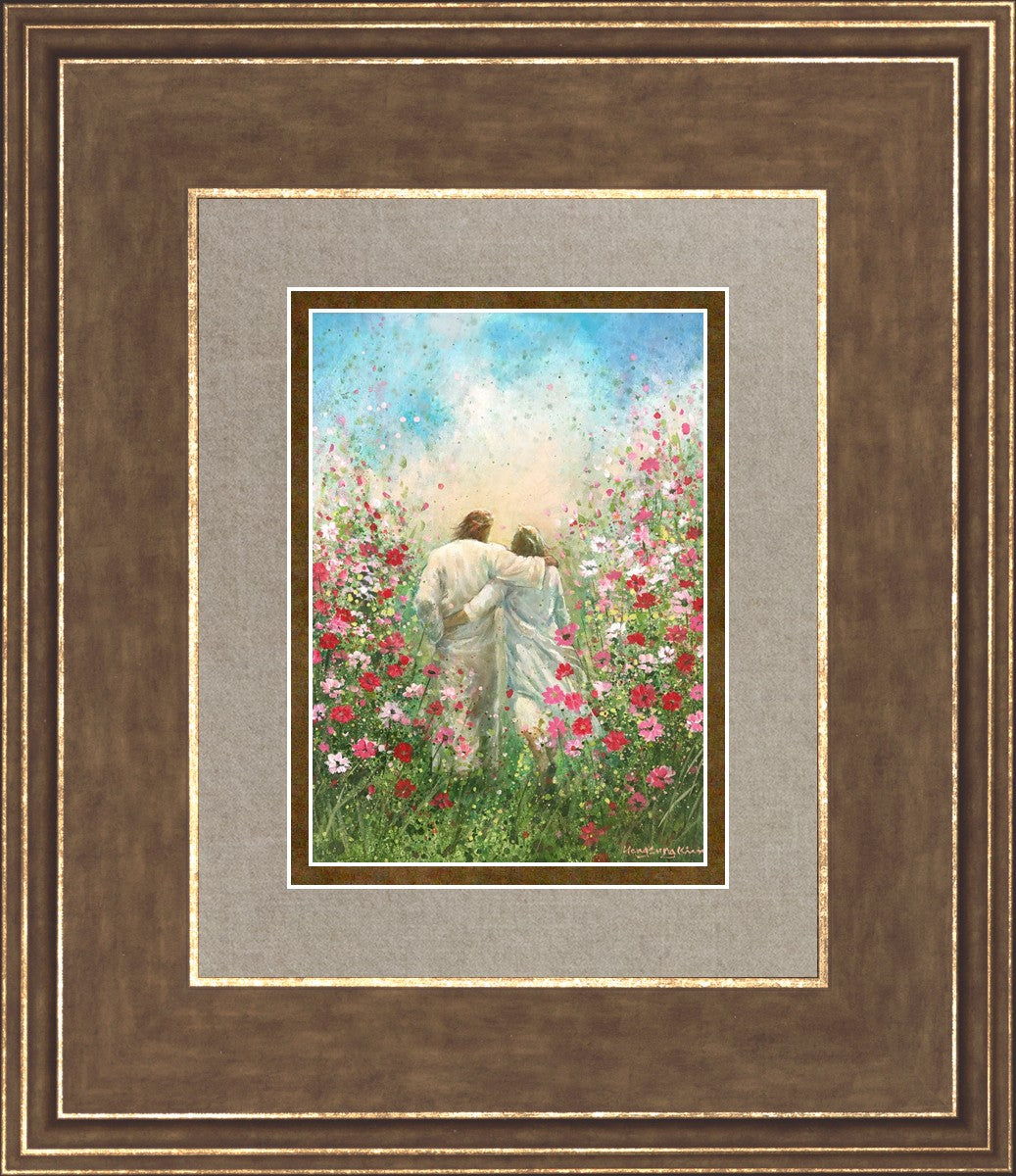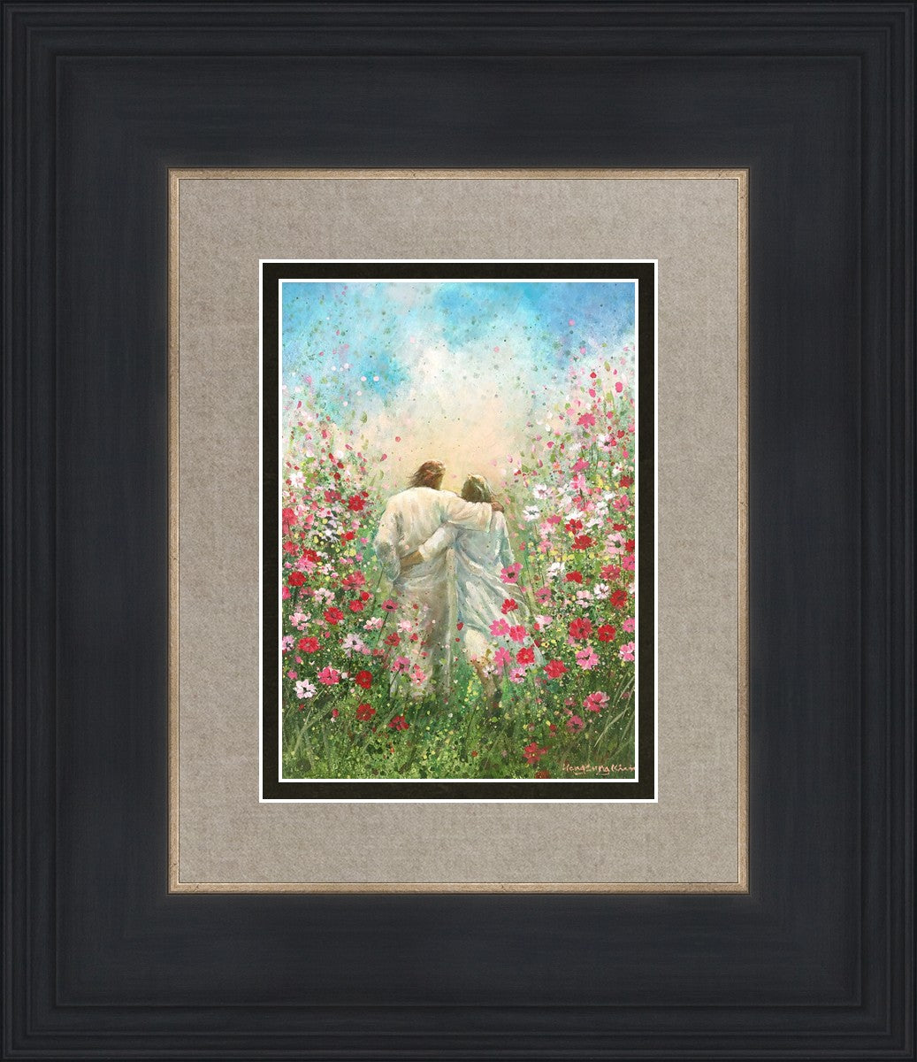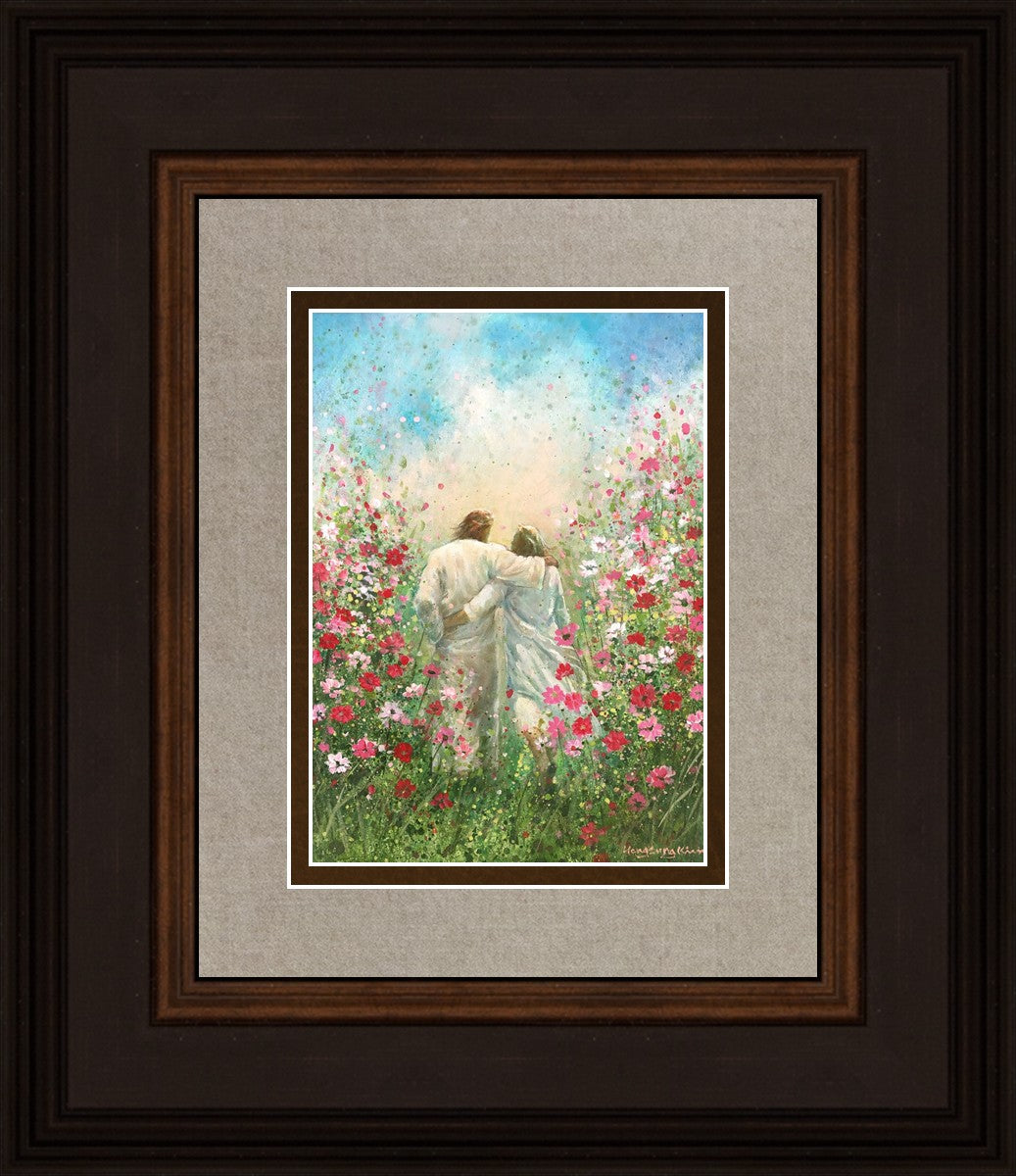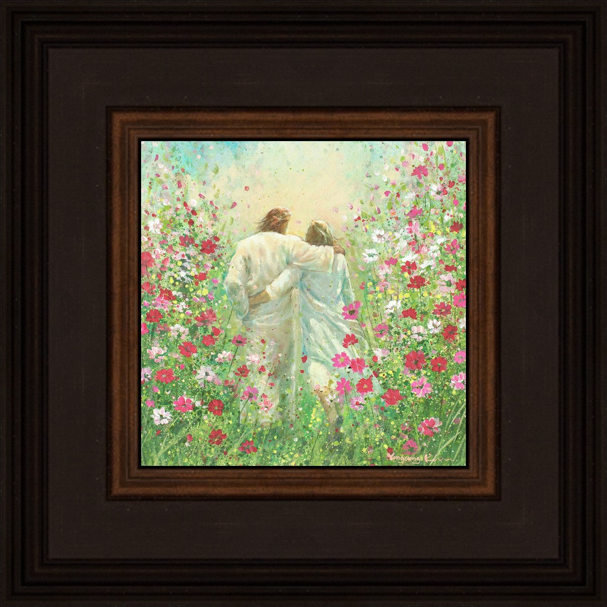 "Divine Companion" by Yongsung Kim portrays Jesus Christ offering guidance to a follower in a vibrant field of flowers. This piece captures the essence of faith, guidance, and the beauty of walking with Christ.